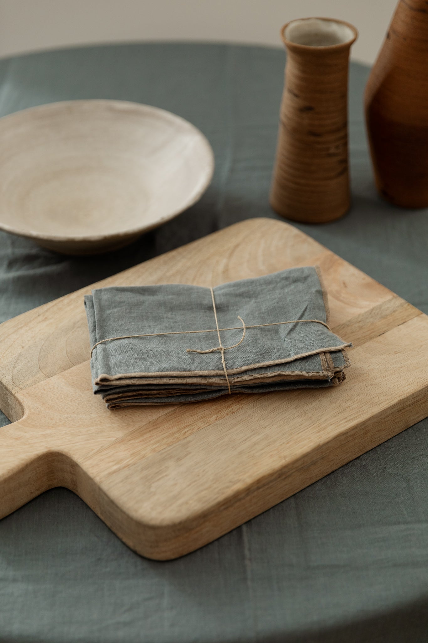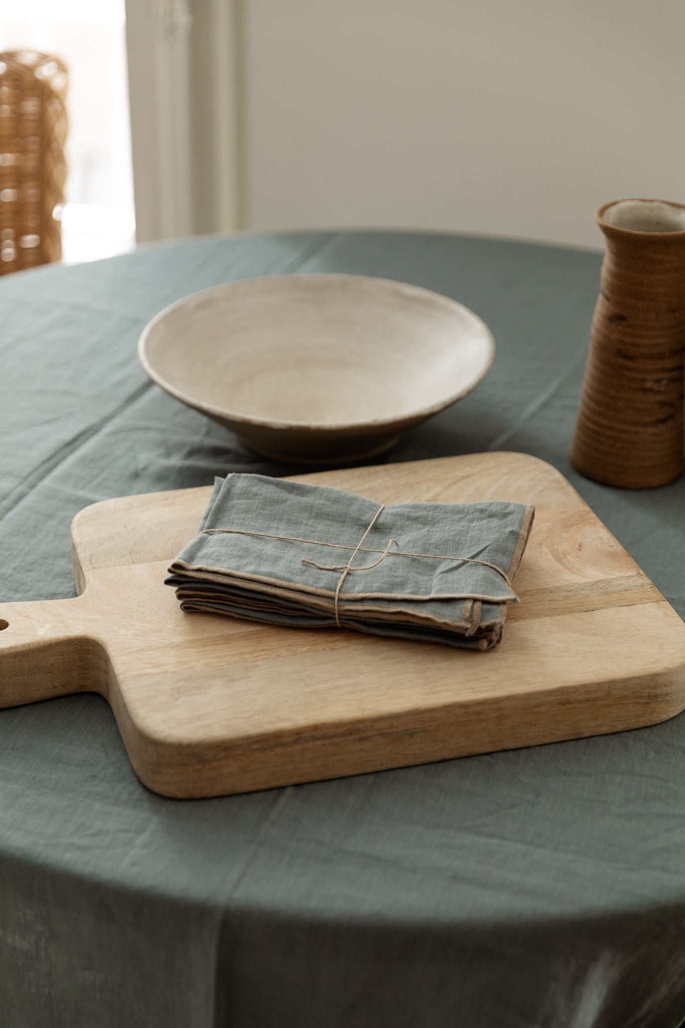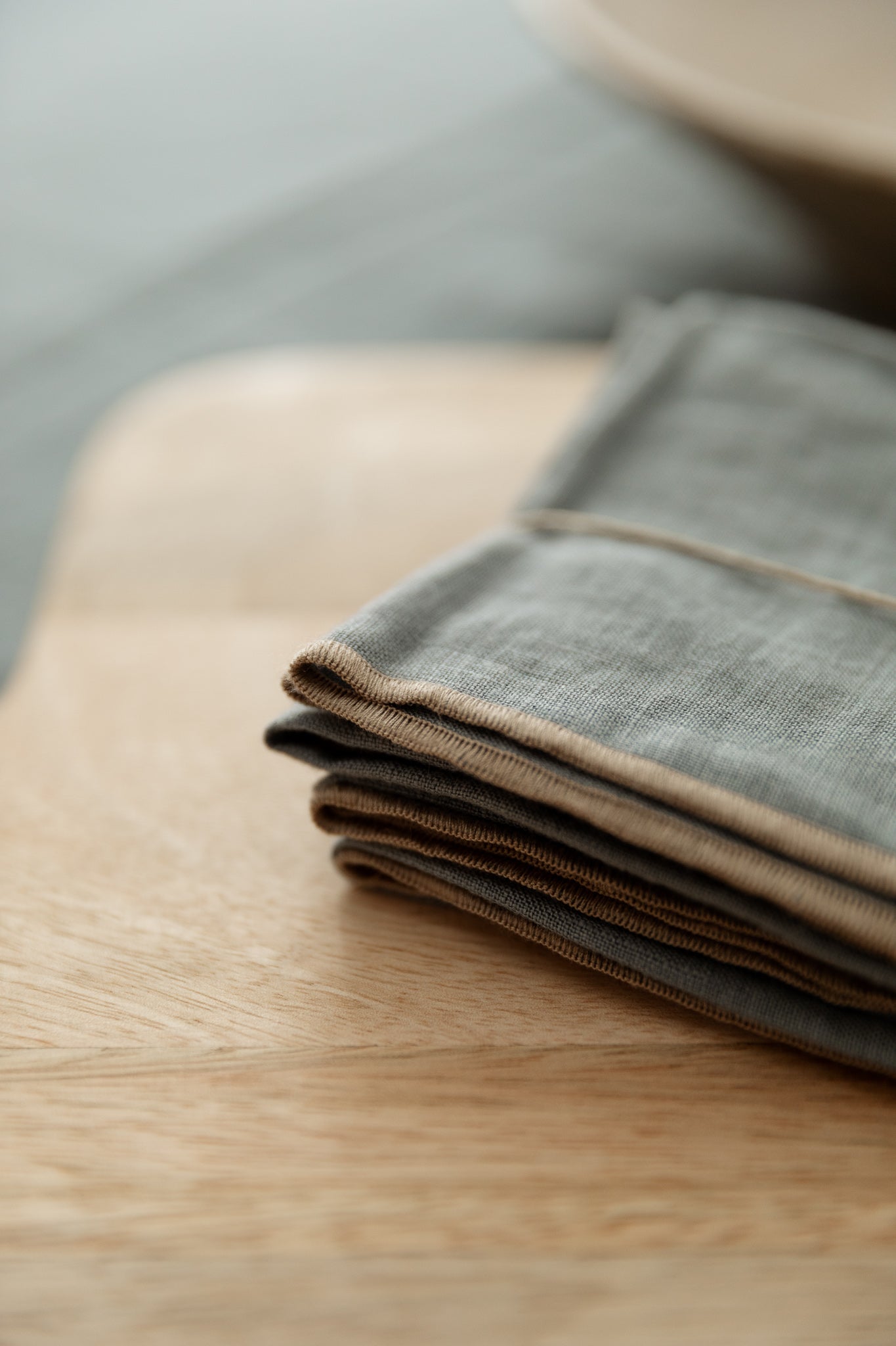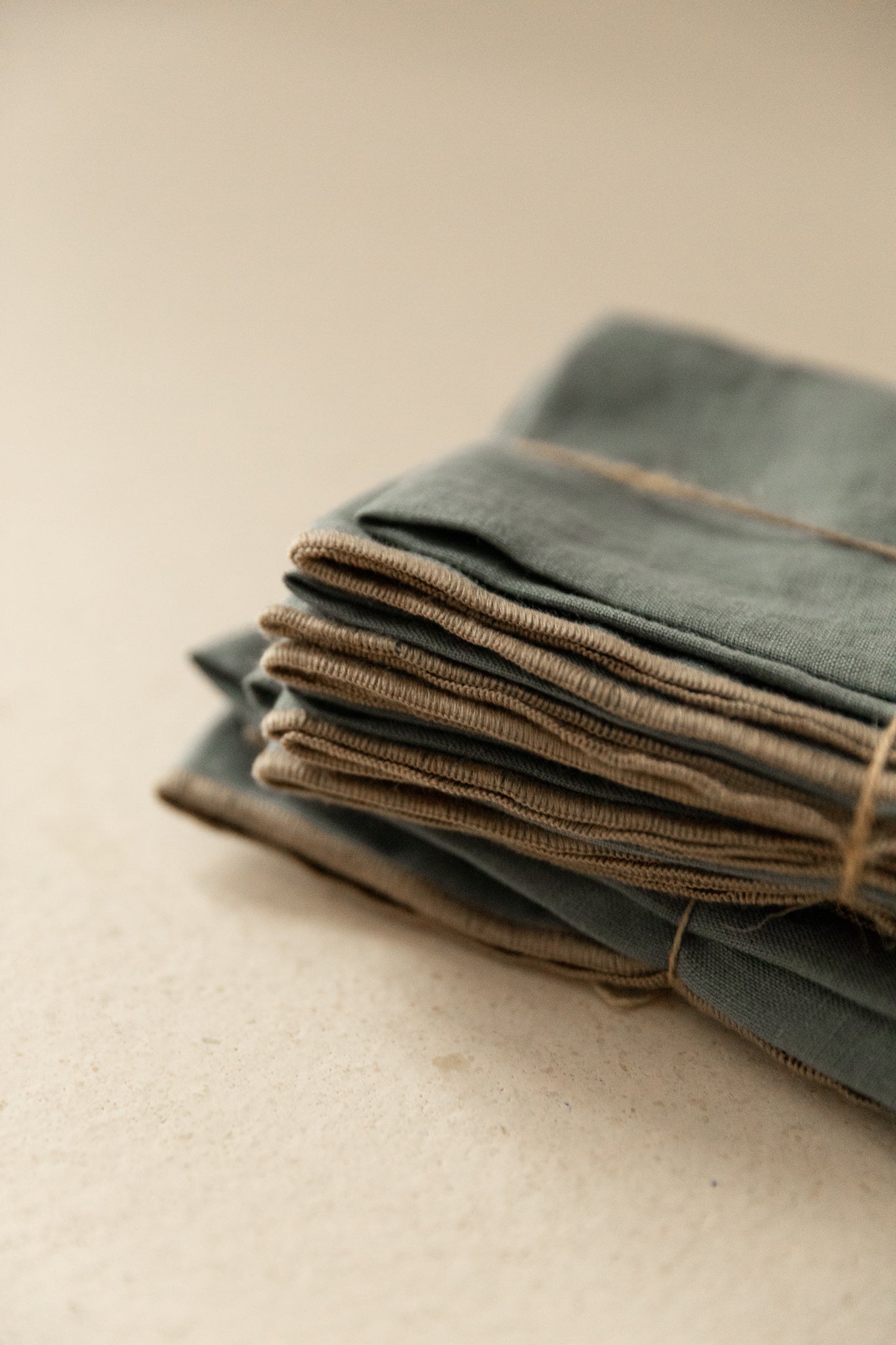 Servilleta elaborada artesanalmente en España con lino 100% natural de color azul y un delicado repulgo en tono beige. Nuestro lino cuenta con la certificación OEKO-TEX® Standard 100 (certificado nº 2021OK068), que garantiza un proceso textil respetuoso con las personas y el entorno.