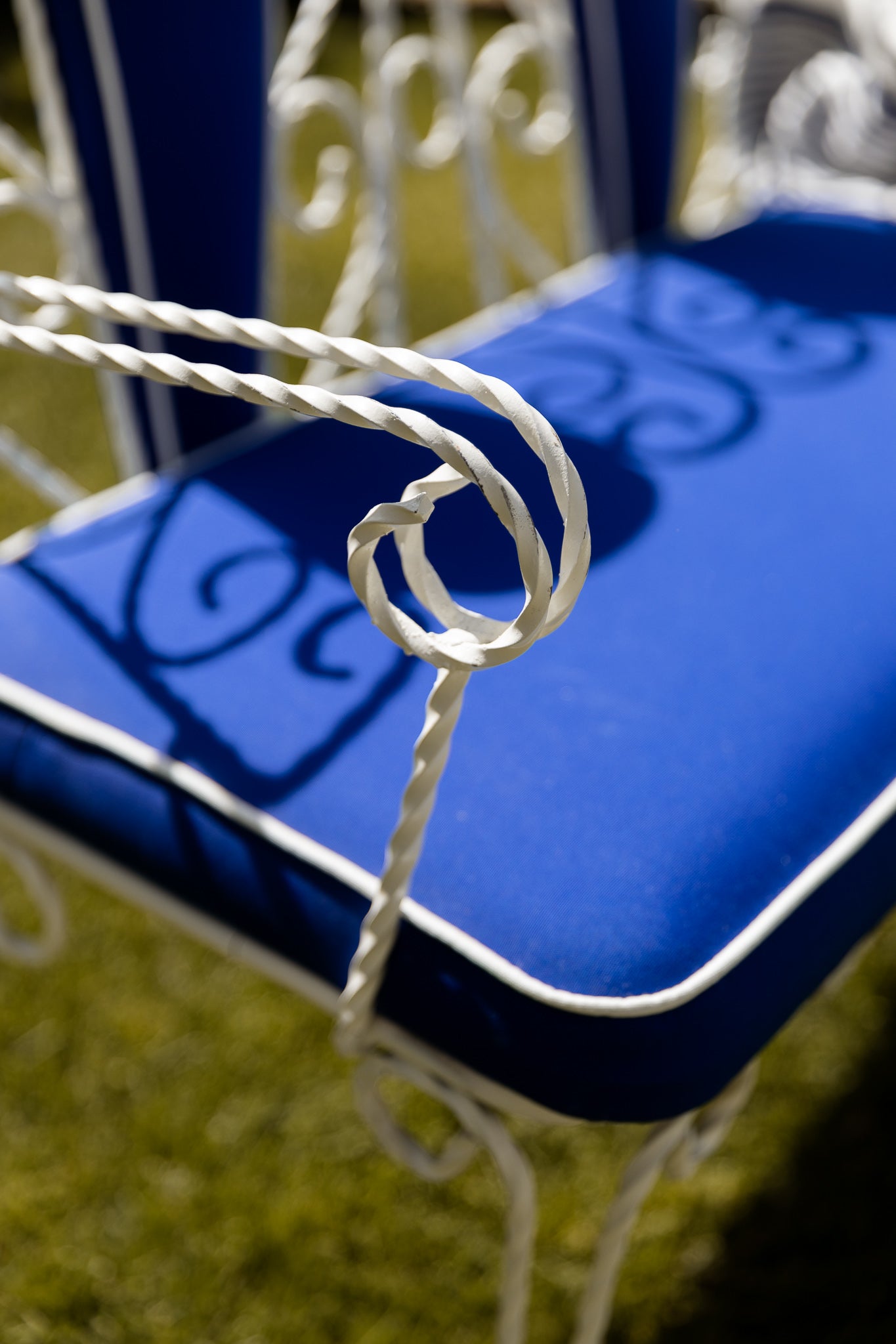Banco de origen francés de los años 70, con estructura de hierro lacado en color blanco y asiento tapizado en tela azul con vivo blanco. La combinación de materiales y colores resalta su diseño geométrico y equilibrado, propio del mobiliario decorativo de mediados del siglo XX.