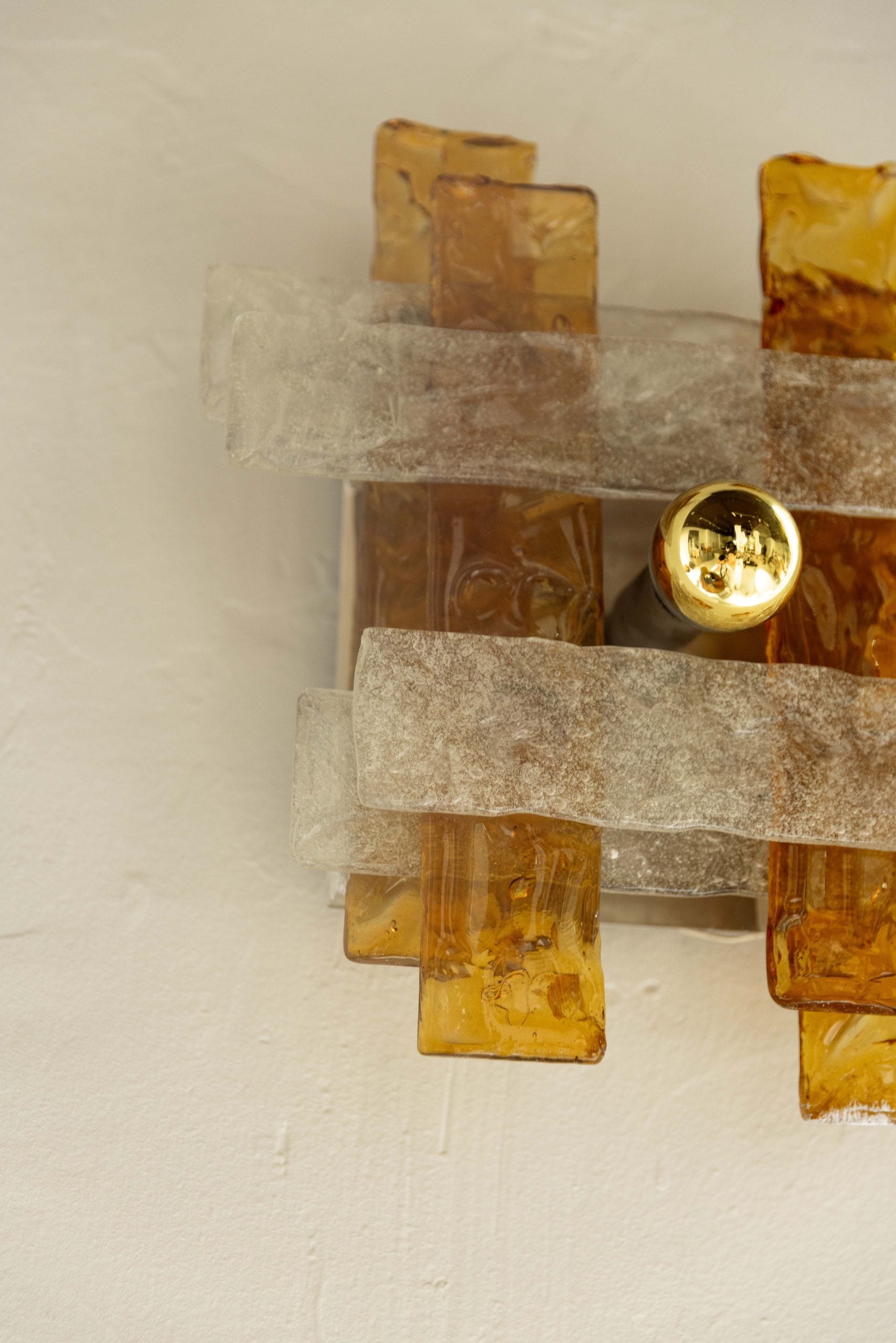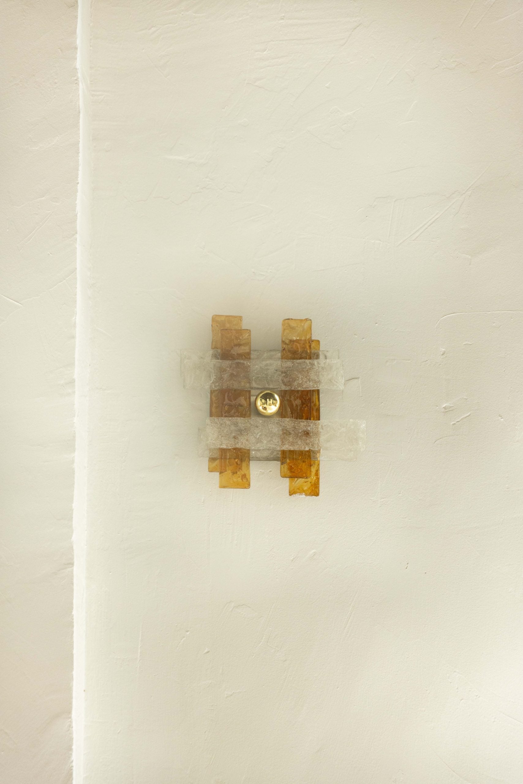 Pareja de apliques de origen italiano, fabricados a mano en los años 70 en vidrio de Murano texturizado, combinando tonos ámbar y transparente con detalles en latón.