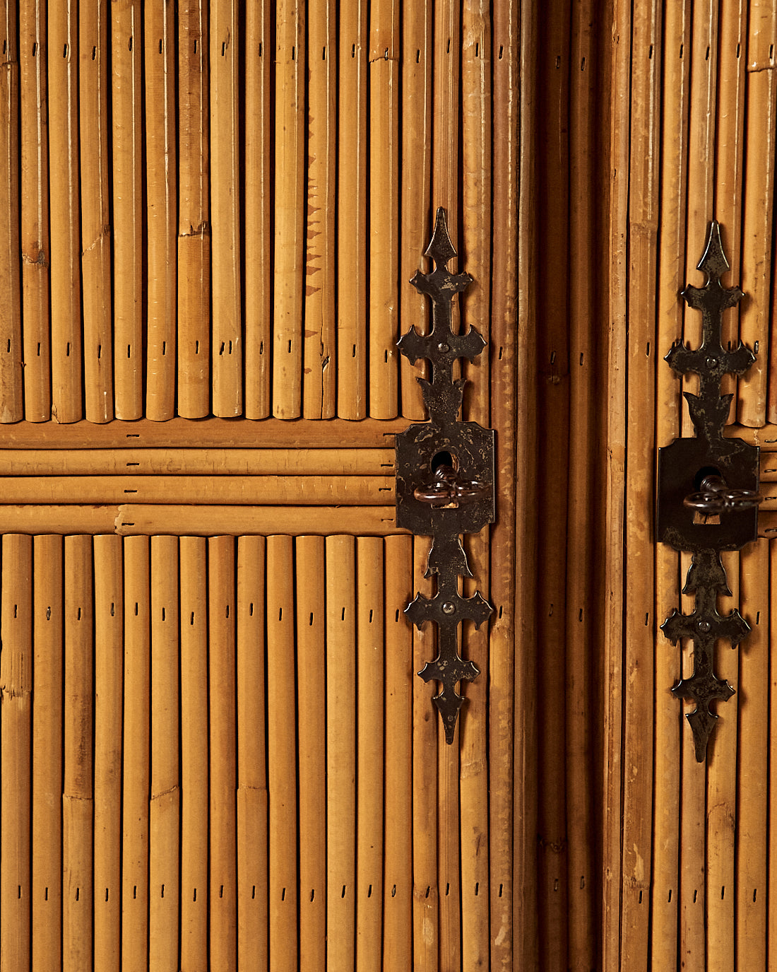 La estructura está realizada íntegramente en bambú, ensamblado mediante técnicas artesanales propias del periodo. La pieza cuenta con herrajes forjados a mano y puertas con cerradura. El interior se organiza mediante tres estantes y un compartimento de armario de doble nivel, concebido para el almacenaje doméstico.