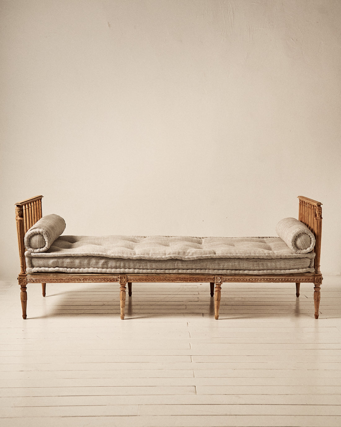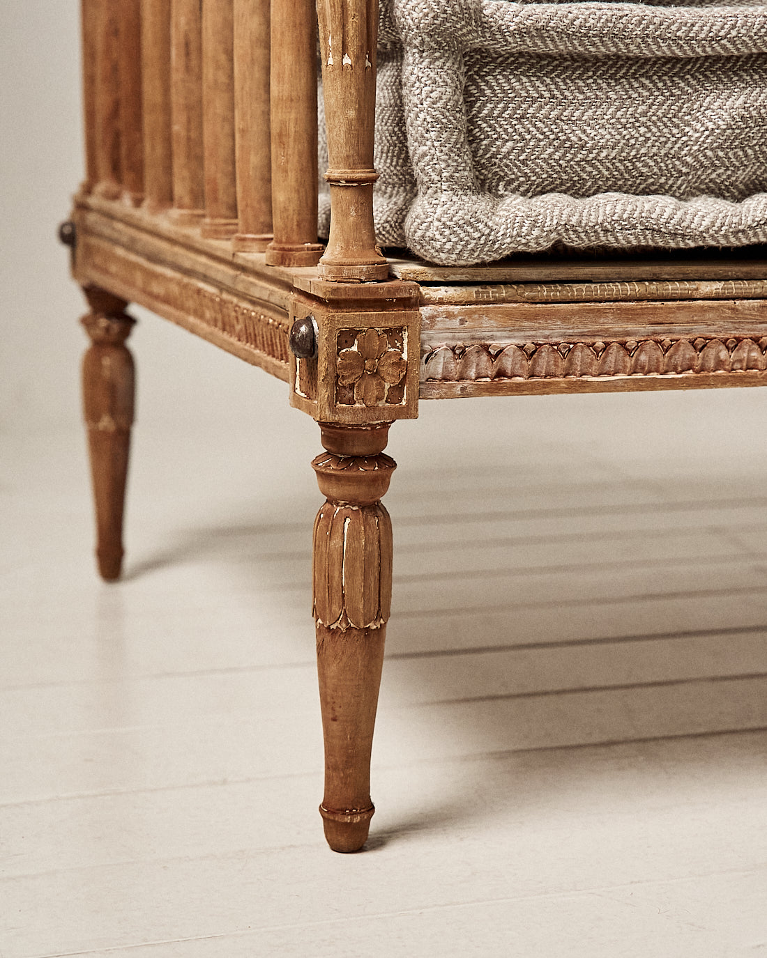 Estructura de madera tallada a mano, con líneas elegantes, patas estriadas y una ornamentación delicada propia de la época, rematada por laterales en forma de barandales que aportan ligereza y equilibrio; se acompaña de un mullido cojín capitonado en tono neutro que realza su carácter histórico y añade un toque de confort.