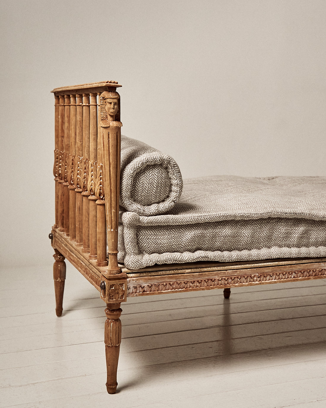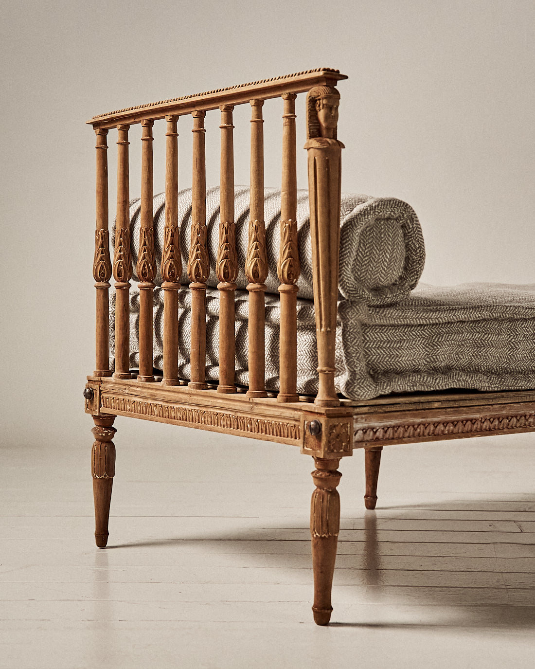 Banco del siglo XIX, elaborado en Suecia durante el periodo del Imperio, influenciado por el estilo Gustaviano tardío y por la estética neoclásica del “Retorno de Egipto”, inspirada en la fascinación europea por el arte y la arquitectura egipcia tras las campañas napoleónicas.