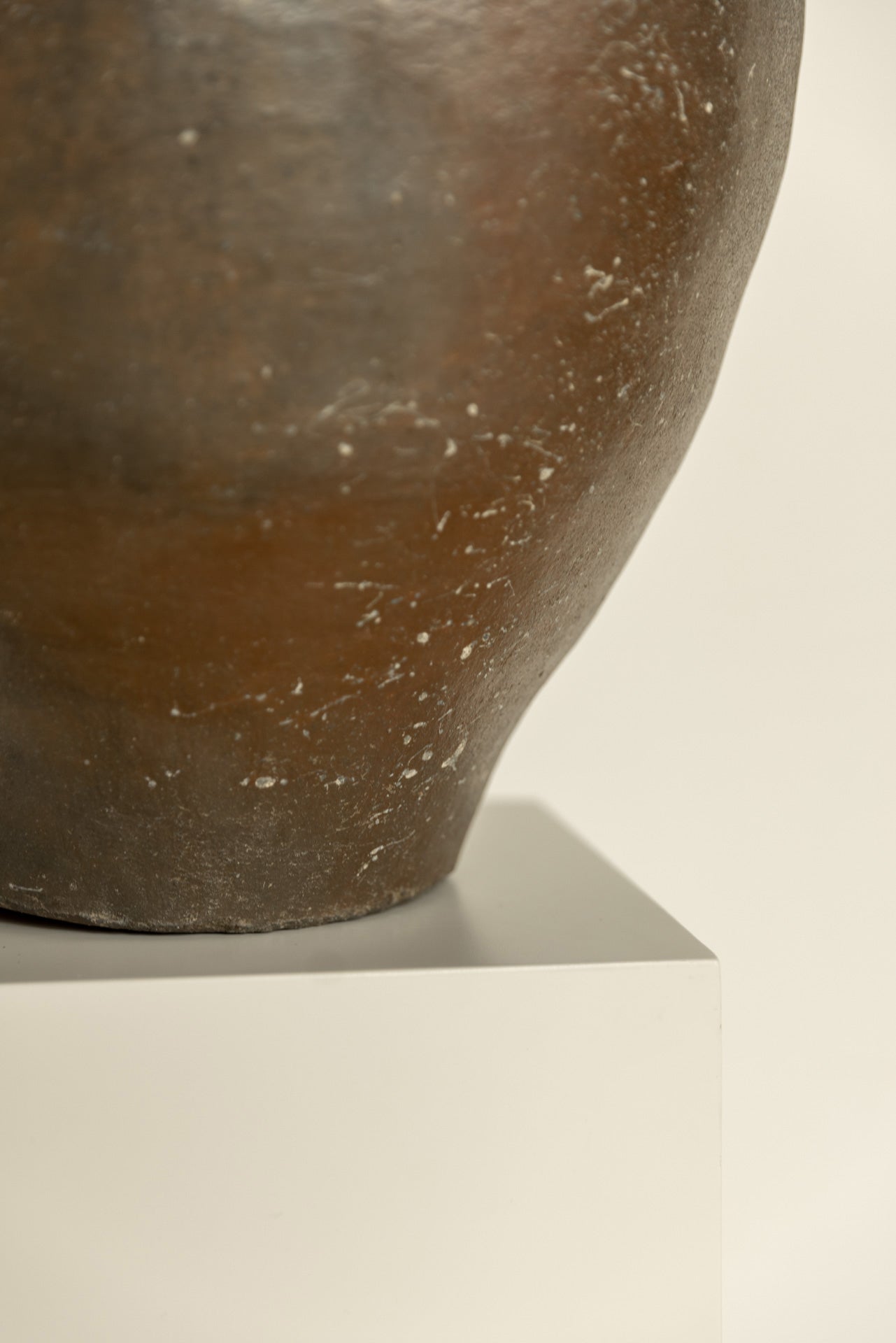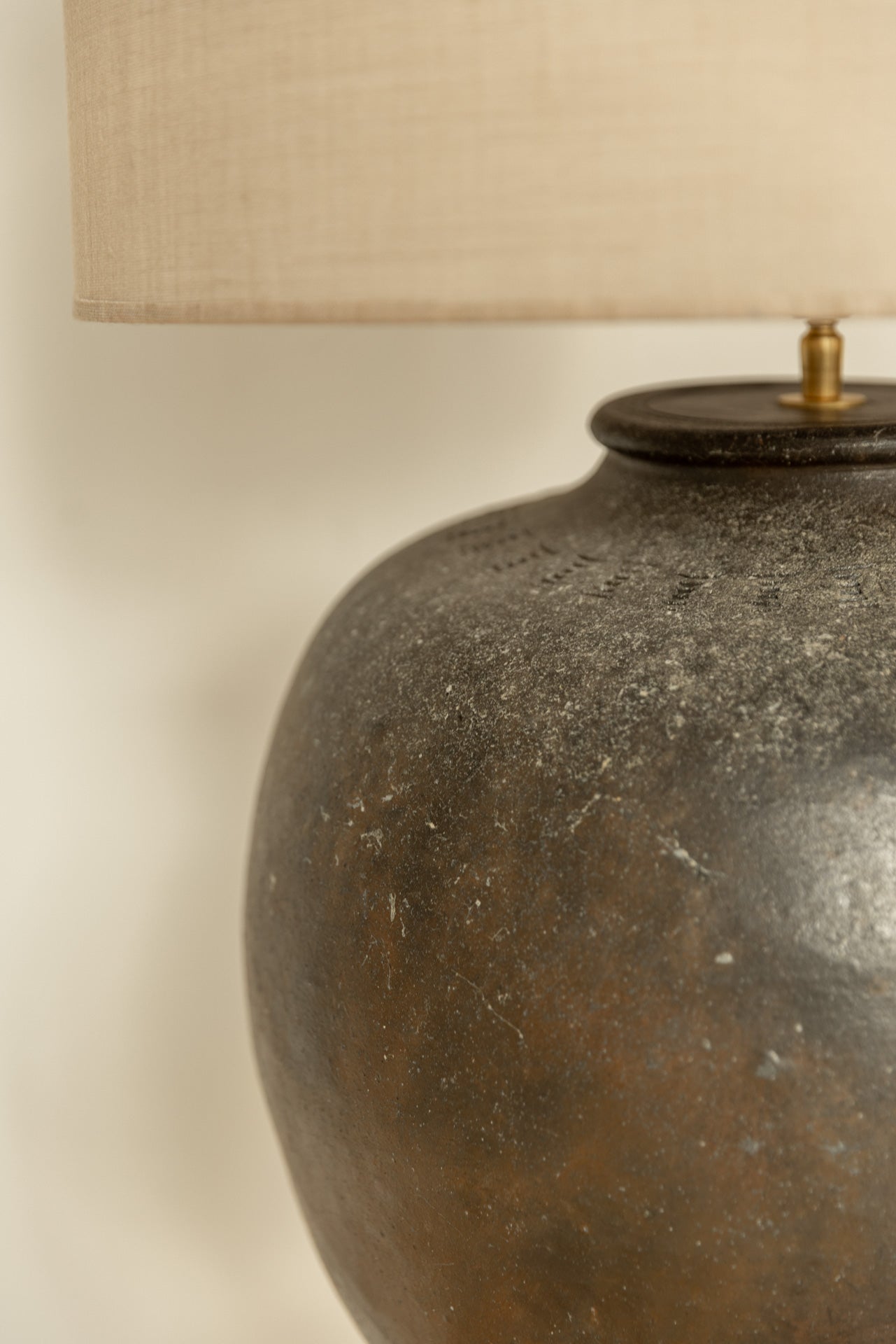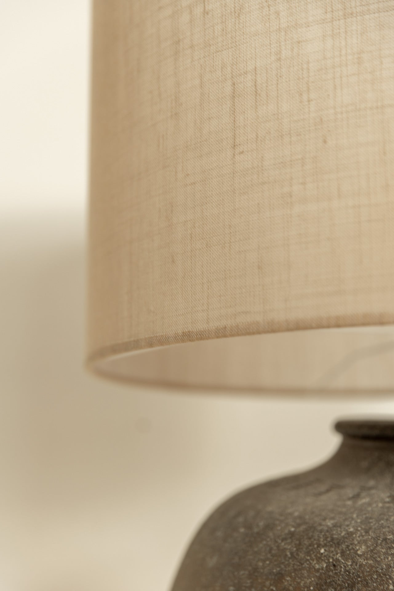 Base de lámpara hecha de cerámica artesanal, con un esmalte en tonos marrón y beige que resalta las variaciones naturales del material y aporta calidez visual. Las transiciones de color, fruto del proceso manual de esmaltado, hacen que cada pieza sea única.