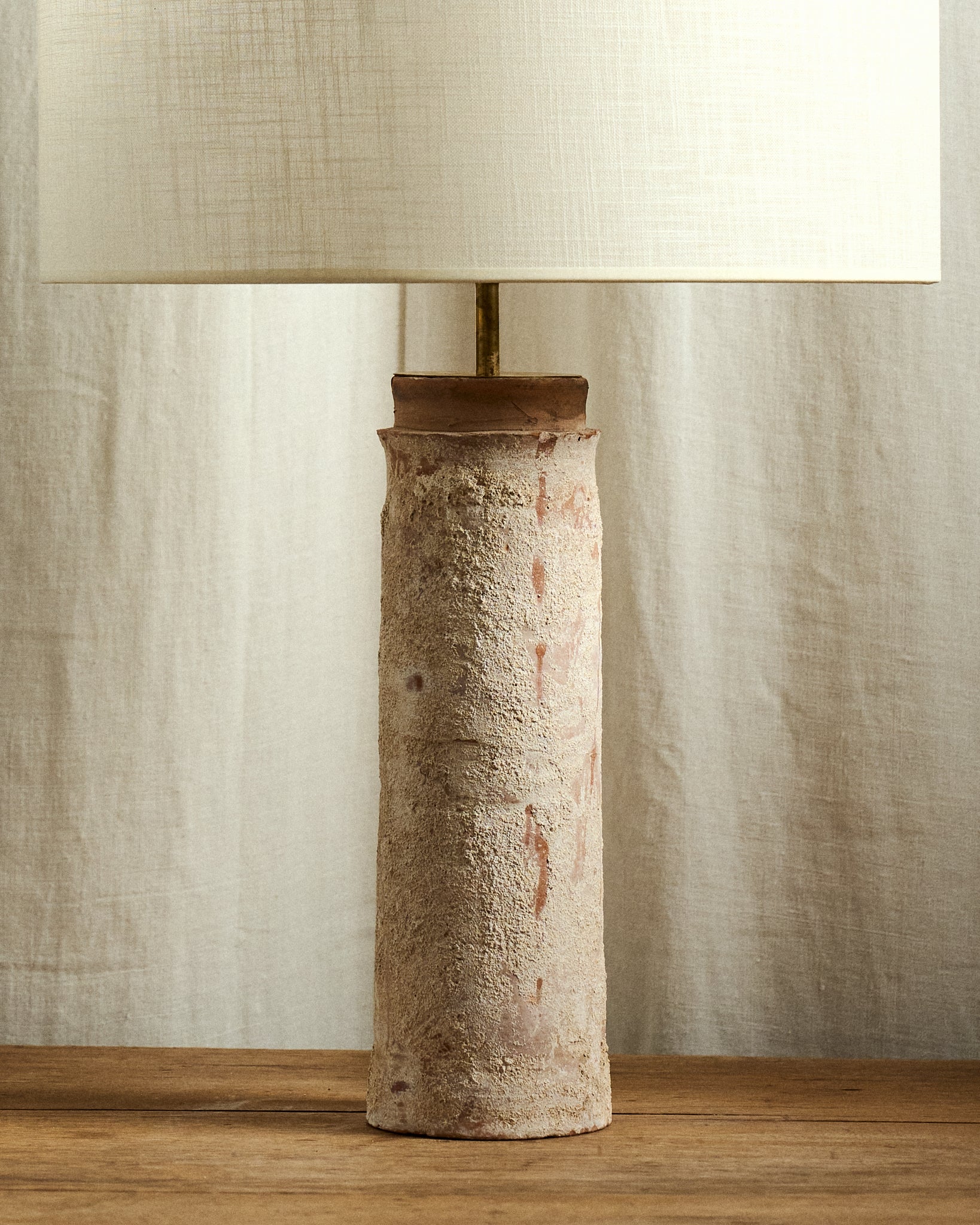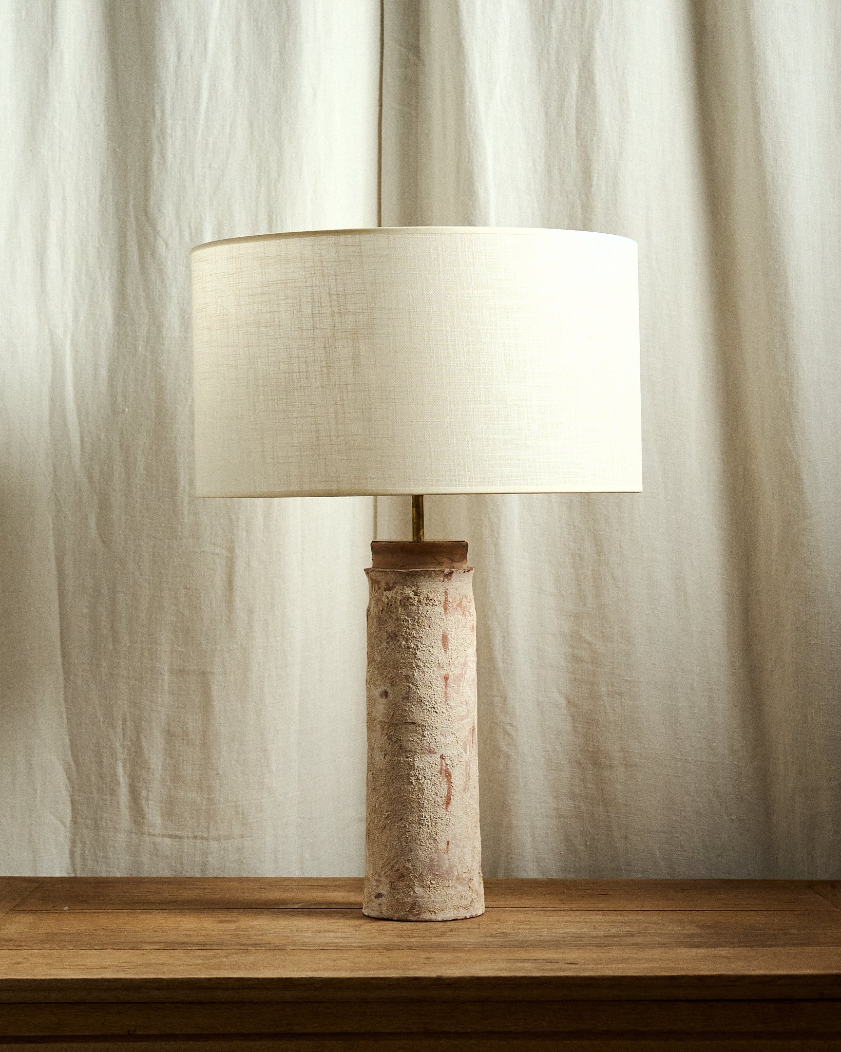 Base de lámpara realizada en terracota con pátina original, elaborada a partir de un antiguo canalón recuperado. Su forma conserva las irregularidades y marcas propias del tiempo, que revelan el origen y la historia del material.