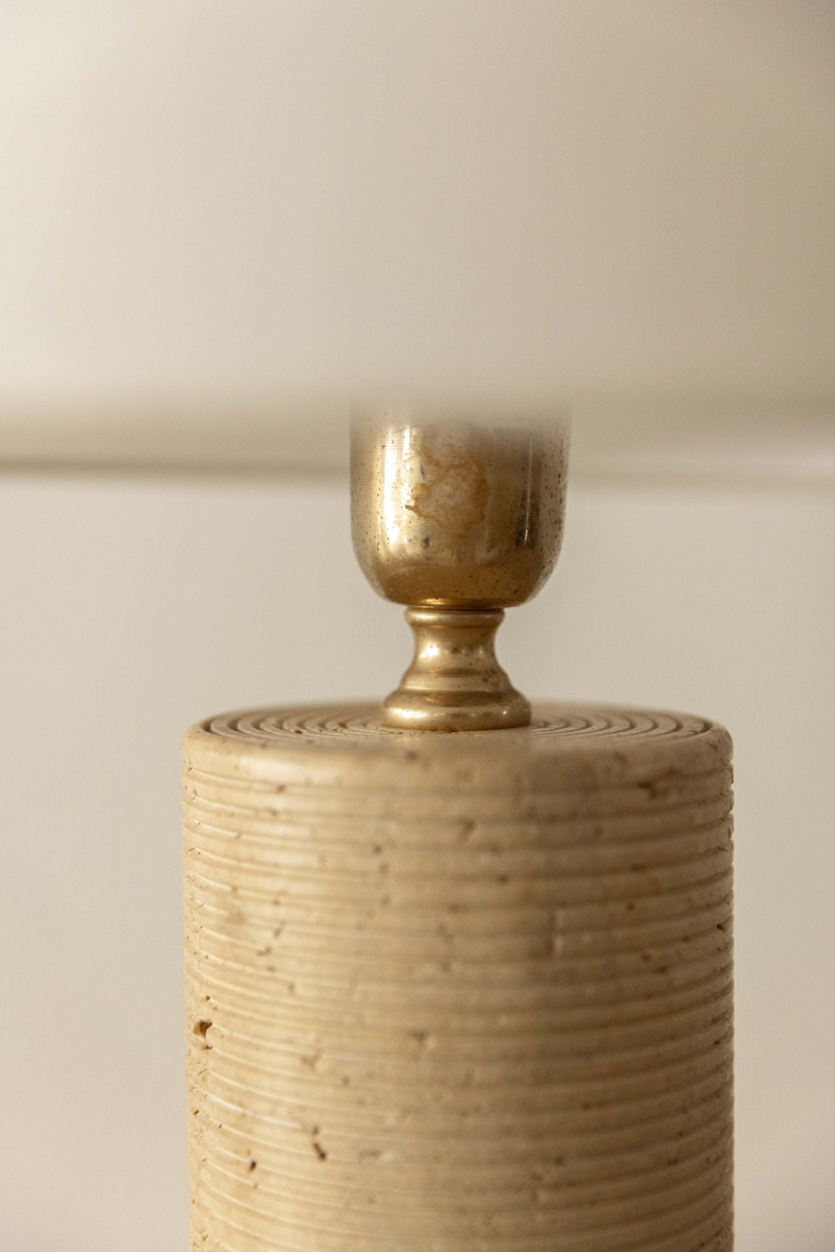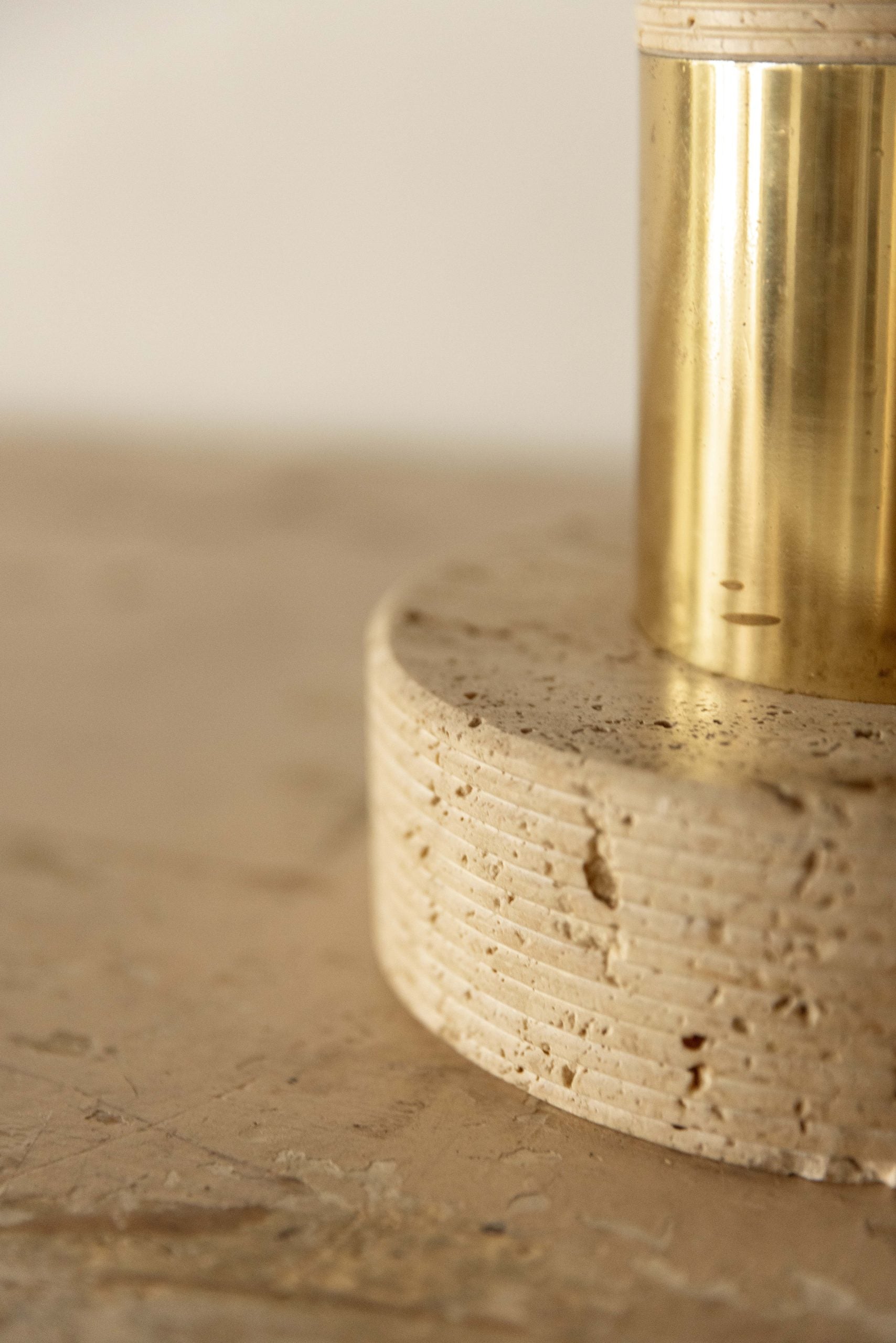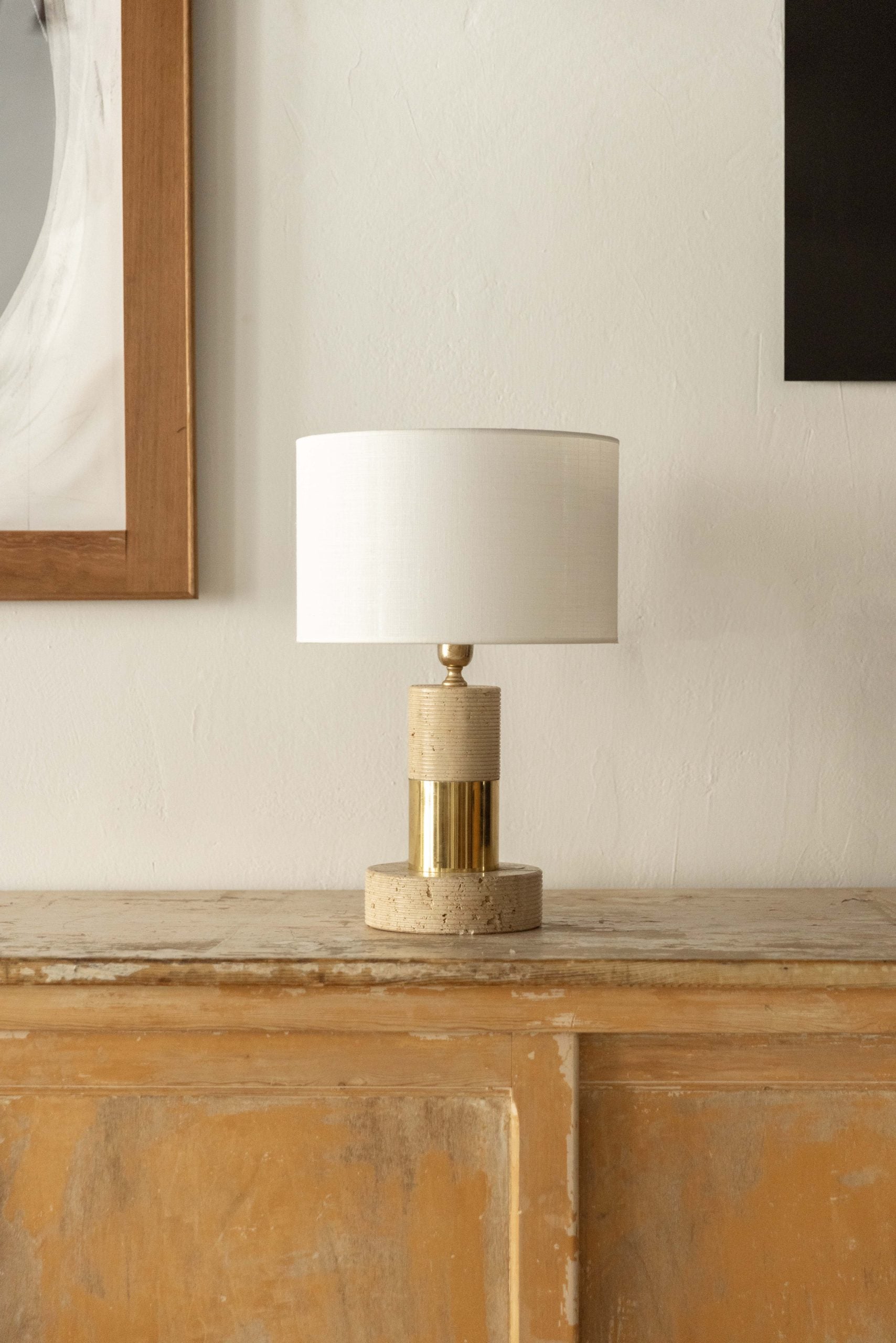 Lámpara de mesa elaborada en mármol travertino, con base redonda y detalles en latón. El diseño enfatiza la pureza de las formas y la materialidad de la piedra, destacando las vetas naturales y la textura porosa característica de la piedra.