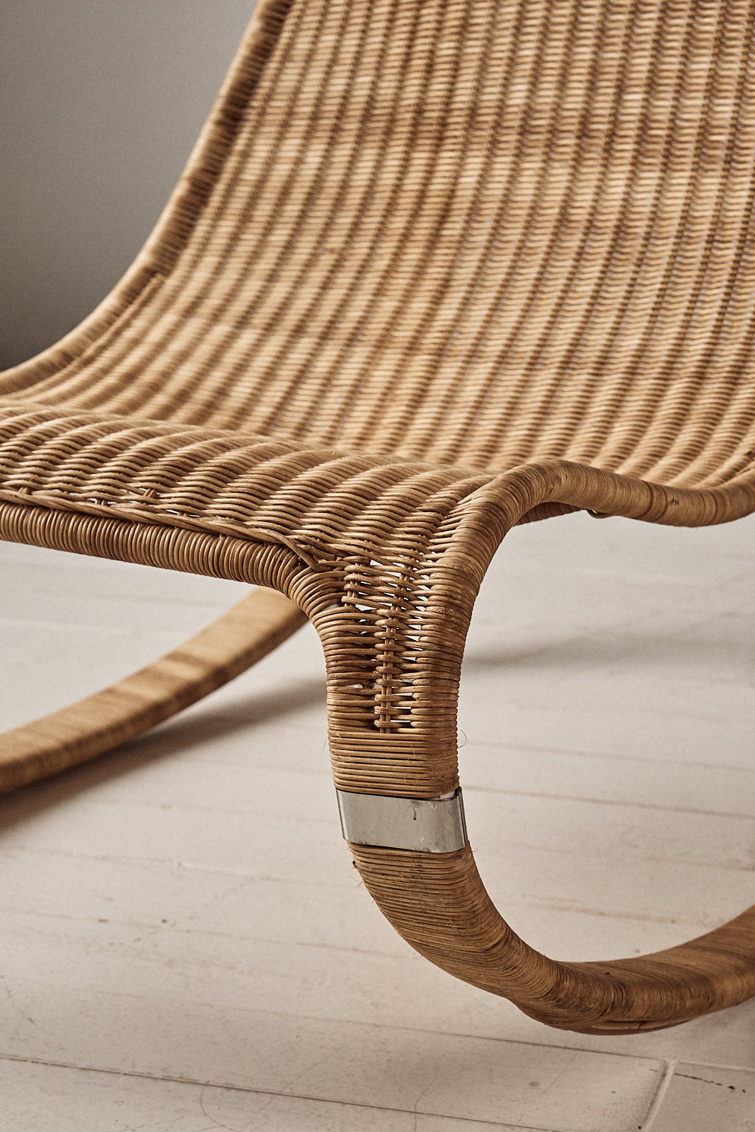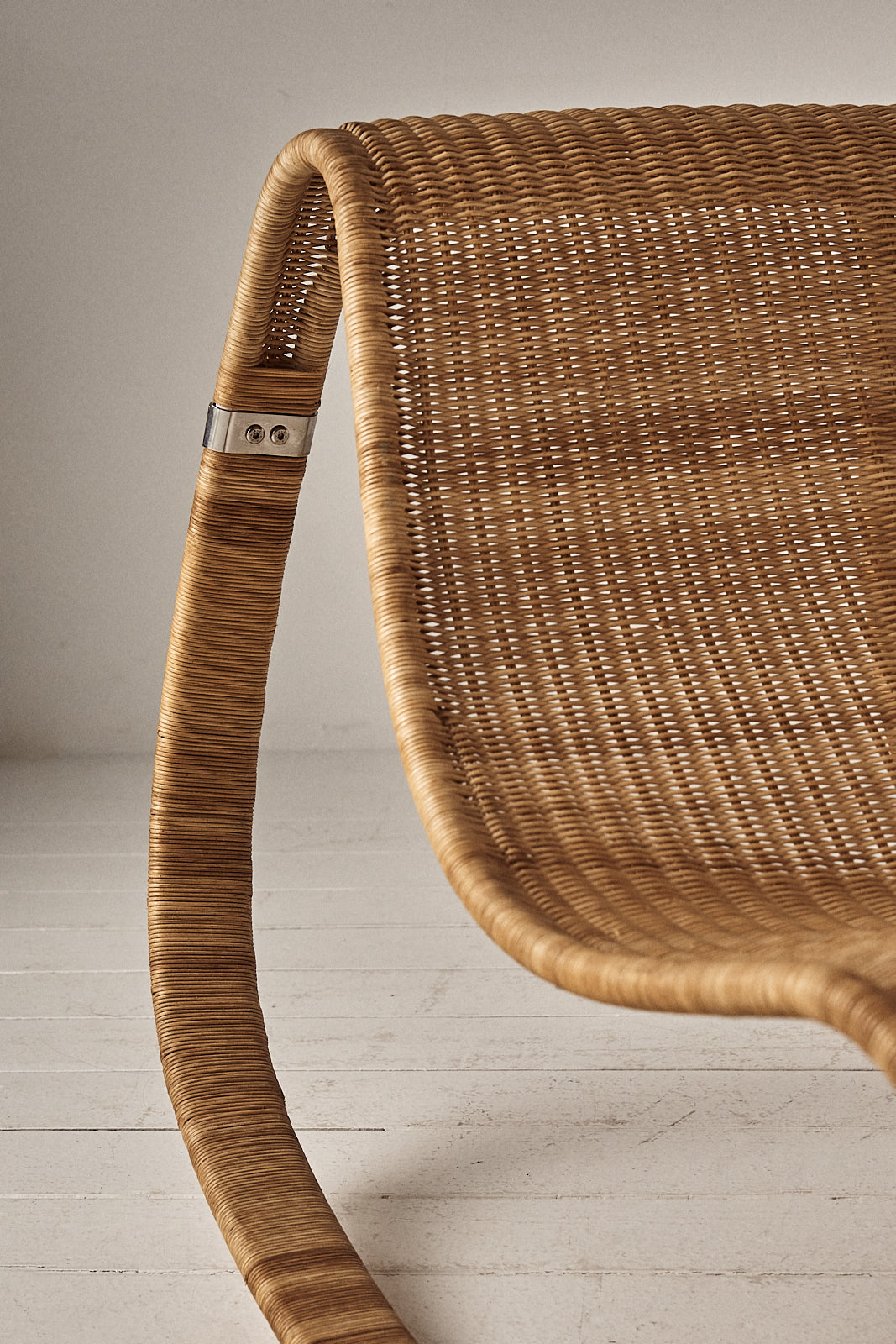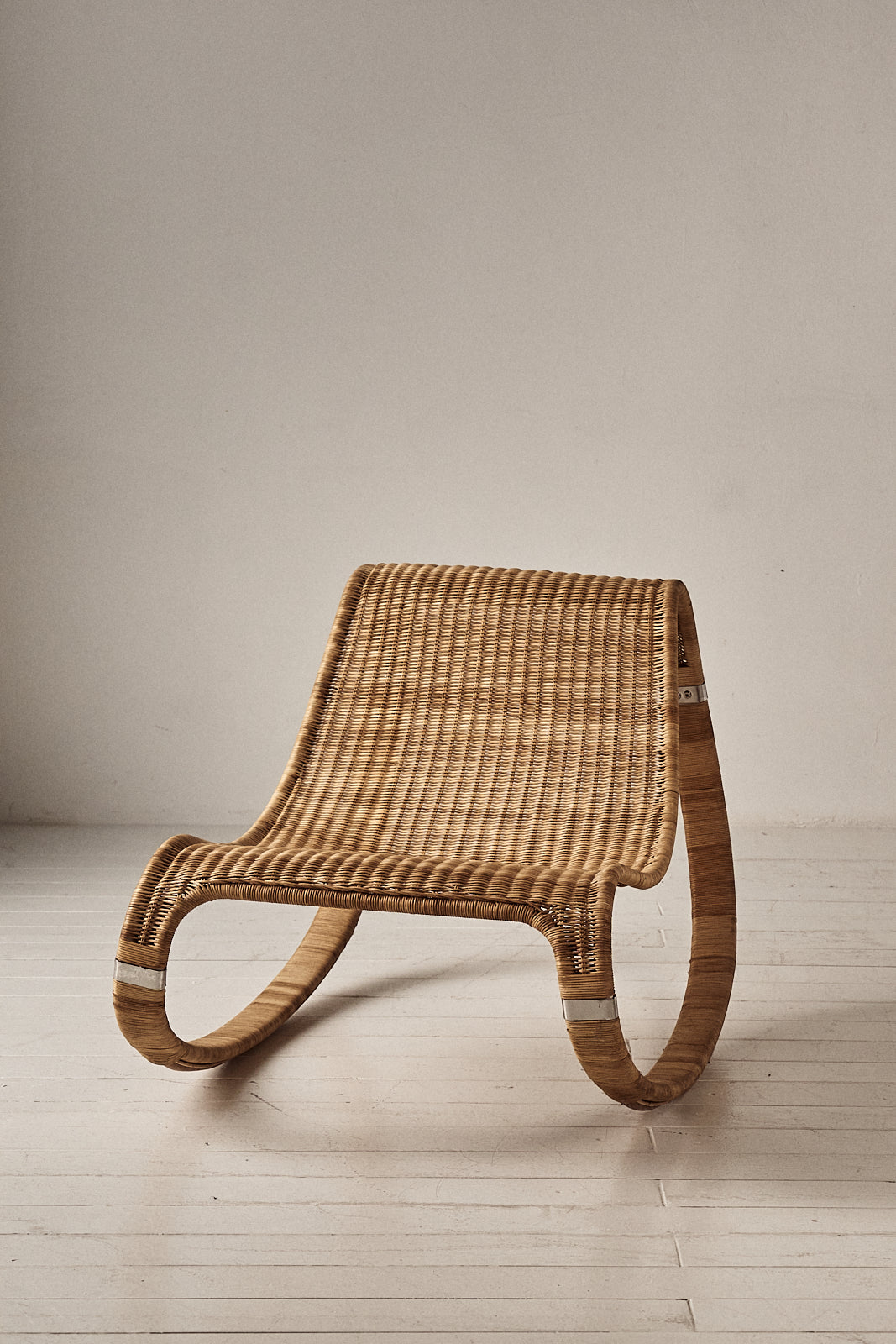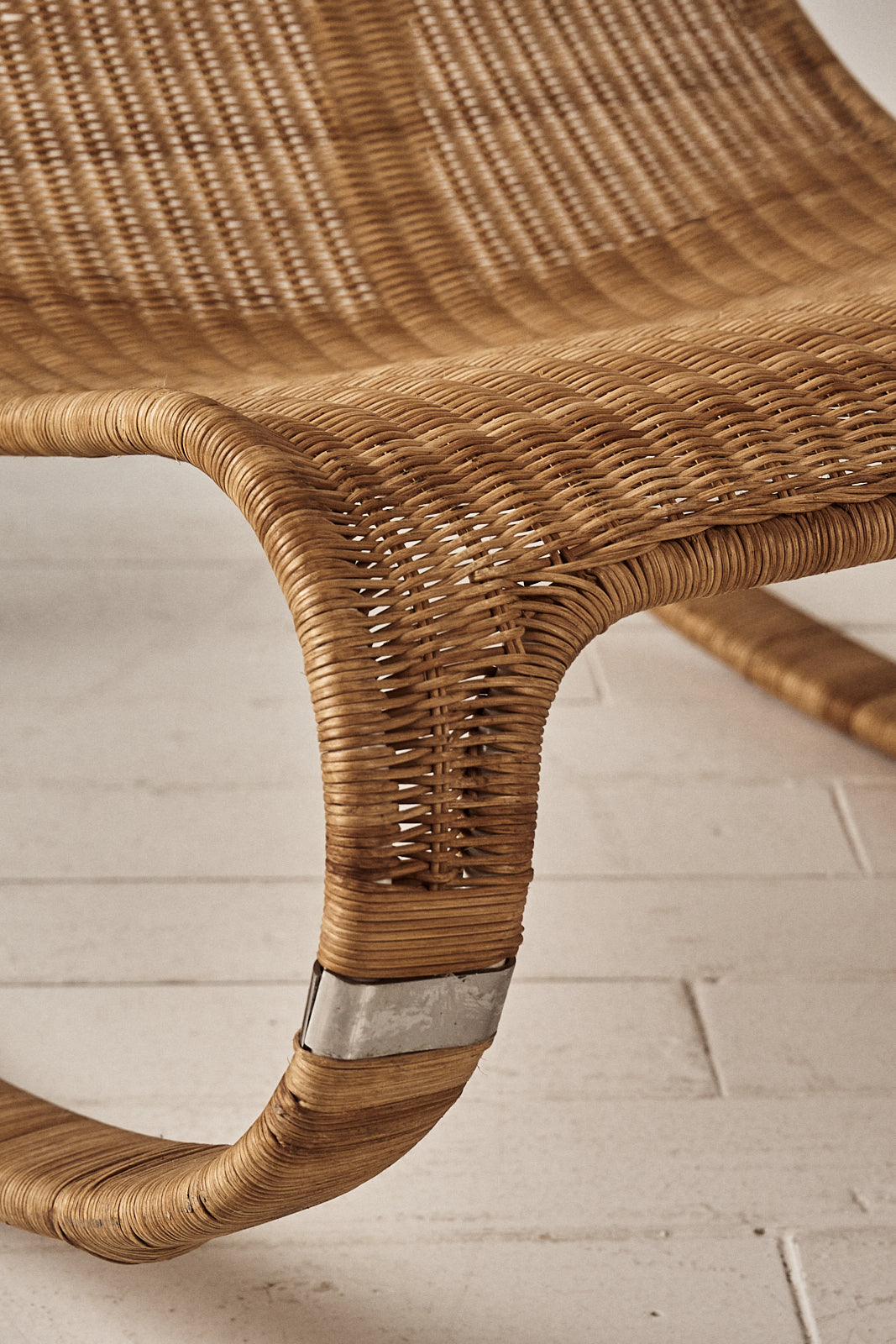 Butaca mecedora original de James Irvine. Con estructura de acero tubular y asiento de mimbre tejido a mano, combina la precisión del diseño industrial con la calidez de los materiales naturales.
