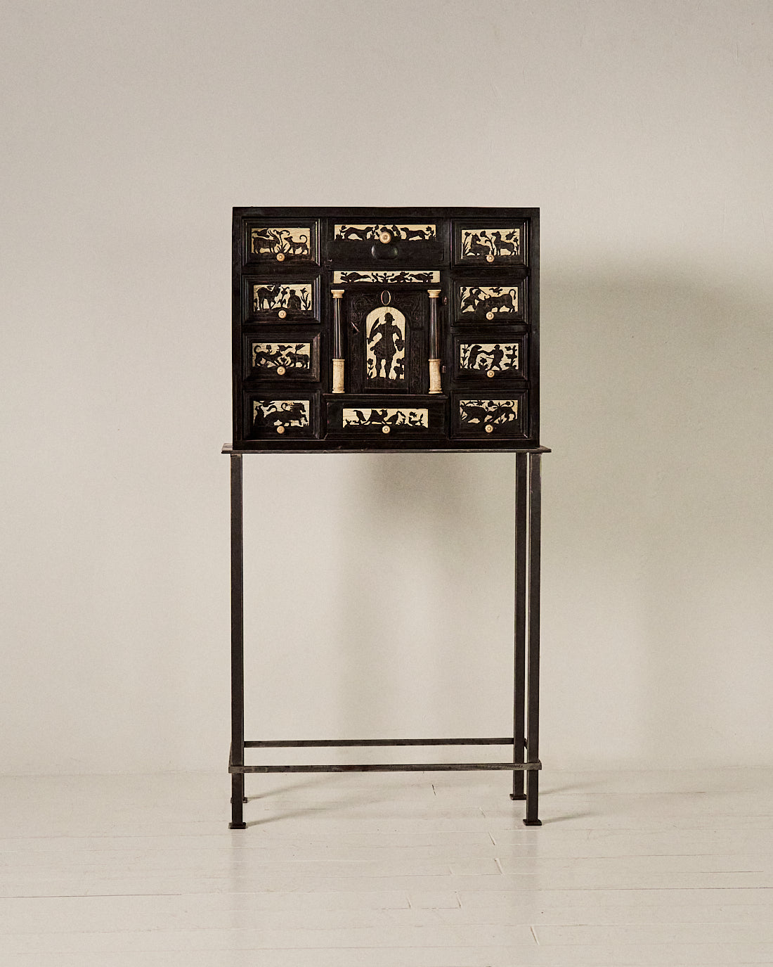 Cabinet italiano de época Regencia, siglo XVII, realizado en ébano con aplicaciones de chapa de marfil.