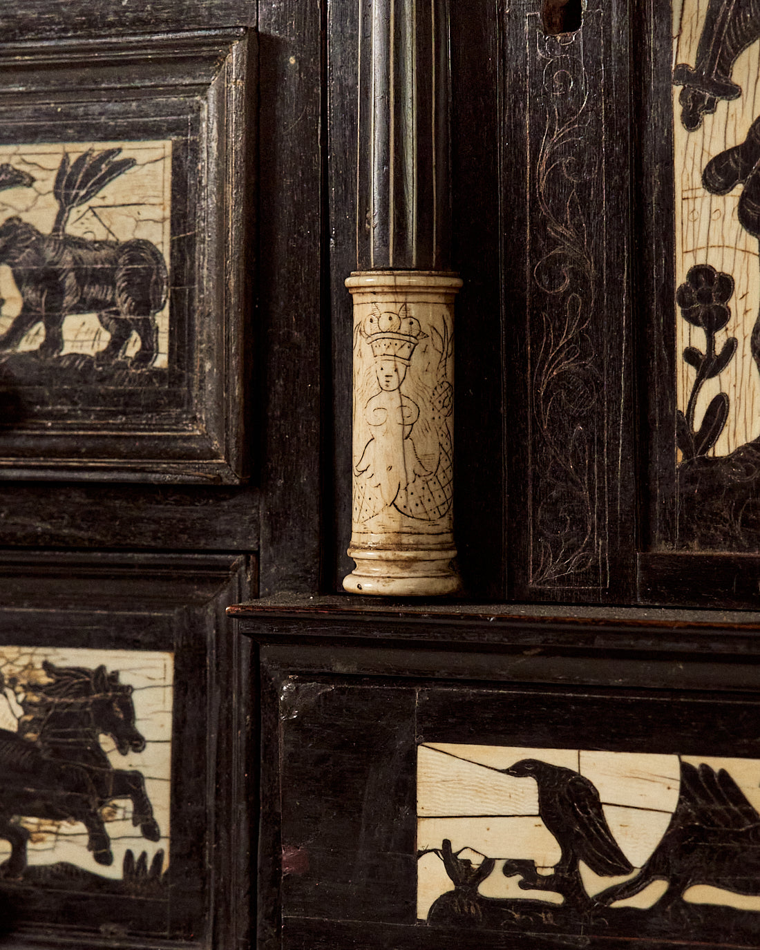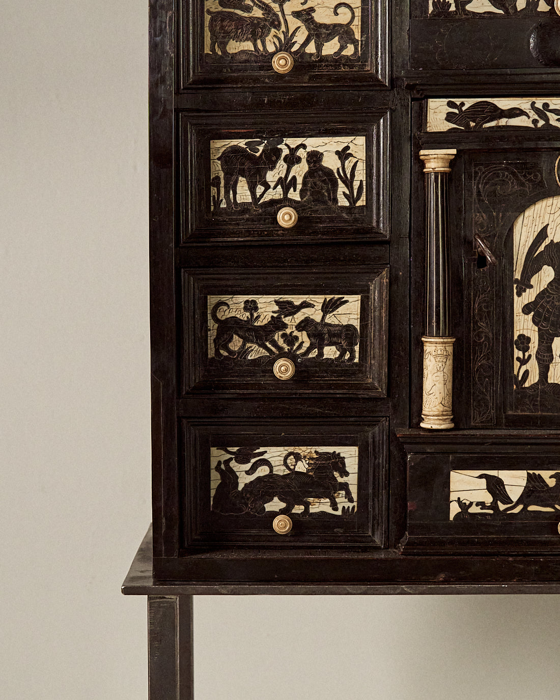 Los cajones están ornamentados con escenas grabadas de carácter narrativo, posiblemente inspiradas en las fábulas de Esopo. Al abrir la puerta central, el mueble revela tres cajones interiores decorados con cabezas perfiladas, manteniendo la coherencia iconográfica y ornamental de la pieza.