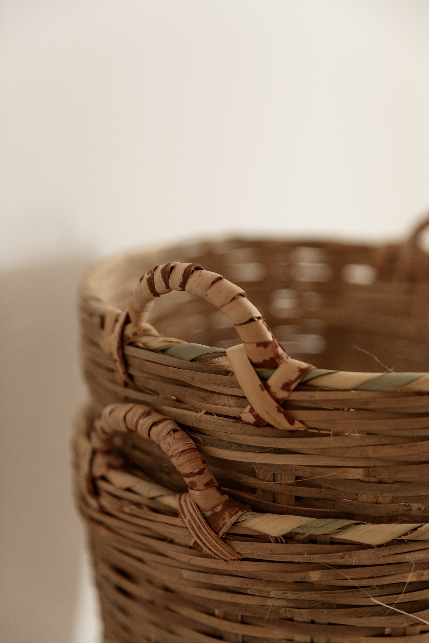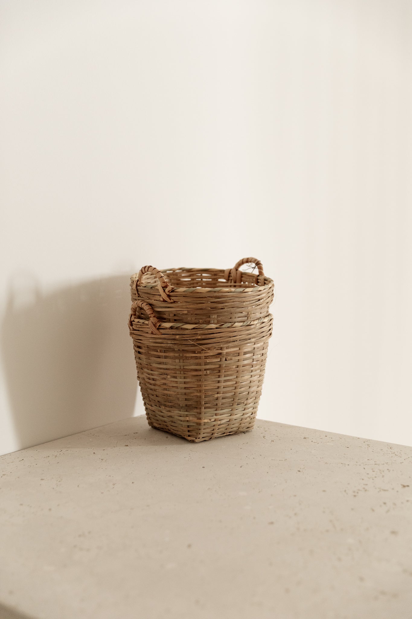 Cesta con asas elaborada artesanalmente en hoja de palma trenzada a mano, en color natural, tamaño XS. Cada pieza conserva la textura y los detalles característicos del trabajo manual, mostrando ligeras irregularidades que evidencian su proceso artesanal y autenticidad.