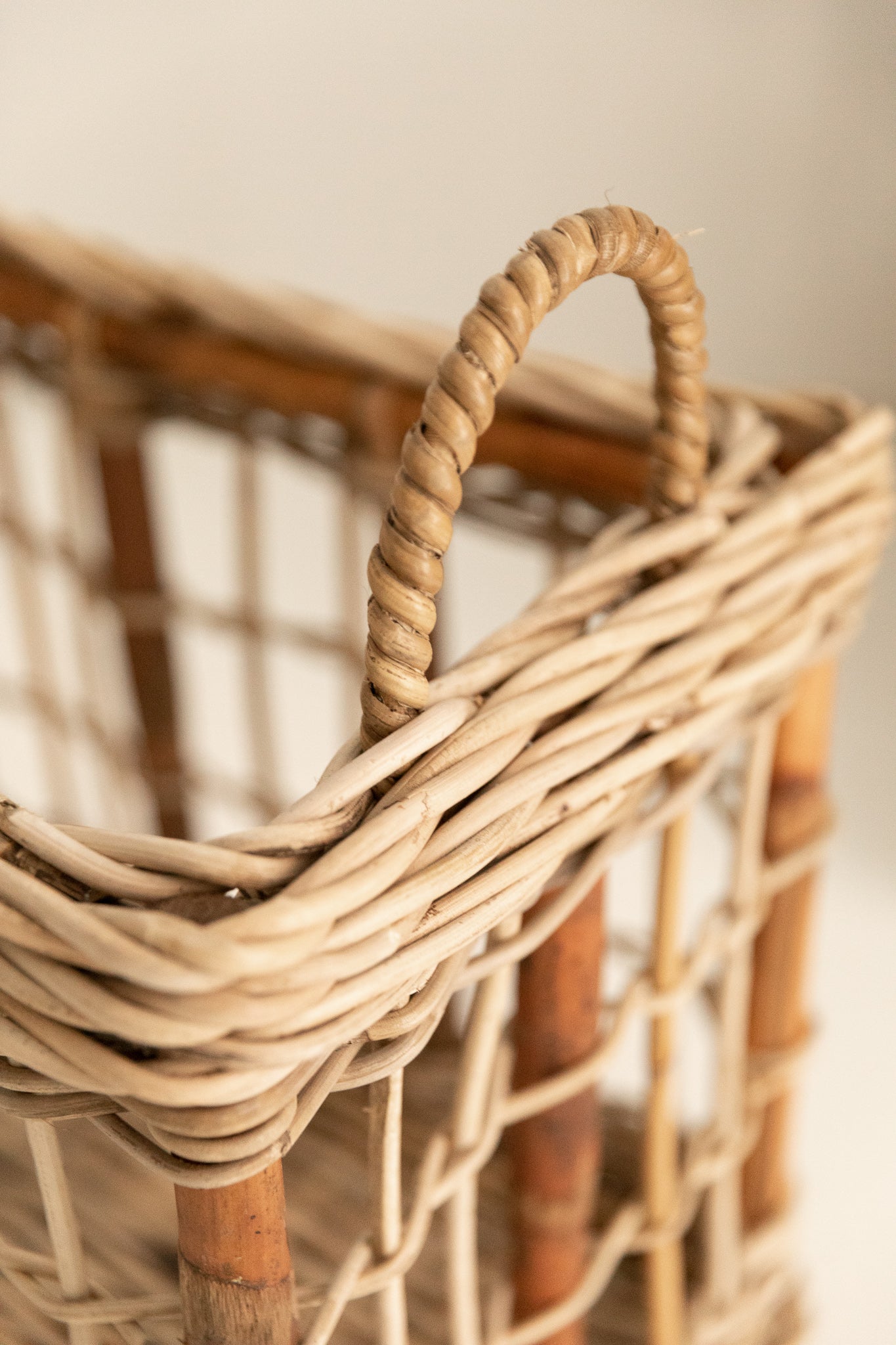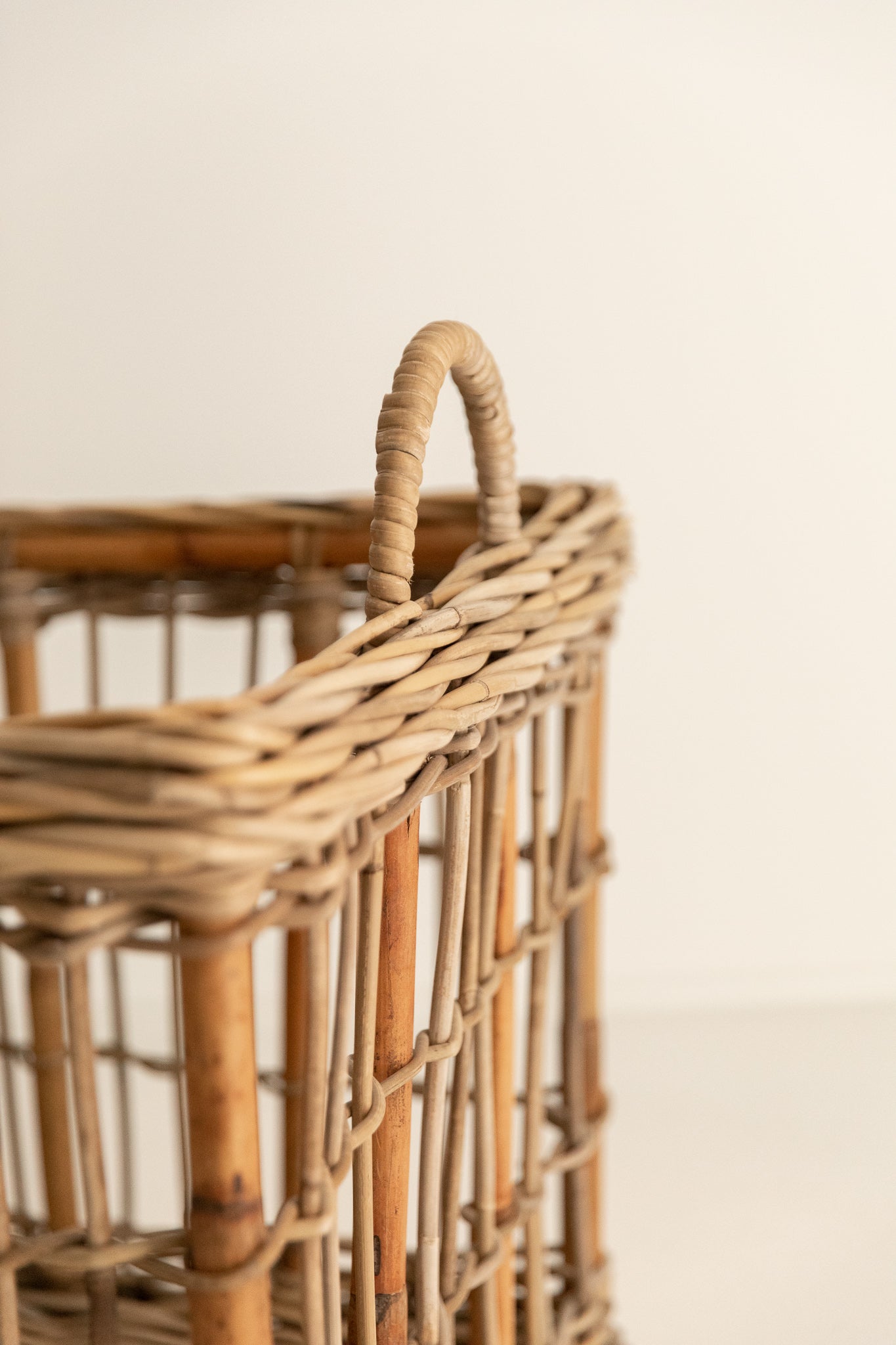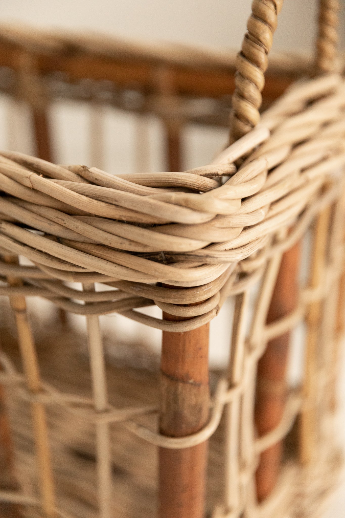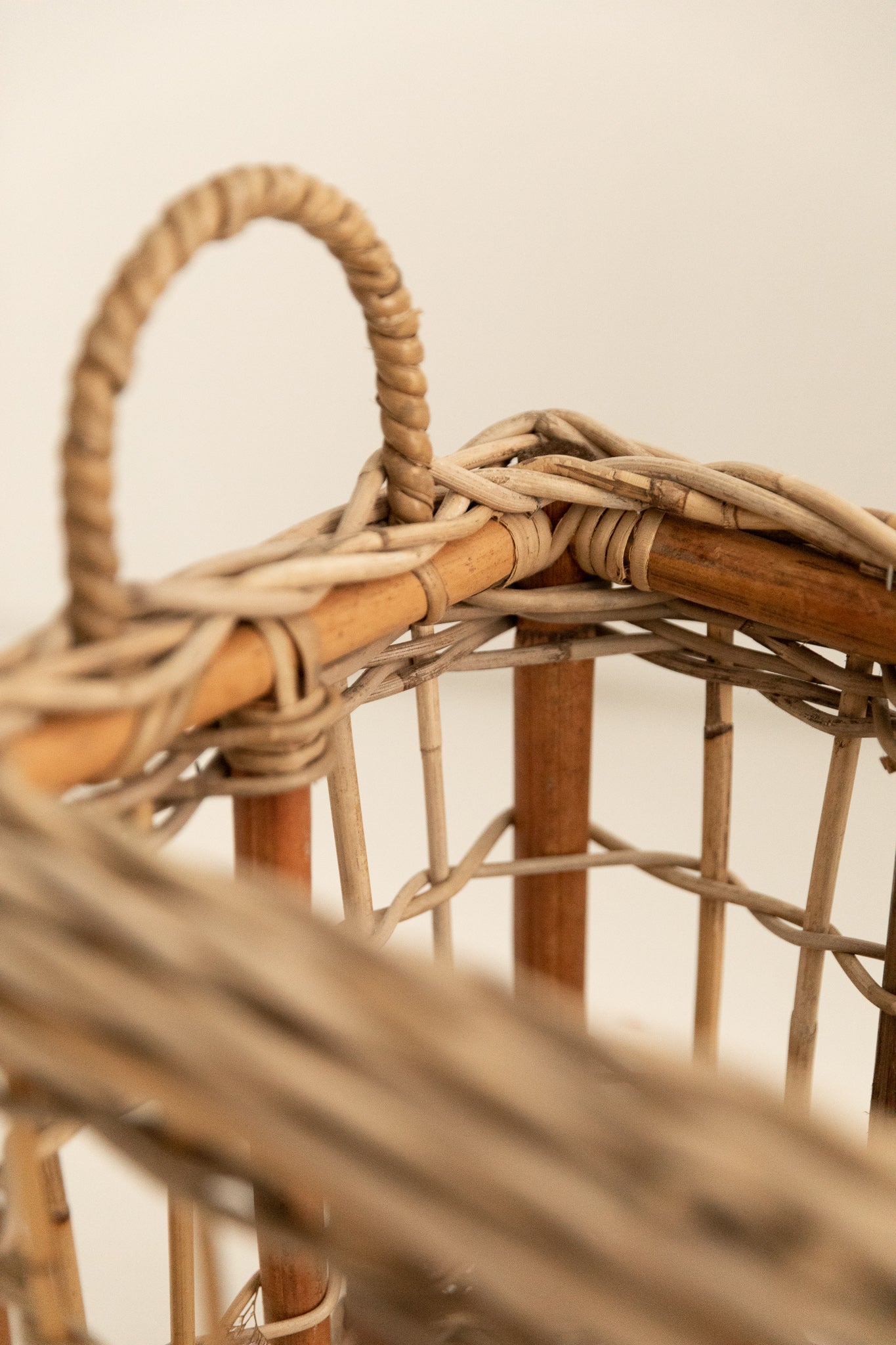 Cesta elaborada en ratán natural, trenzada a mano siguiendo técnicas tradicionales que garantizan resistencia y flexibilidad.