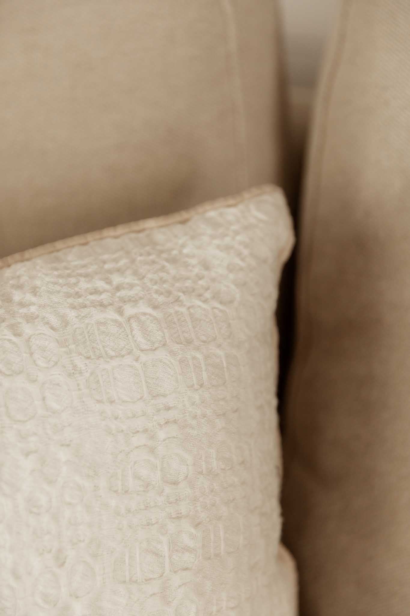 Cojín de lana en color crudo con textura y ribete en color natural con relleno de pluma.