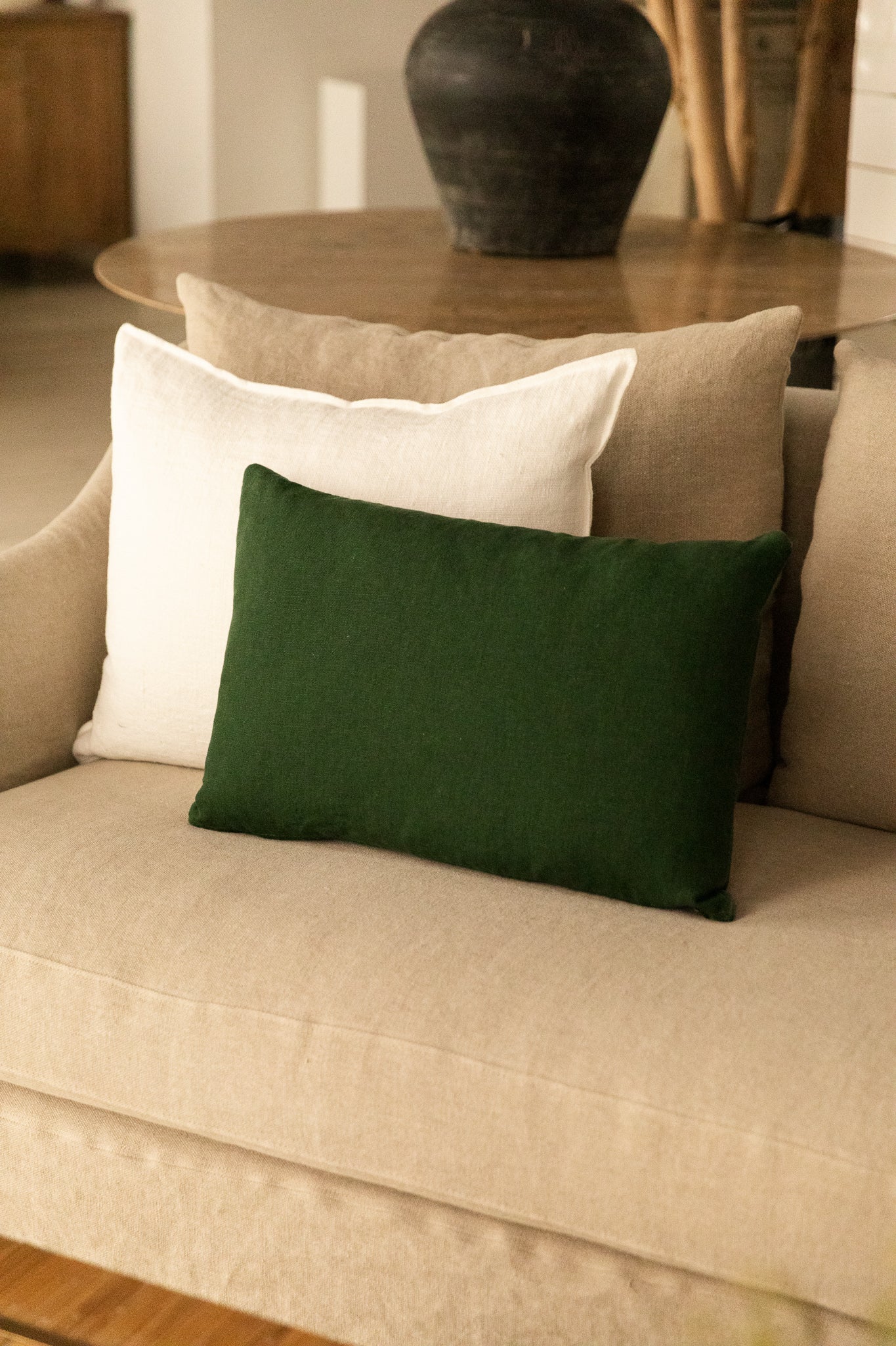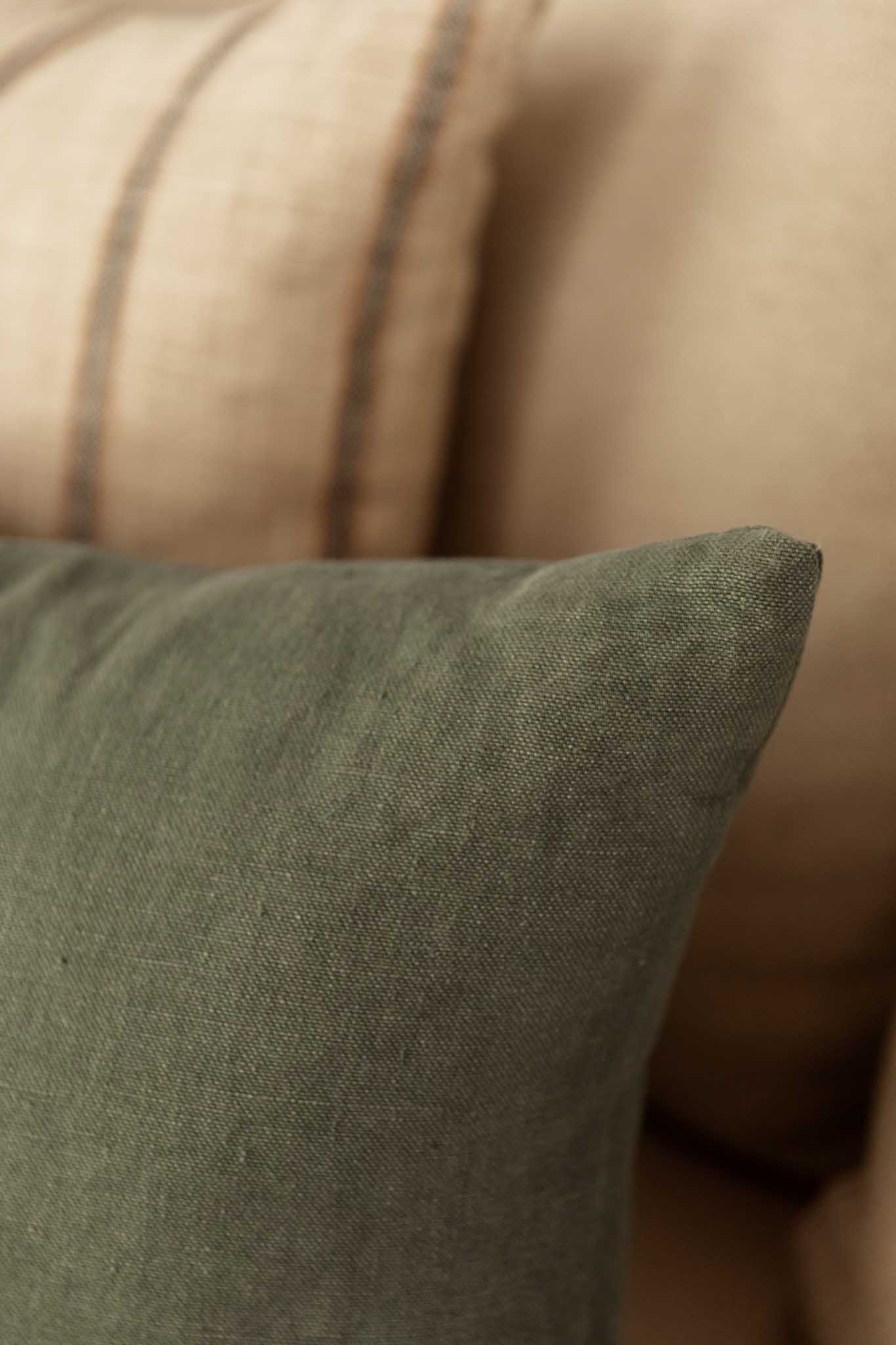 Confeccionado en 100% lino lavado, que combina suavidad, resistencia y un tacto natural. Su relleno de pluma natural ofrece confort y volumen, mientras que la funda interior está forrada en poliéster impermeable, antibacterias y antihongos, protegiendo el cojín y alargando su vida útil.