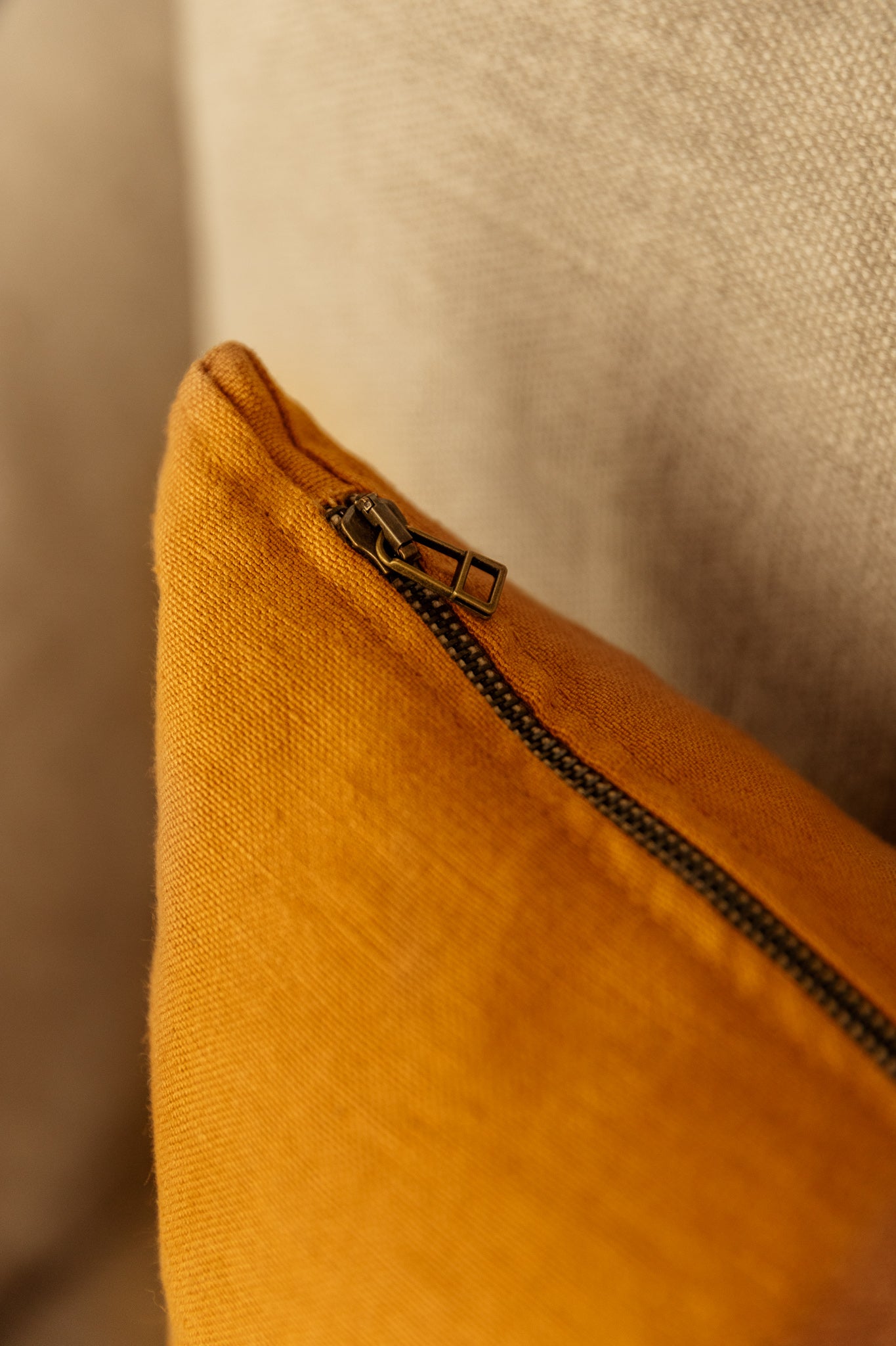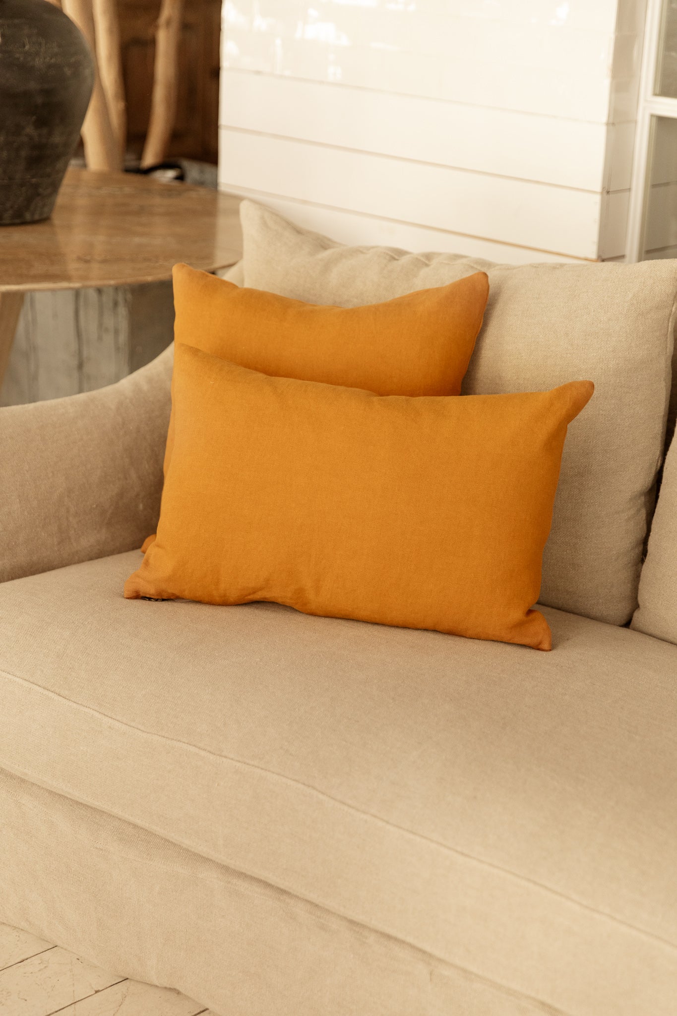 Cojín de lino lavado naranja con relleno de pluma natural.