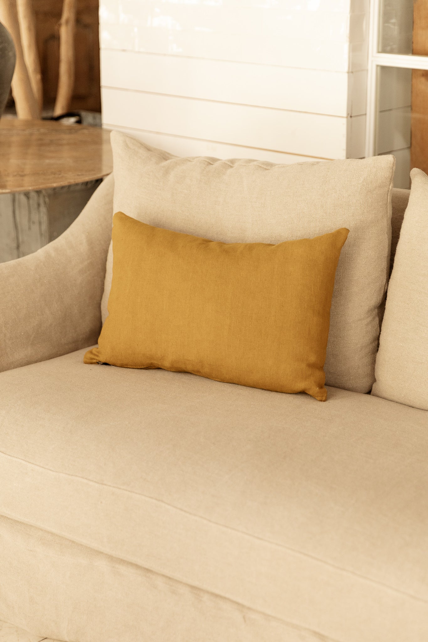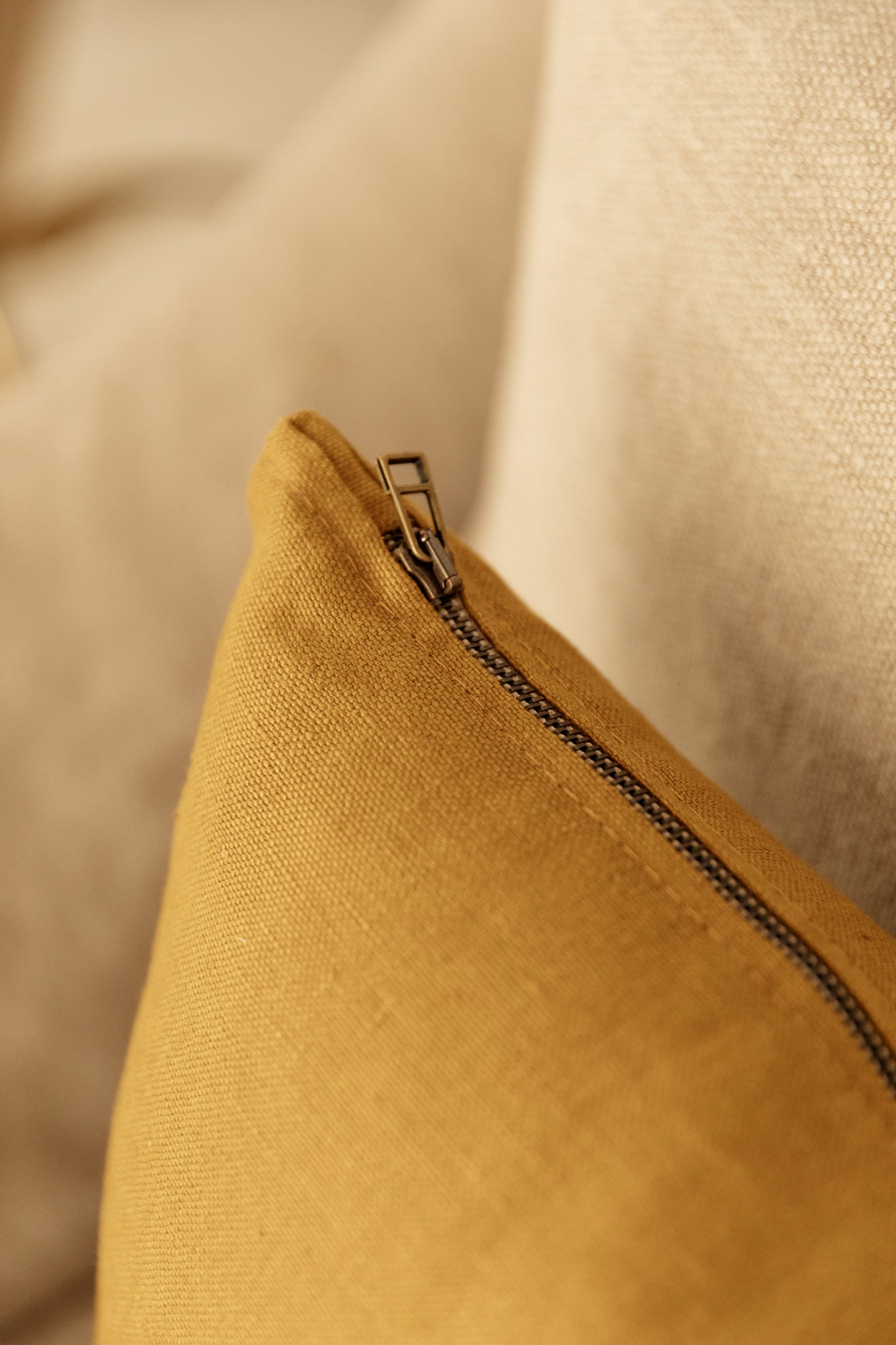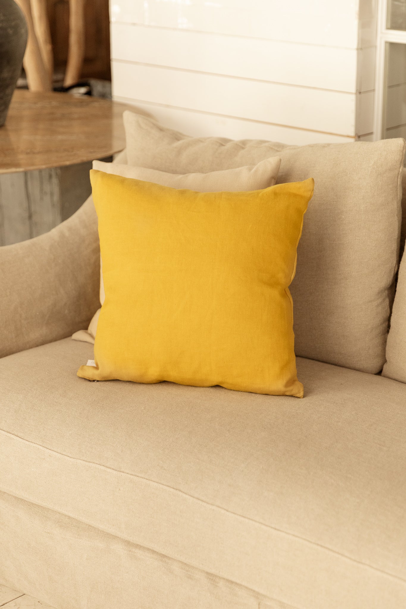 Cojín de lino lavado amarillo con relleno de pluma natural.