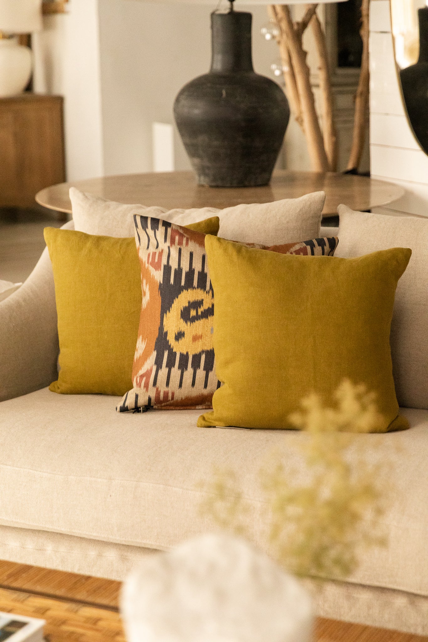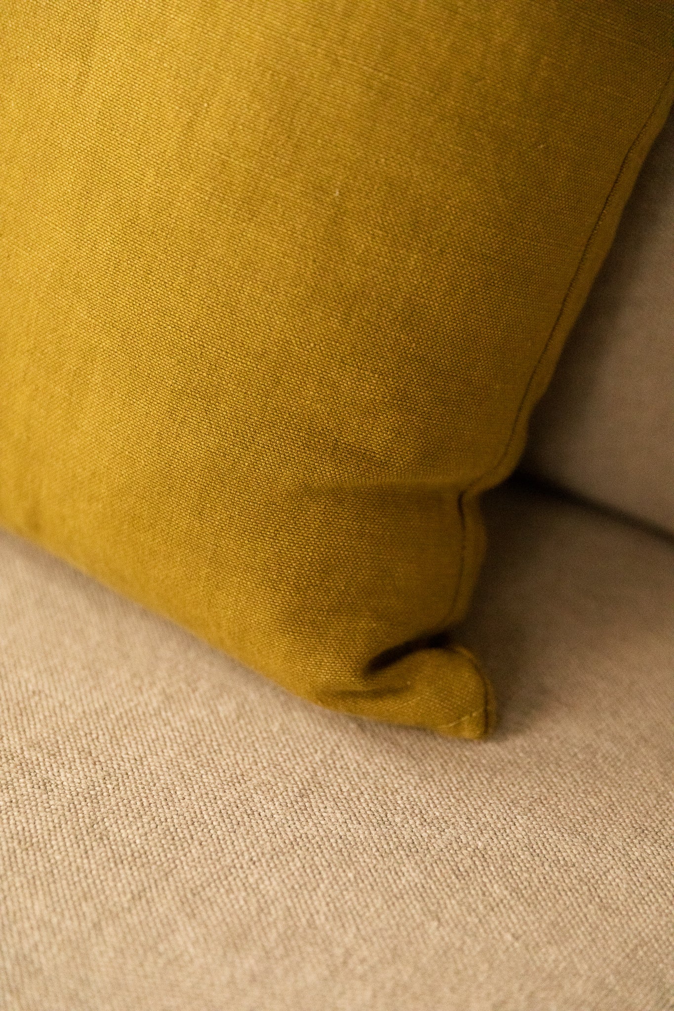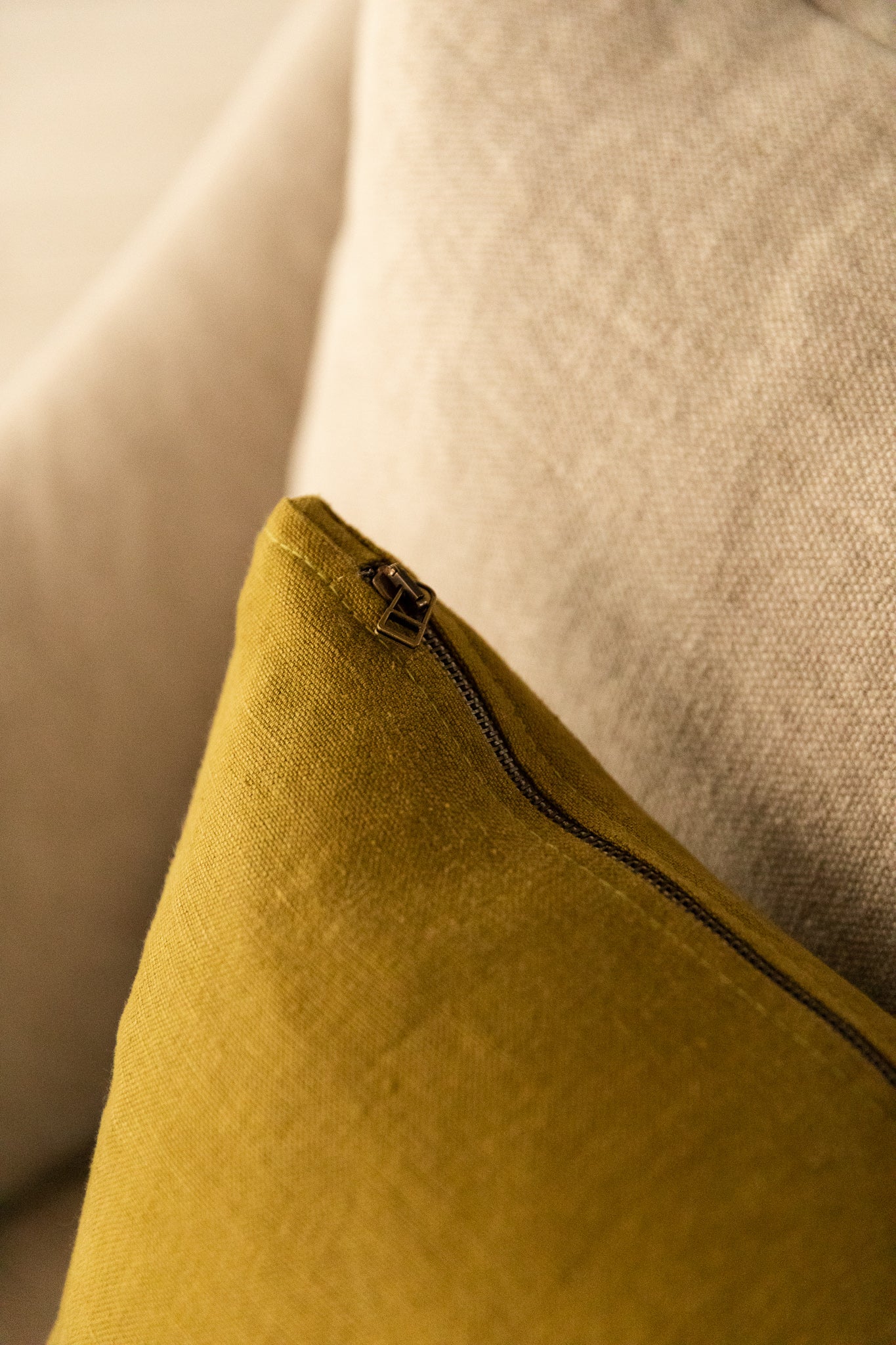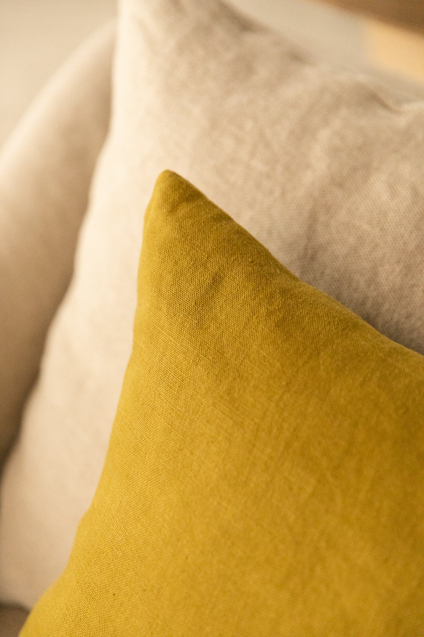 Cojín de lino lavado en color pistacho con relleno de pluma natural.