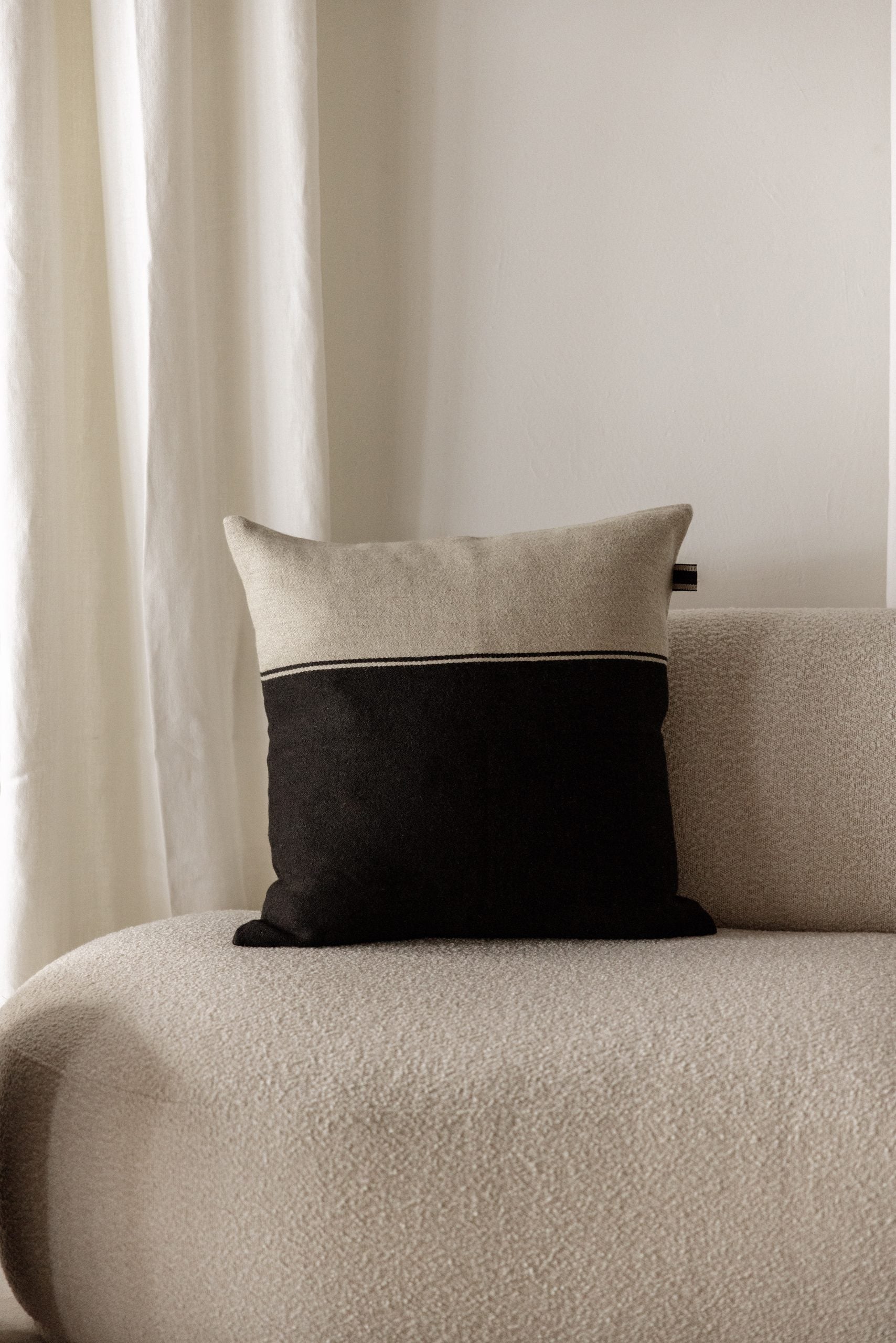 Funda de cojín de lino y lana en color natural y negro con diseño en rayas, relleno de pluma de pato.