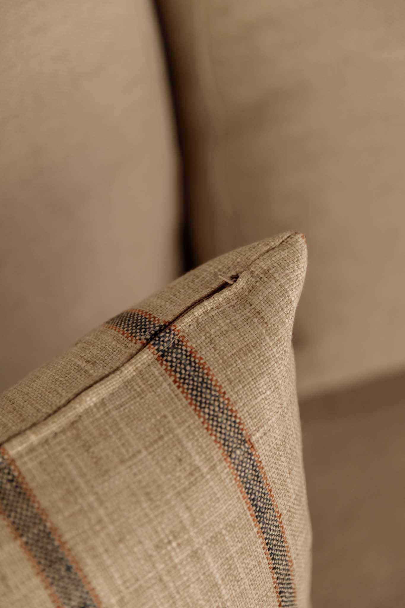 Cojín de lino y seda color natural con rayas azules y malvas, relleno de pluma natural.