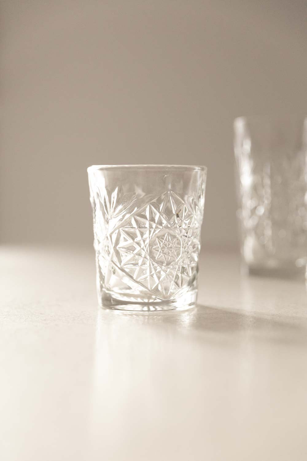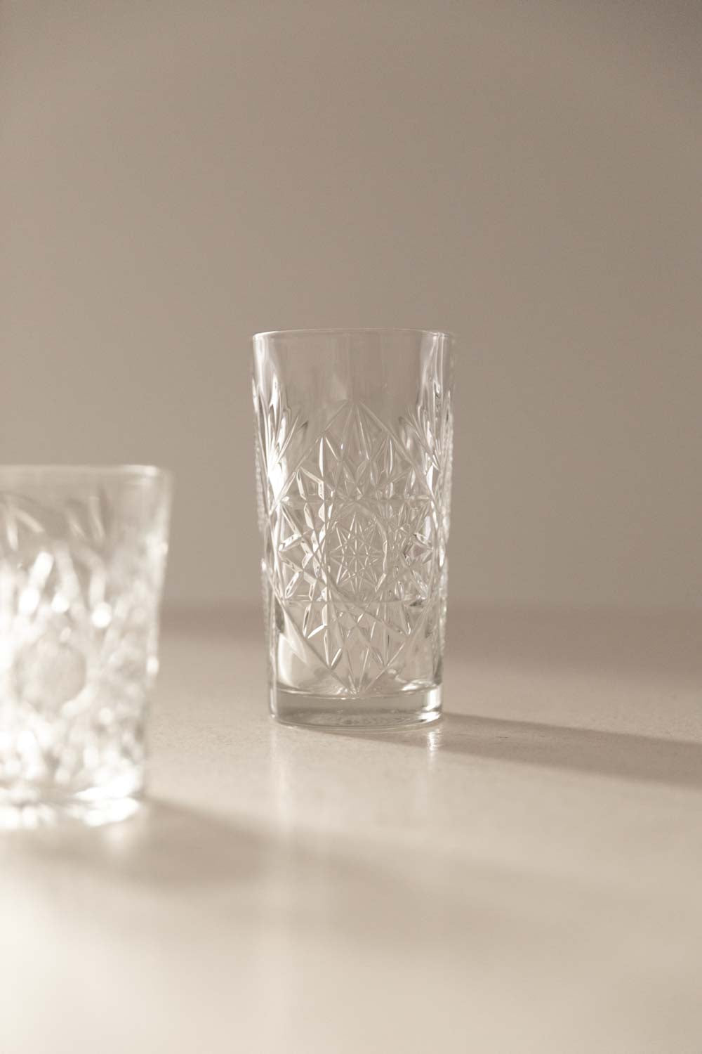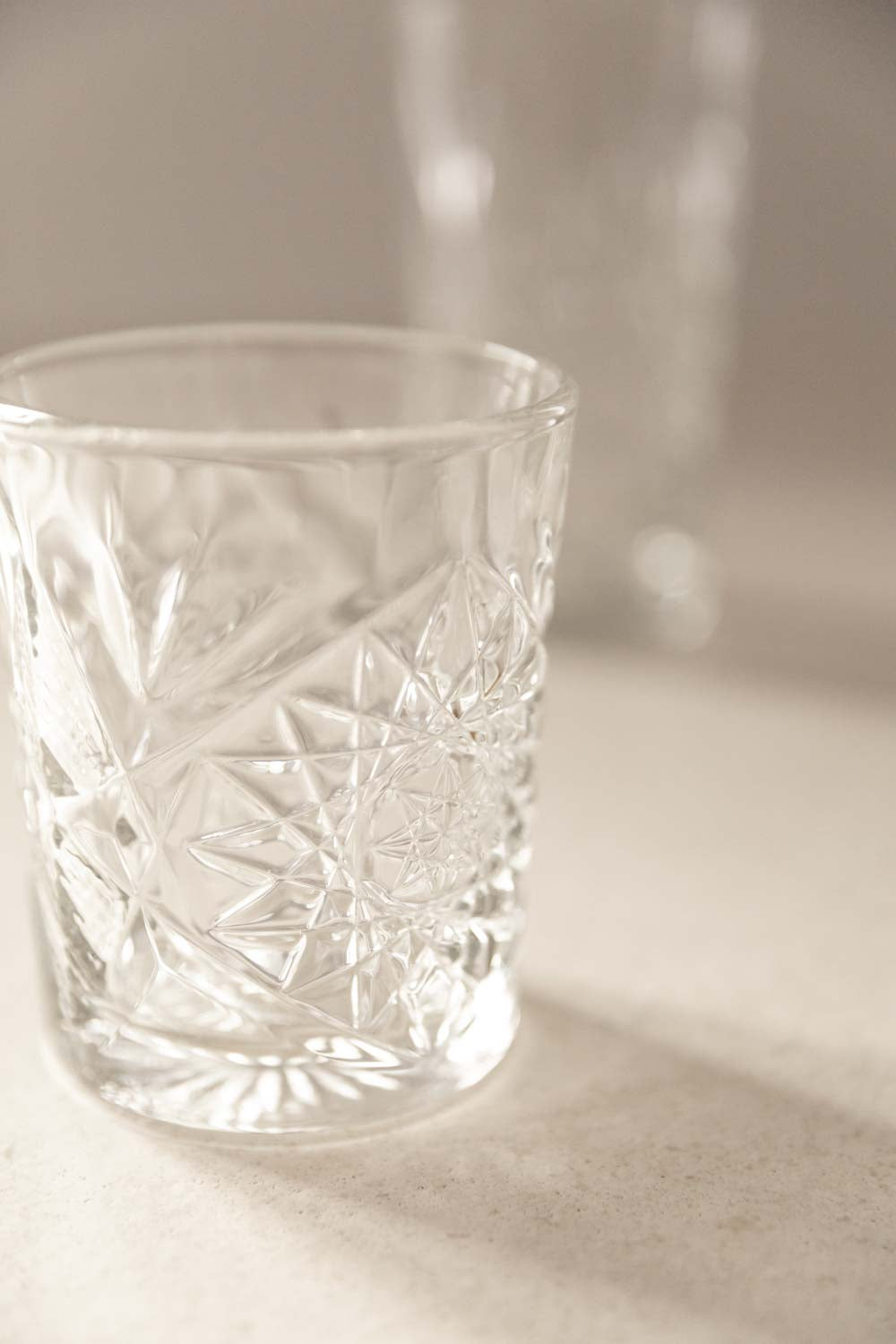 Cada pieza de esta colección destaca por su patrón tallado en forma de estrella, un diseño que aporta luz y movimiento a la superficie del vidrio.