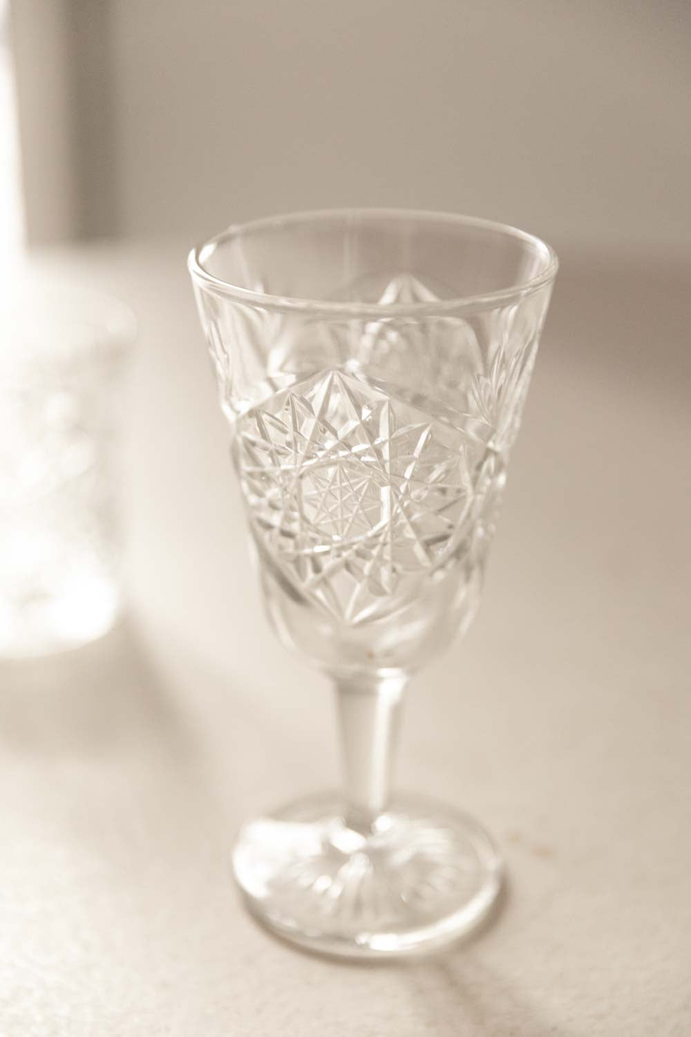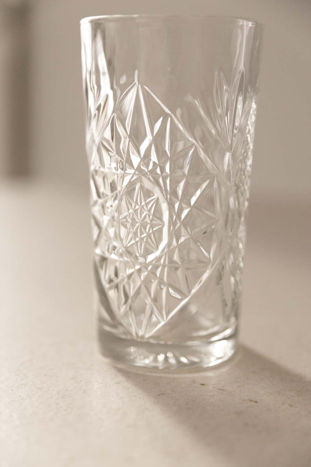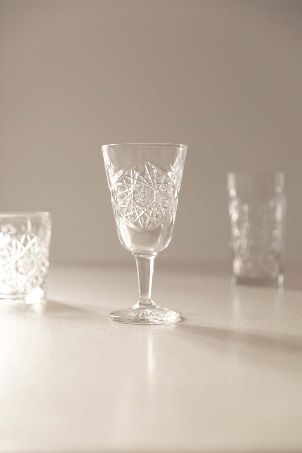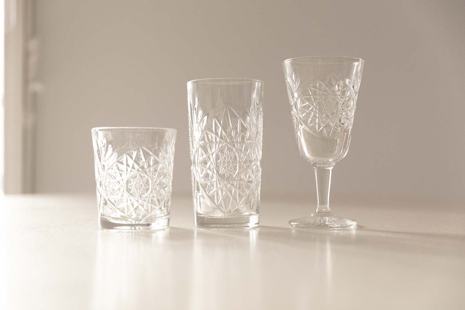 Cada pieza de esta colección destaca por su patrón tallado en forma de estrella, un diseño que aporta luz y movimiento a la superficie del vidrio.