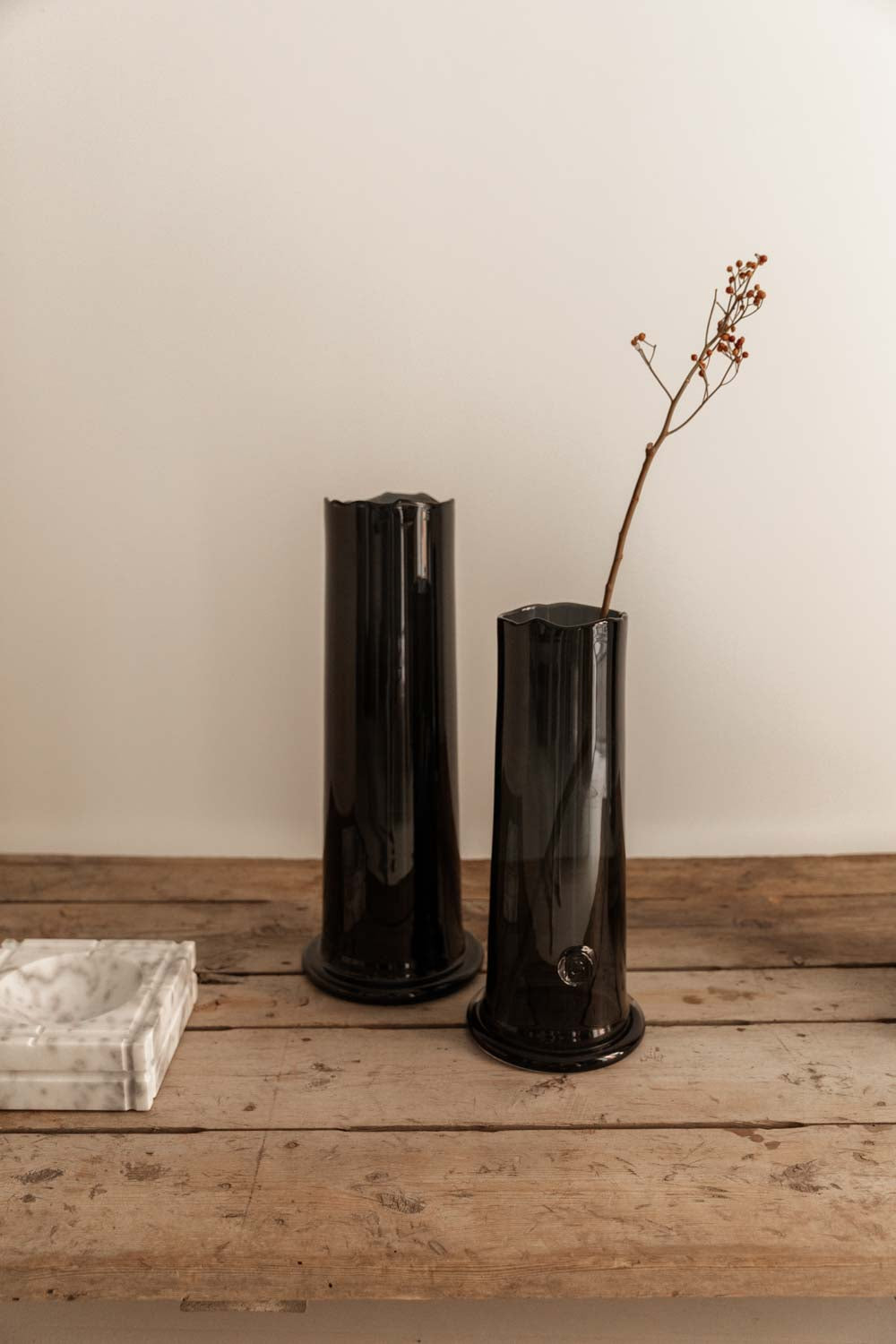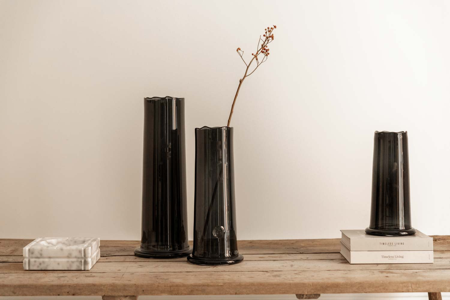 Colección Jarrones de Cristal Gris Translúcido. Elaborada artesanalmente en cristal soplado gris translúcido, esta colección presenta formas suaves y orgánicas con ligeras variaciones de tono y textura, cada pieza ofreciendo una interpretación única de la luz y el material.