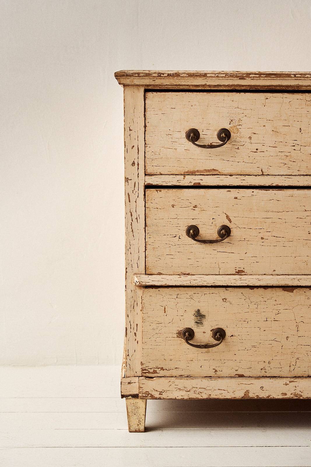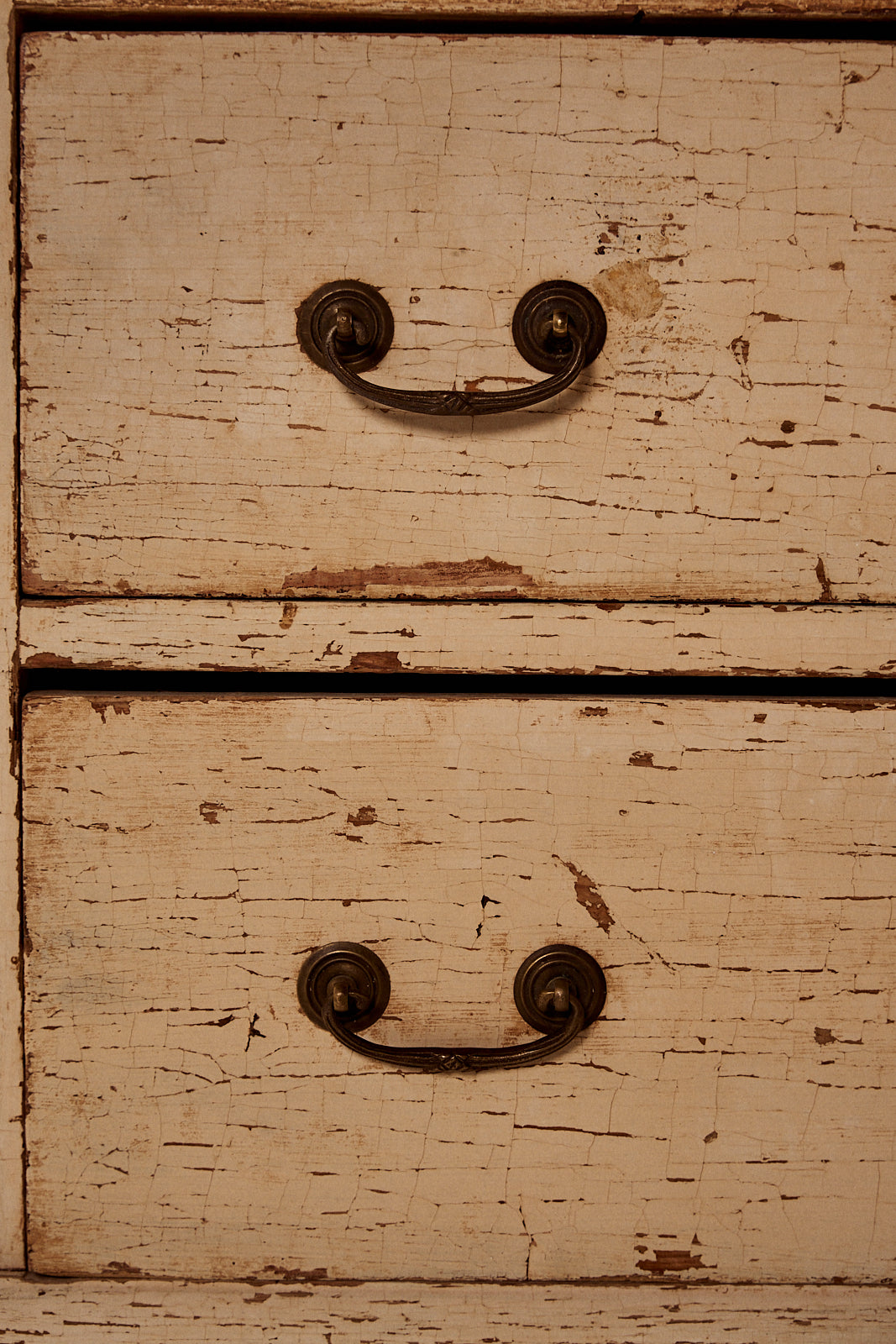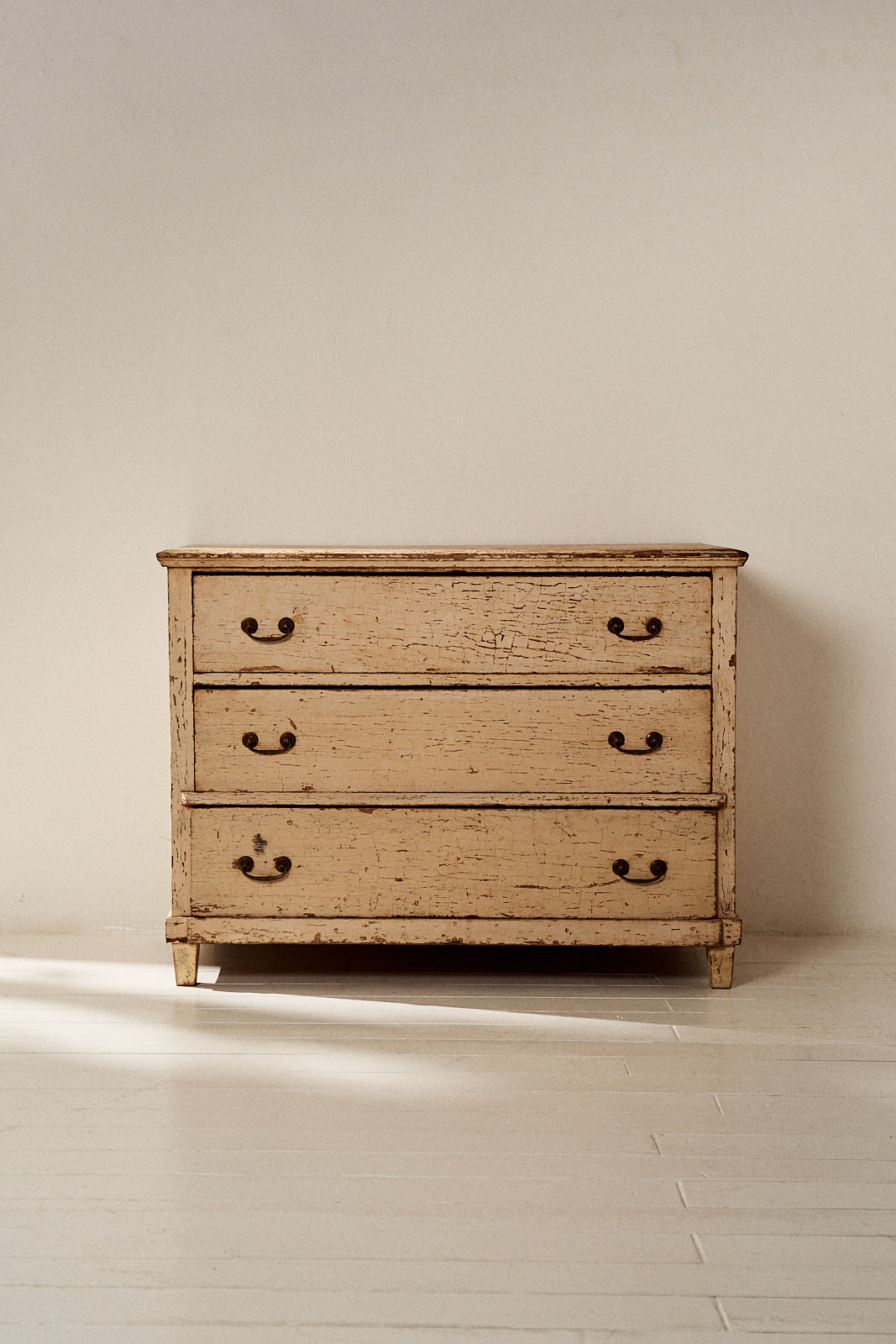 Cómoda de roble francés del siglo XVIII, con elegante pátina beige que realza su acabado original y las vetas naturales de la madera.
