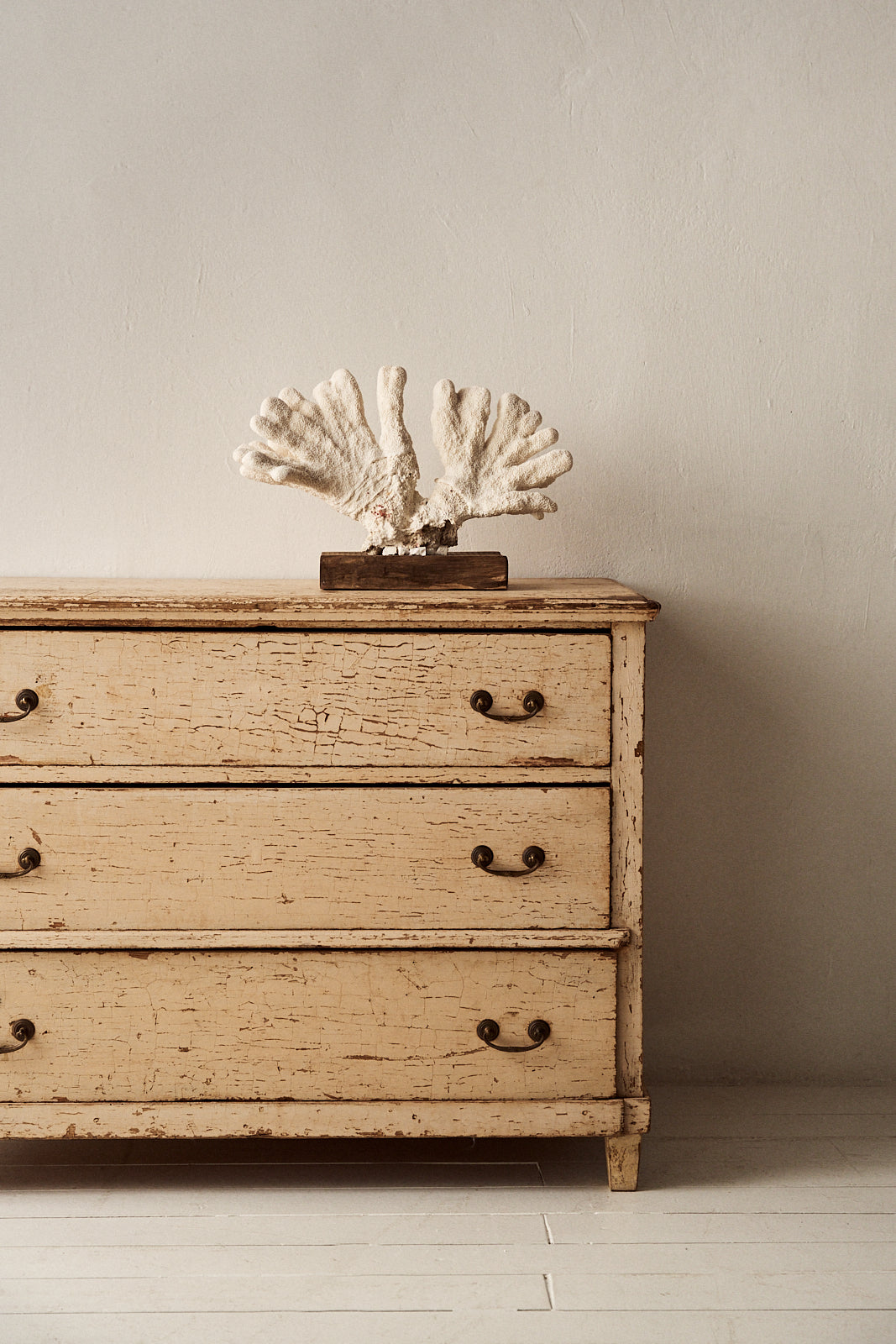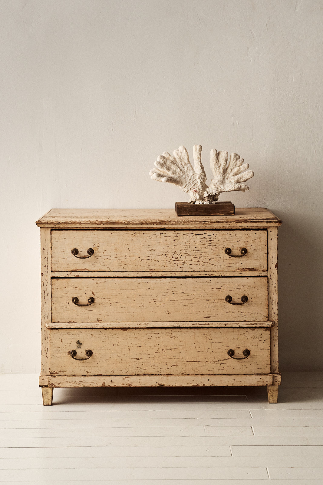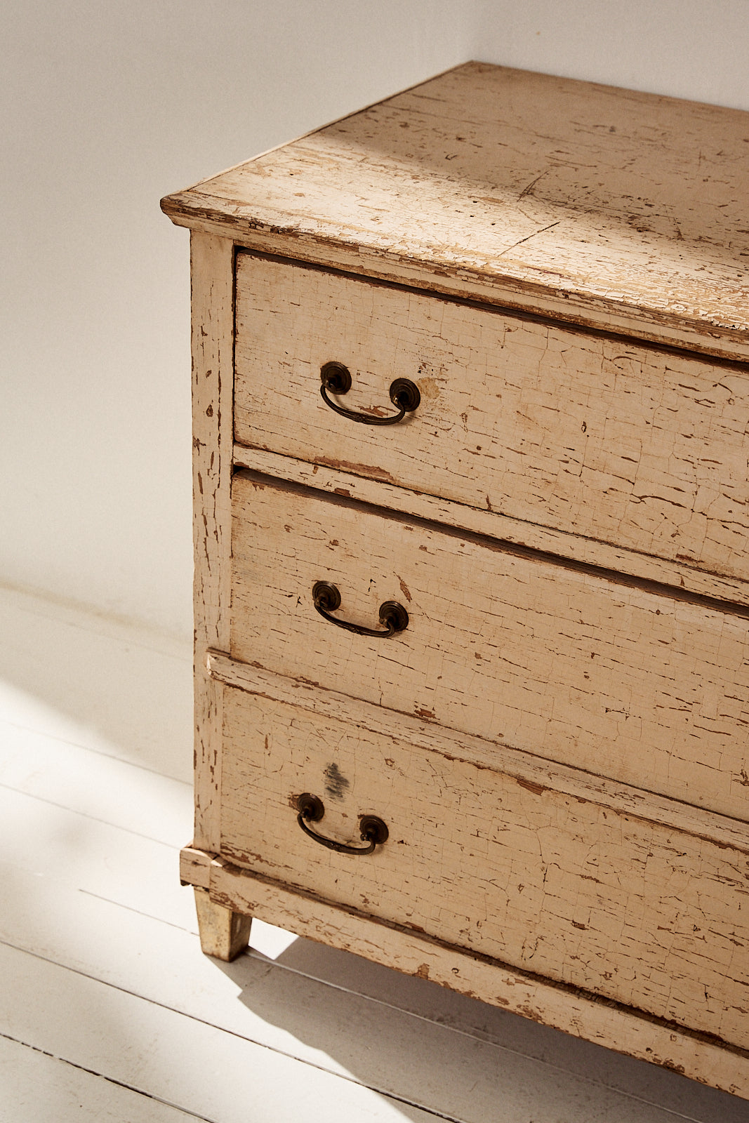 Cómoda de roble francés del siglo XVIII, con elegante pátina beige que realza su acabado original y las vetas naturales de la madera.