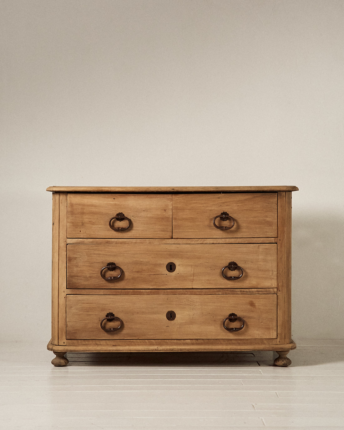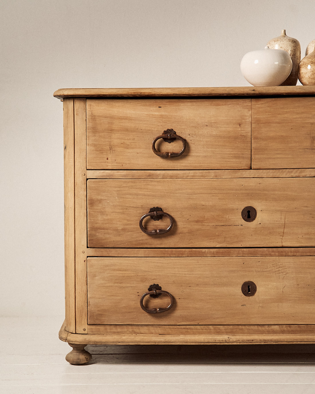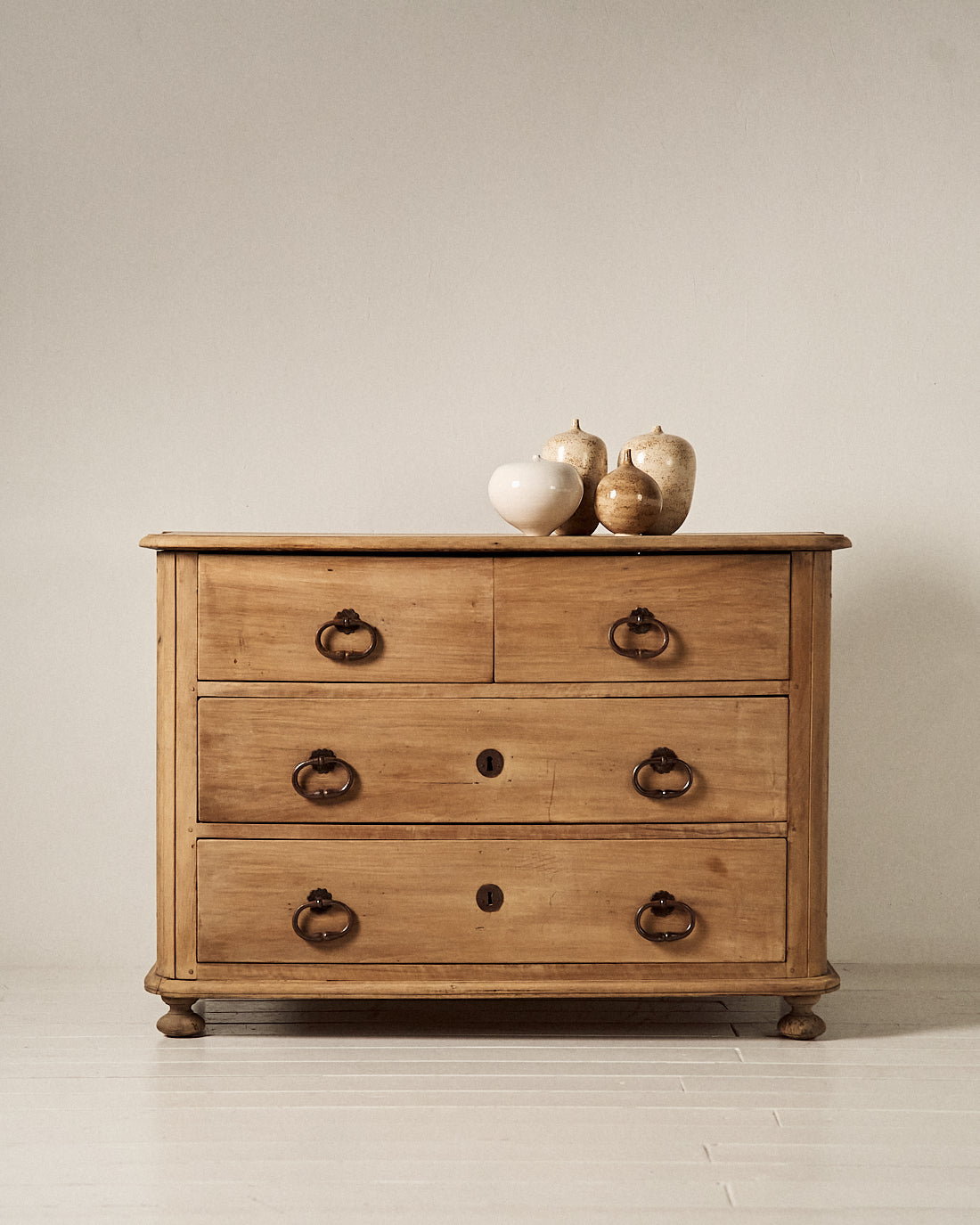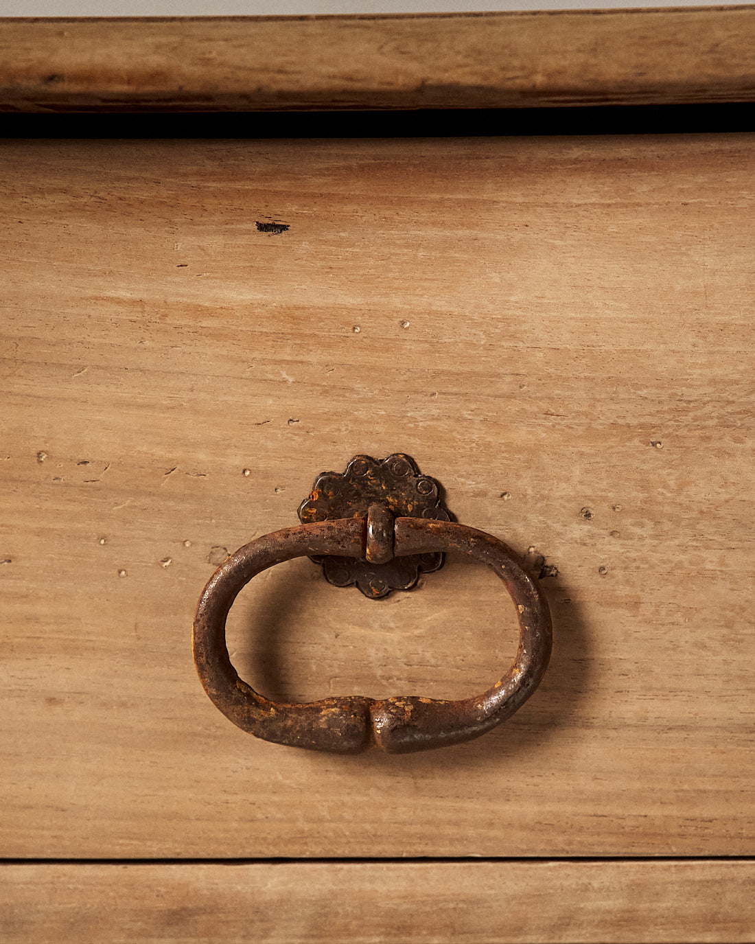 Cómoda de origen francés de madera de nogal del siglo XVIII, con acabado natural que resalta las vetas de la madera y tiradores de aro de metal, típicos de la época.