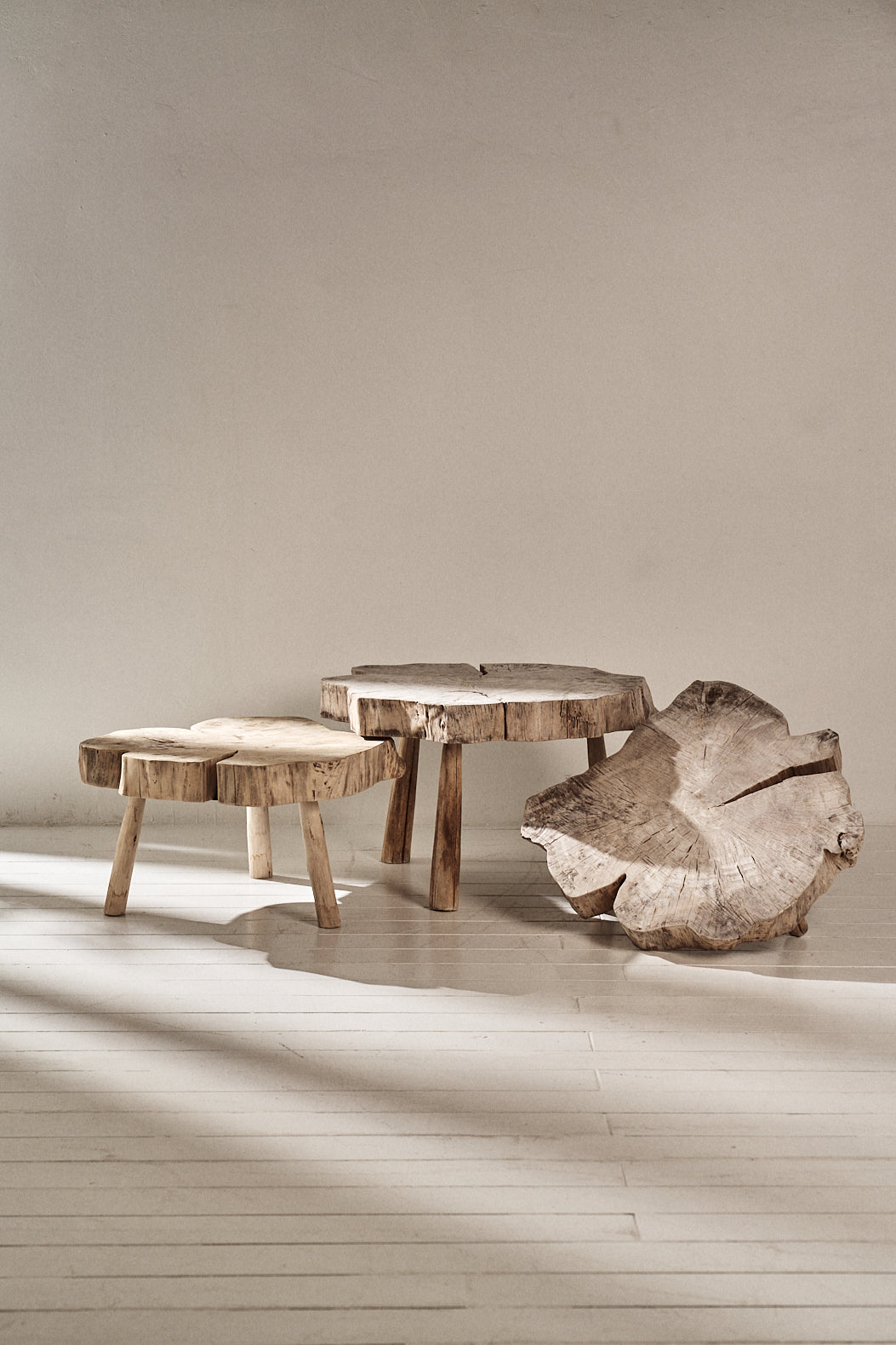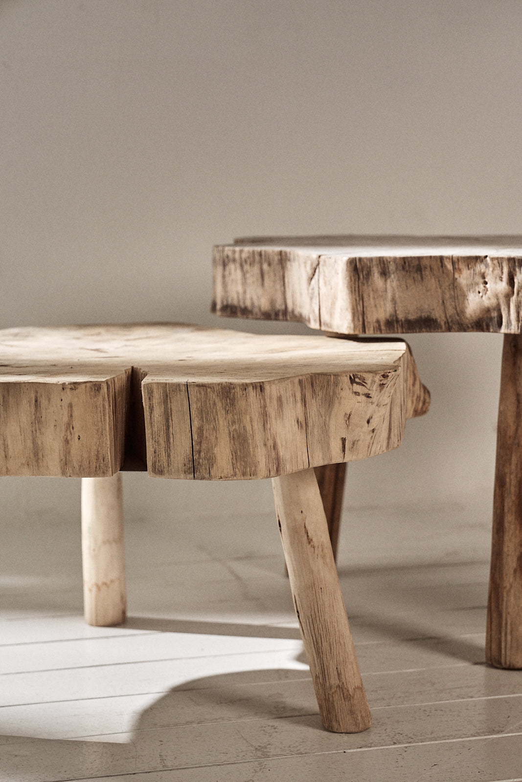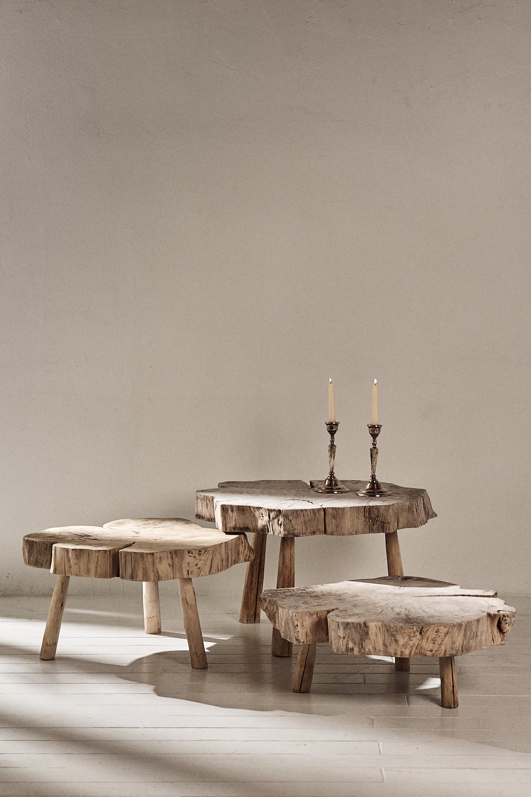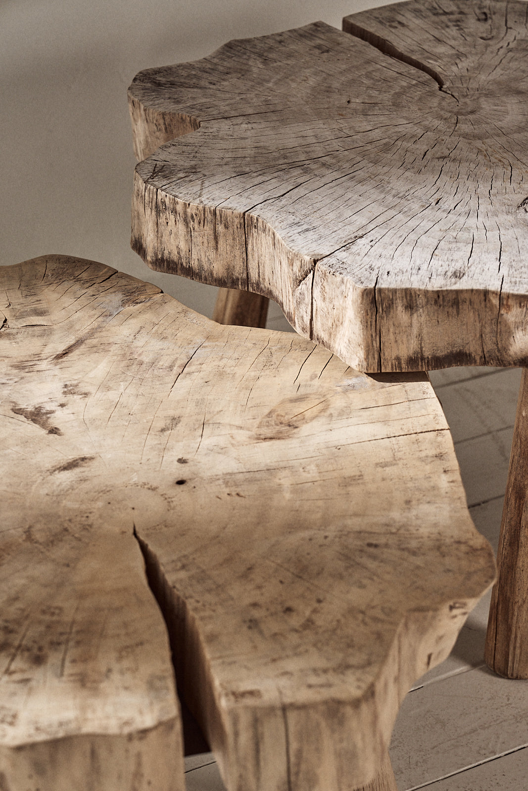 Conjunto de mesas auxiliares elaboradas en tronco de madera maciza, que conservan la forma natural y la textura auténtica del material.