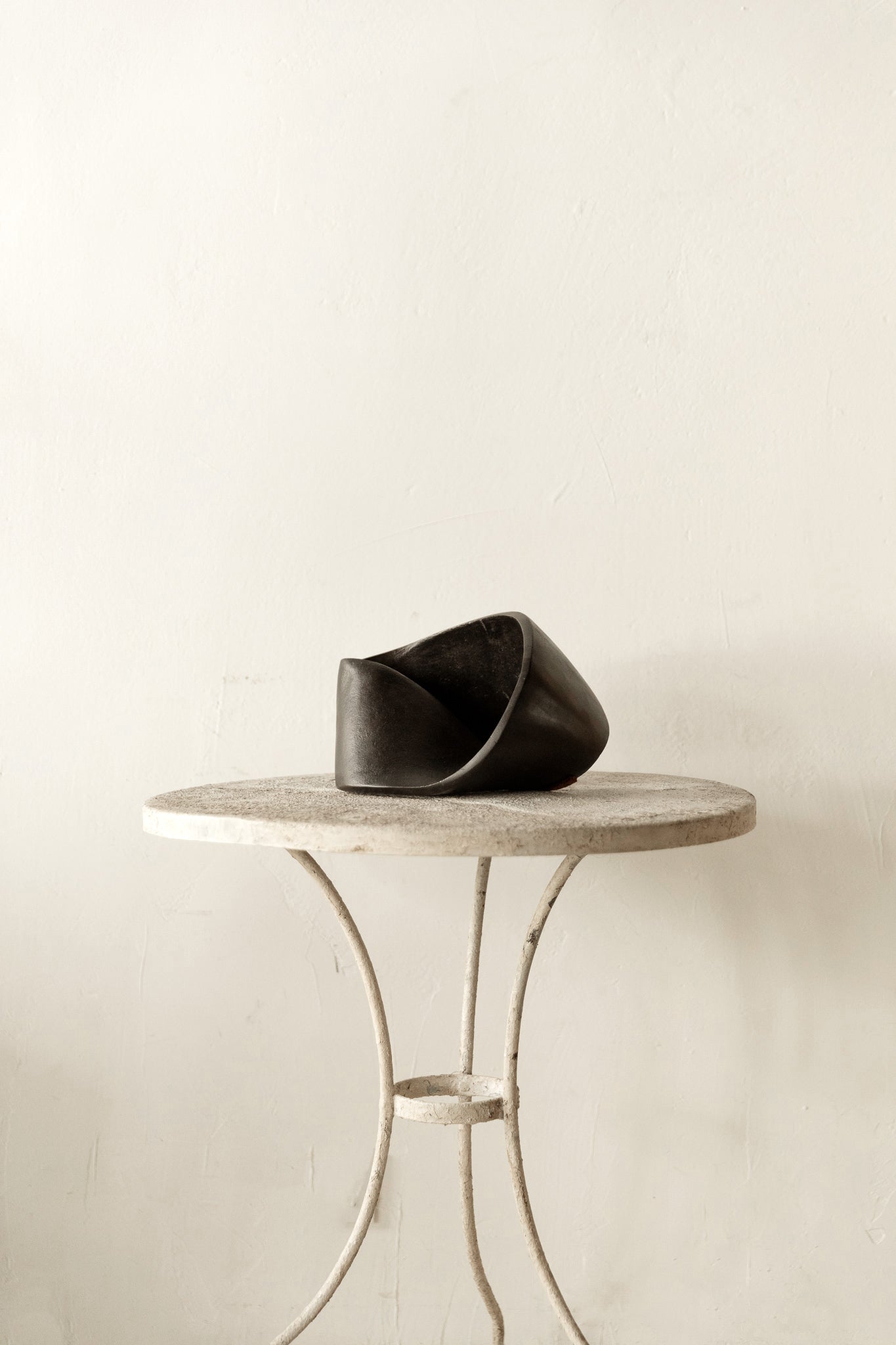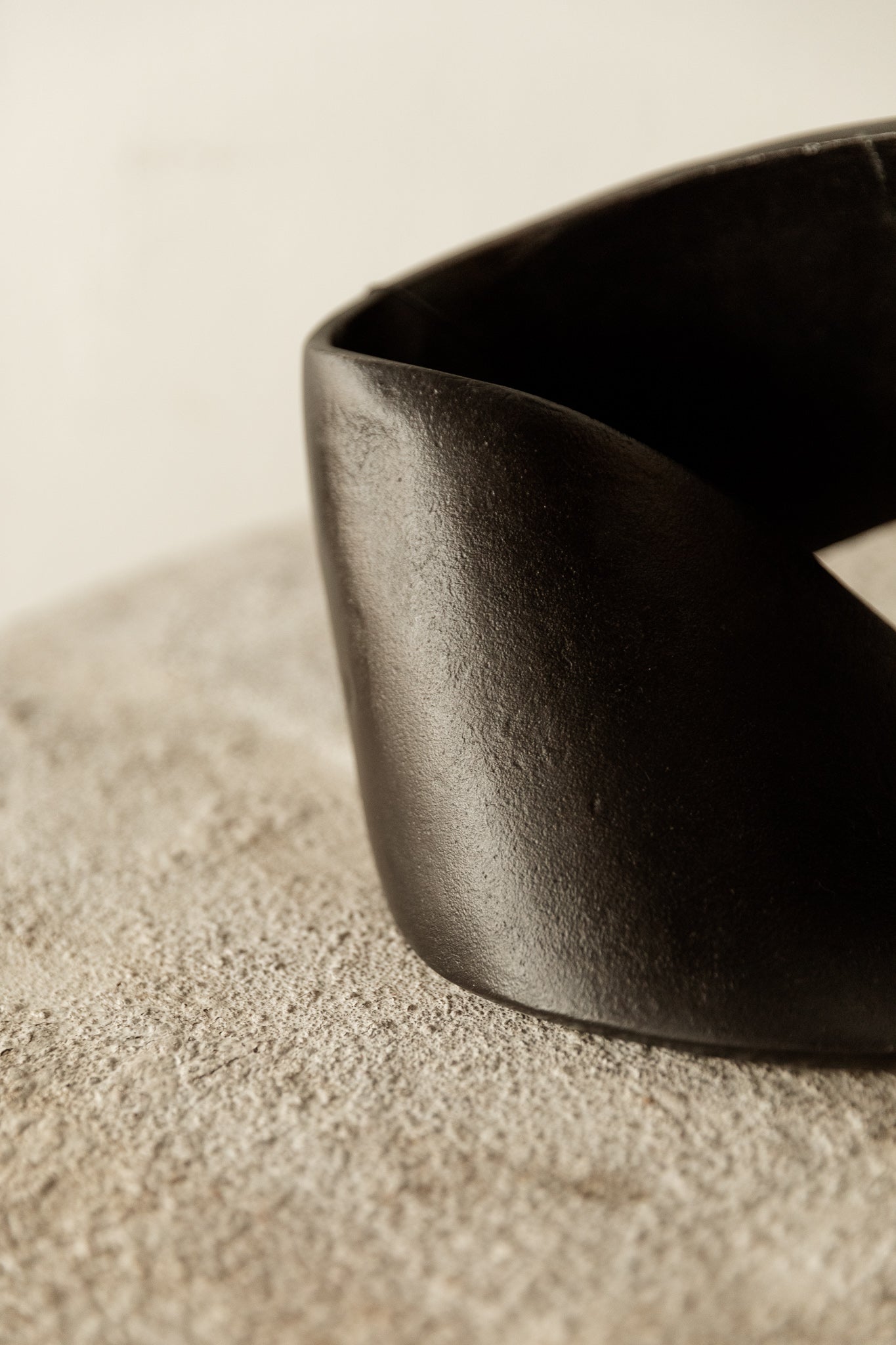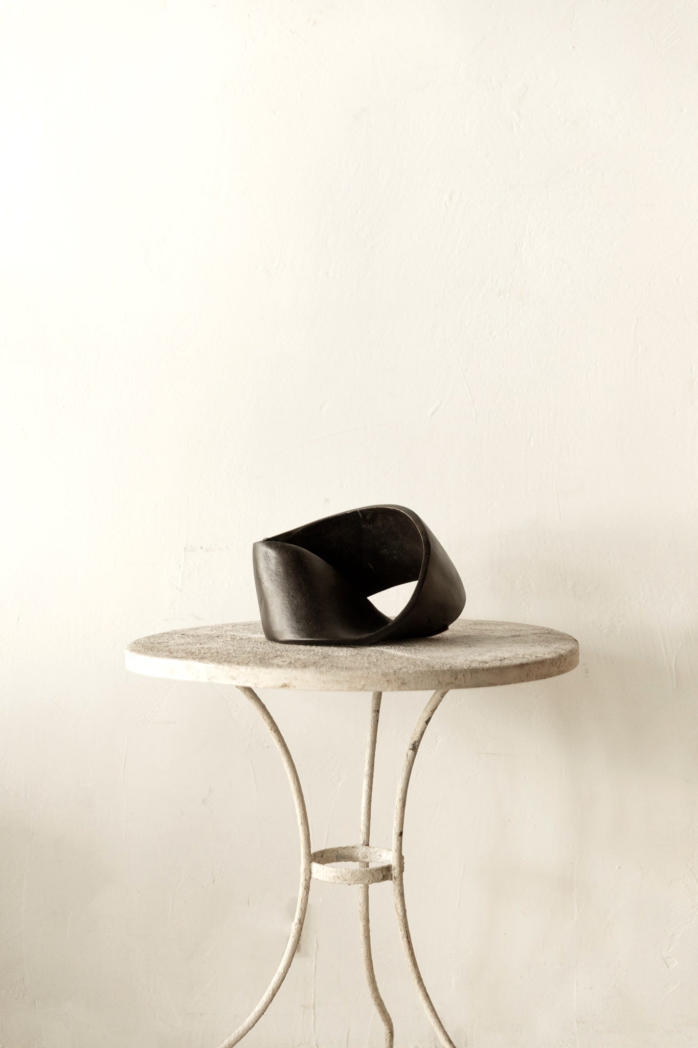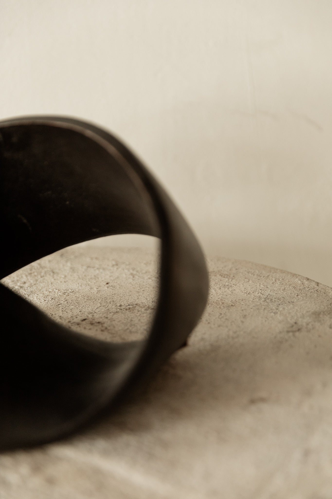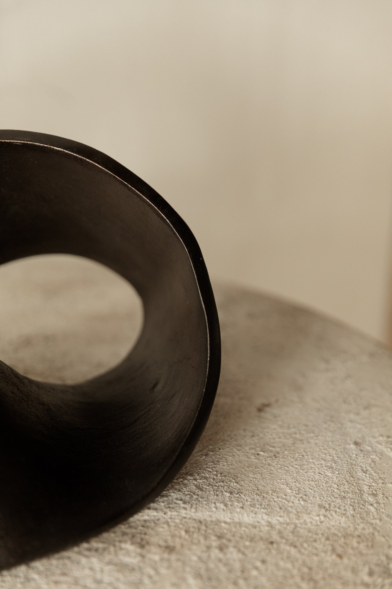 Escultura realizada en hierro macizo con acabado en laca negra. La pieza presenta una forma continua y torcida, creando un volumen cerrado con un vacío central, característica que permite jugar con el espacio y la luz.
