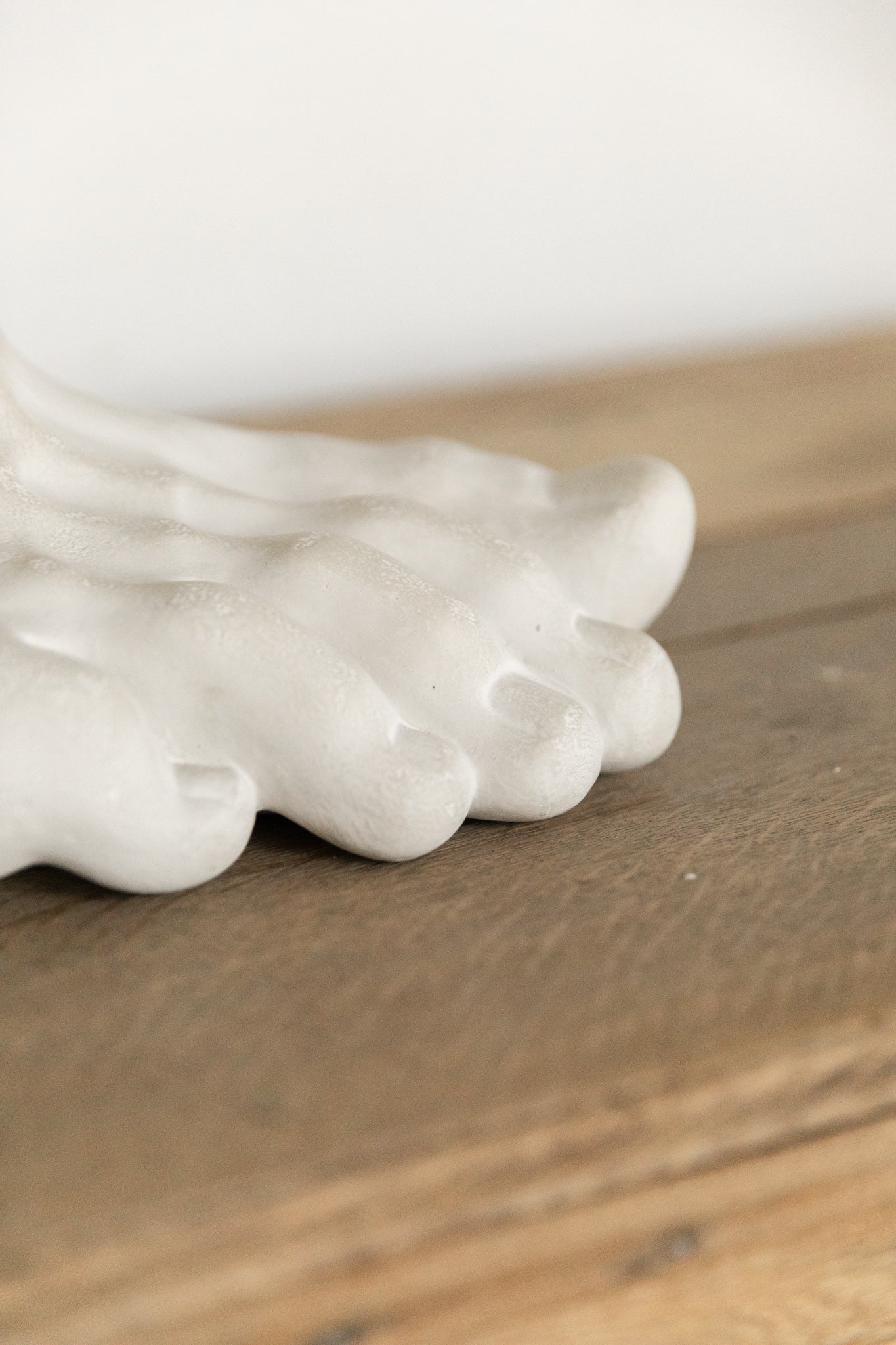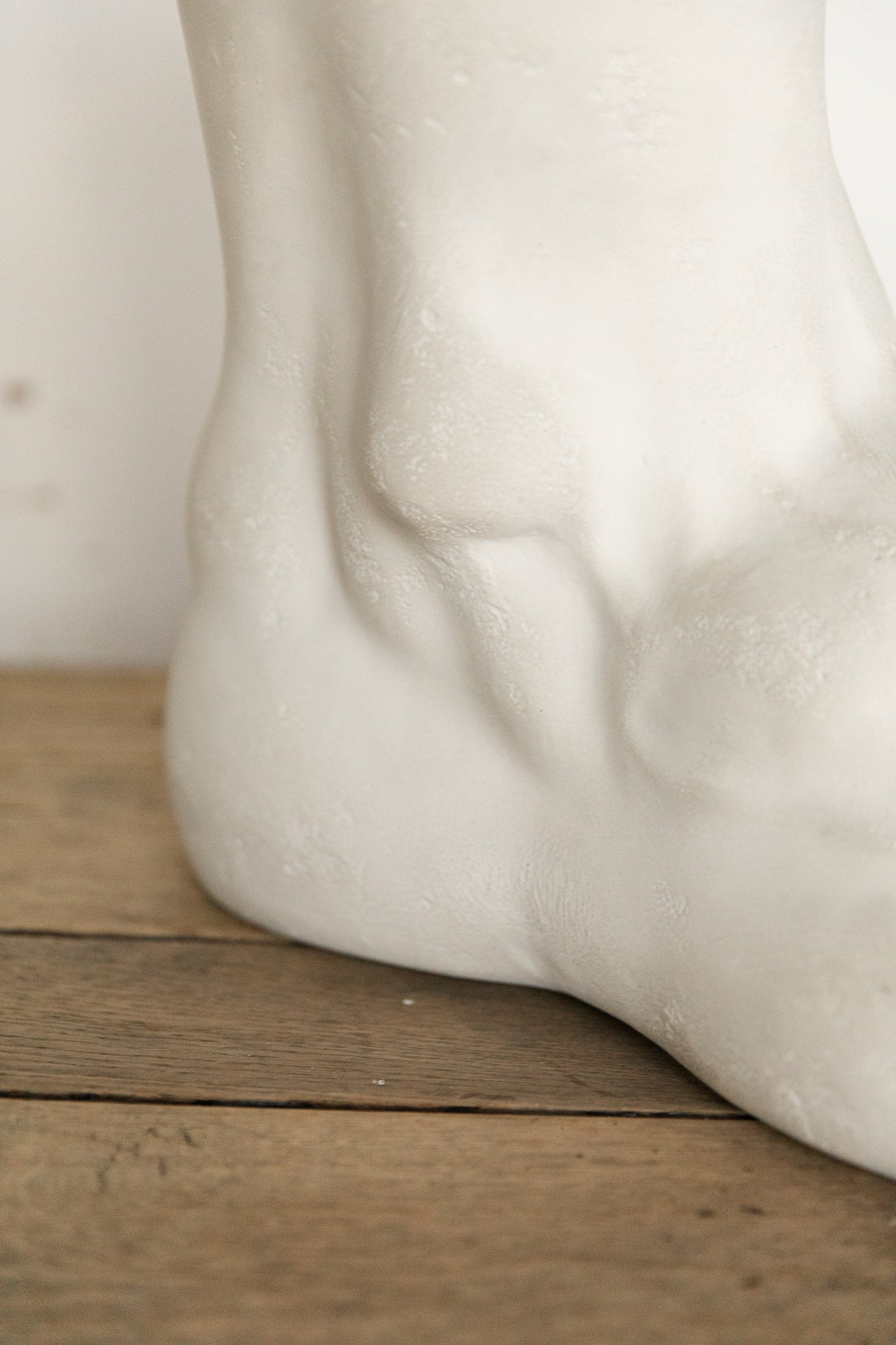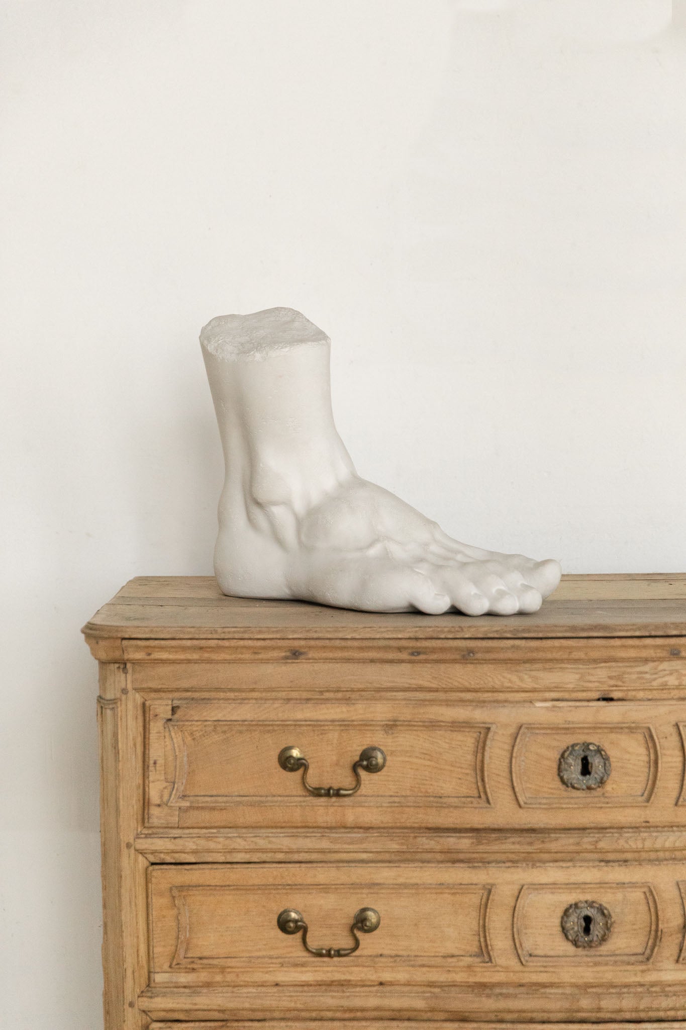 Escultura decorativa realizada en escayola moldeada, con forma de pie. La superficie conserva la textura característica del material, mate y porosa, que resalta las sombras y el modelado.
