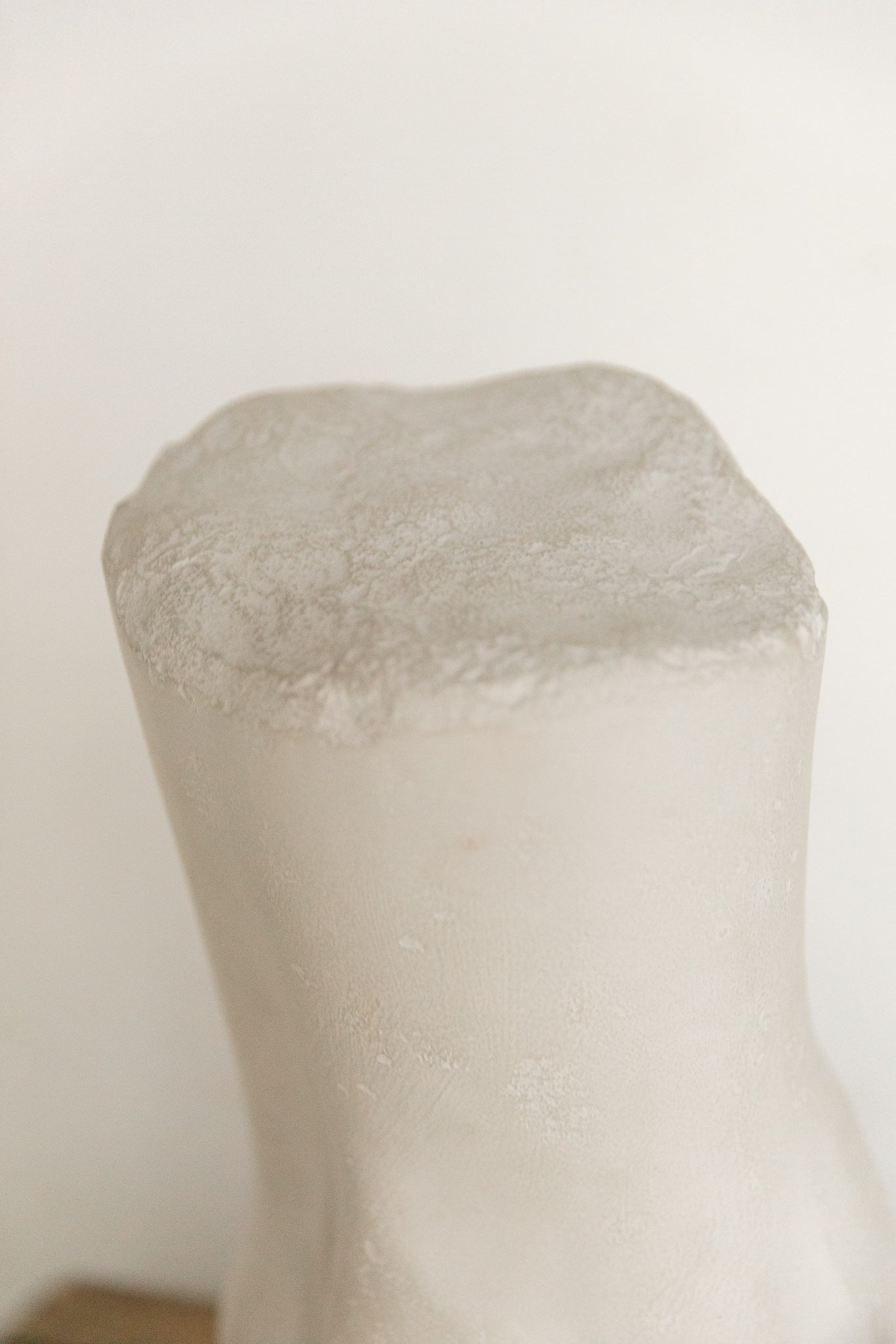 La escayola, tradicionalmente utilizada en talleres de arte y estudios de escultura, aporta ligereza y permite apreciar la pureza del volumen.