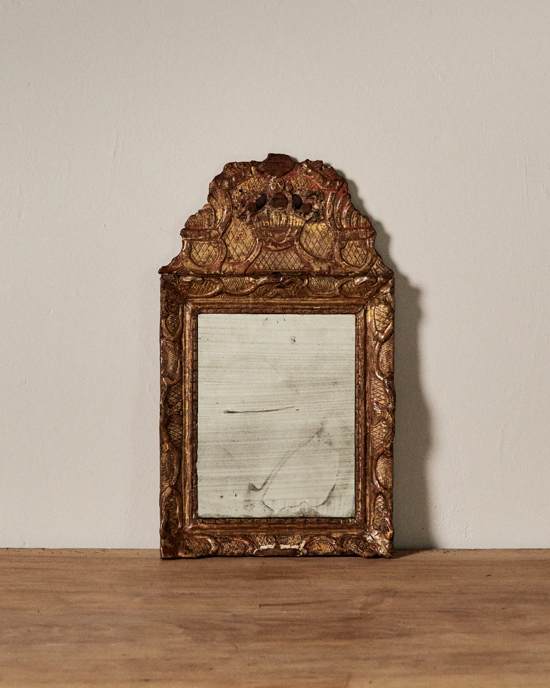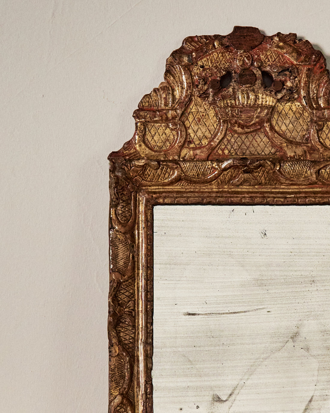 Espejo francés de madera tallada del siglo XVIII, con un marco ornamentado mediante motivos decorativos.