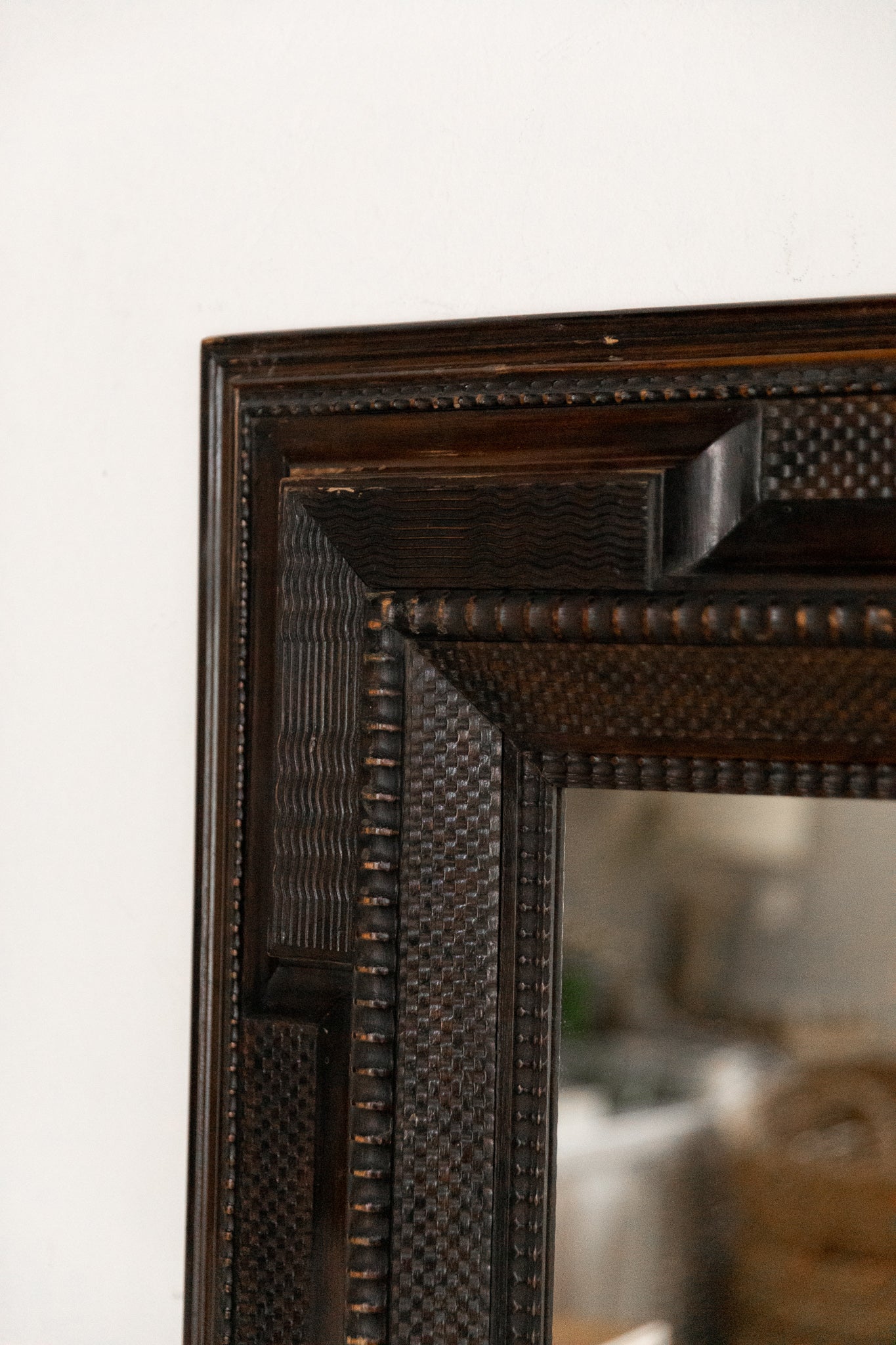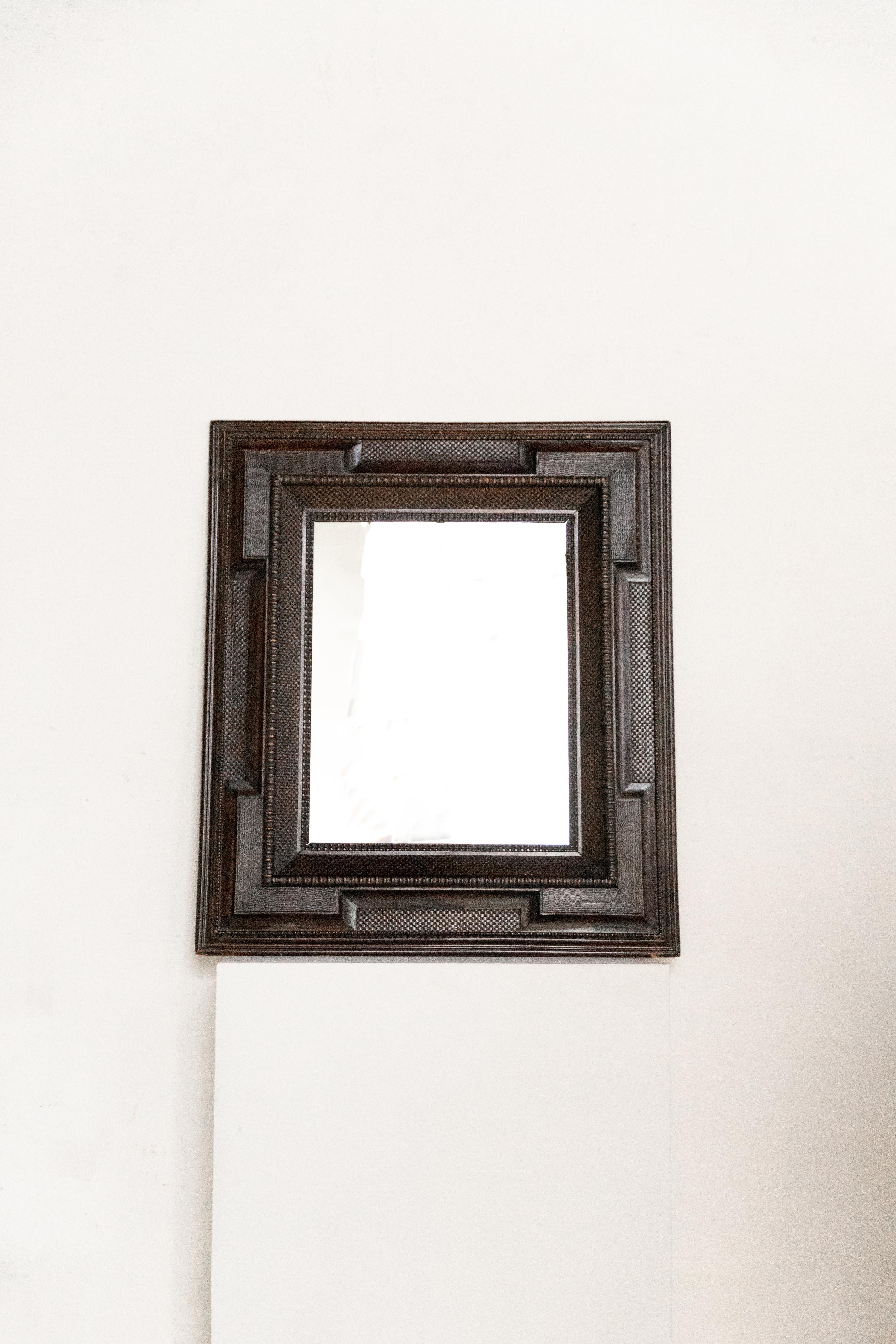 Espejo de madera holandés decorado con elementos de talla artística del siglo XIX, una pieza que combina funcionalidad y maestría artesanal.