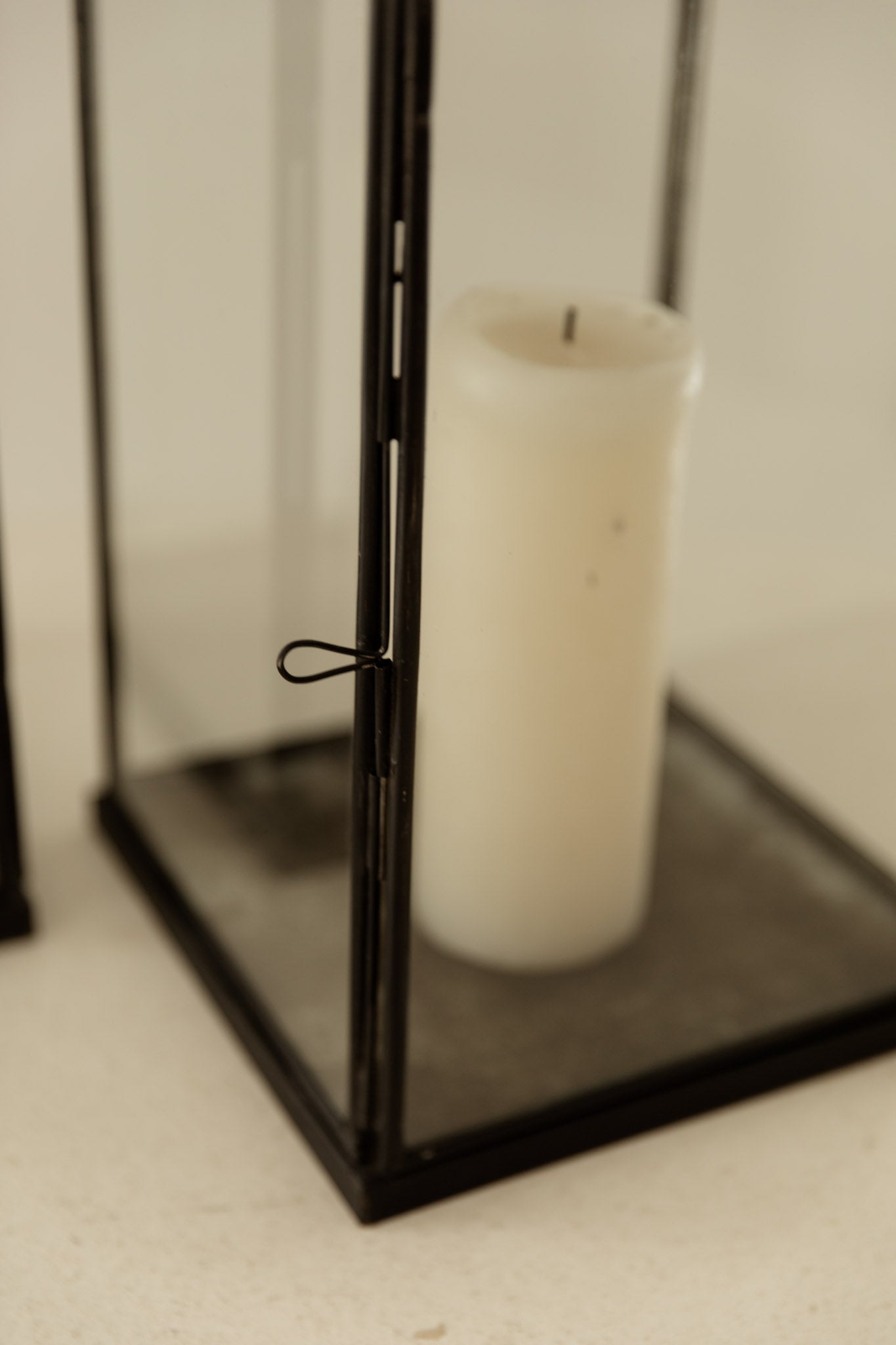 Farol con asa fabricado de manera artesanal en metal con acabado negro mate y cristal traslúcido.