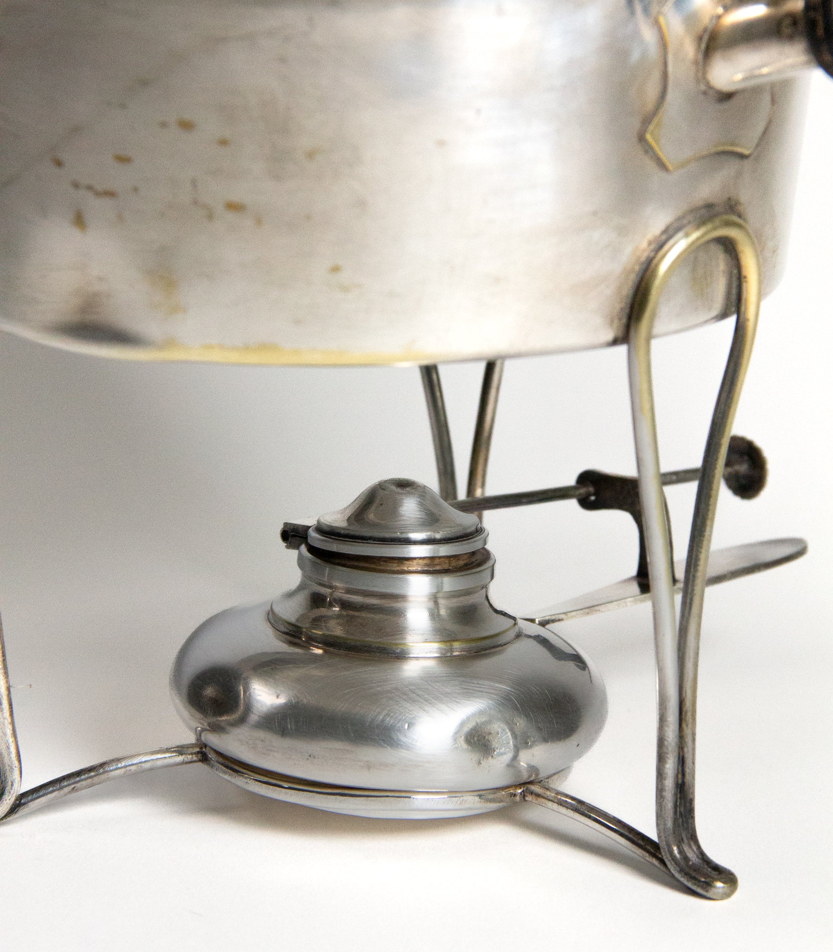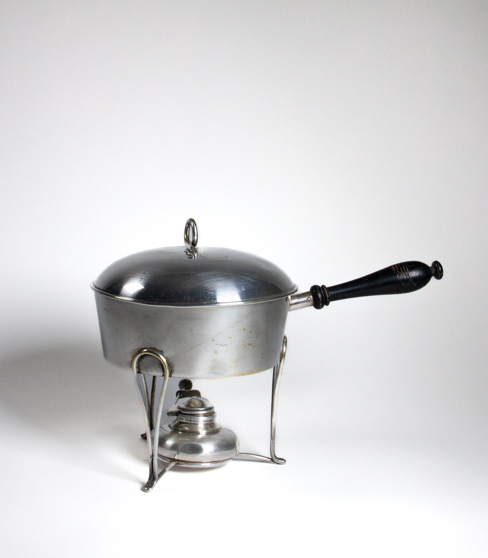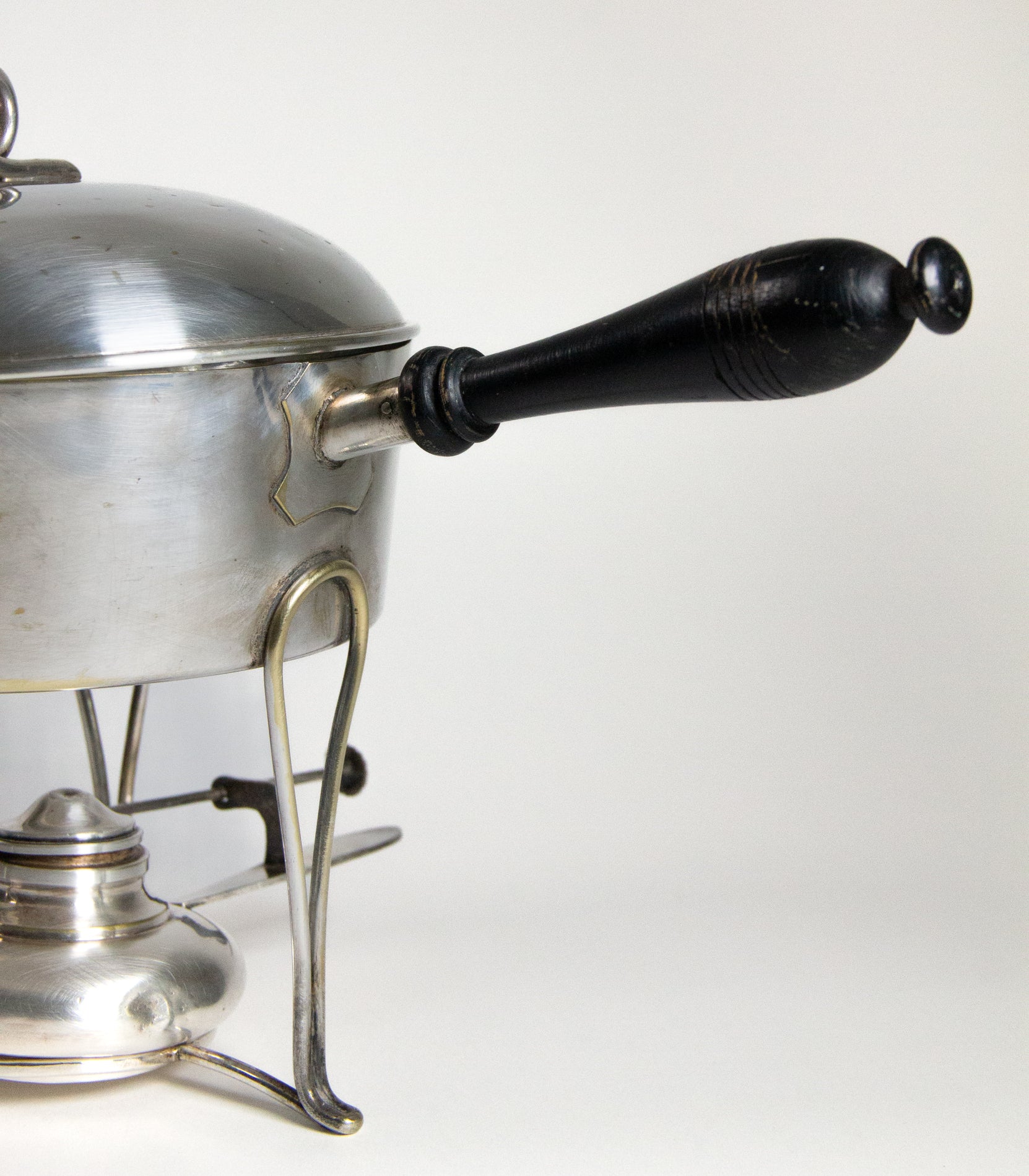Fuente de metal plateado del siglo XV, diseñada para mantener los alimentos calientes en la mesa.
