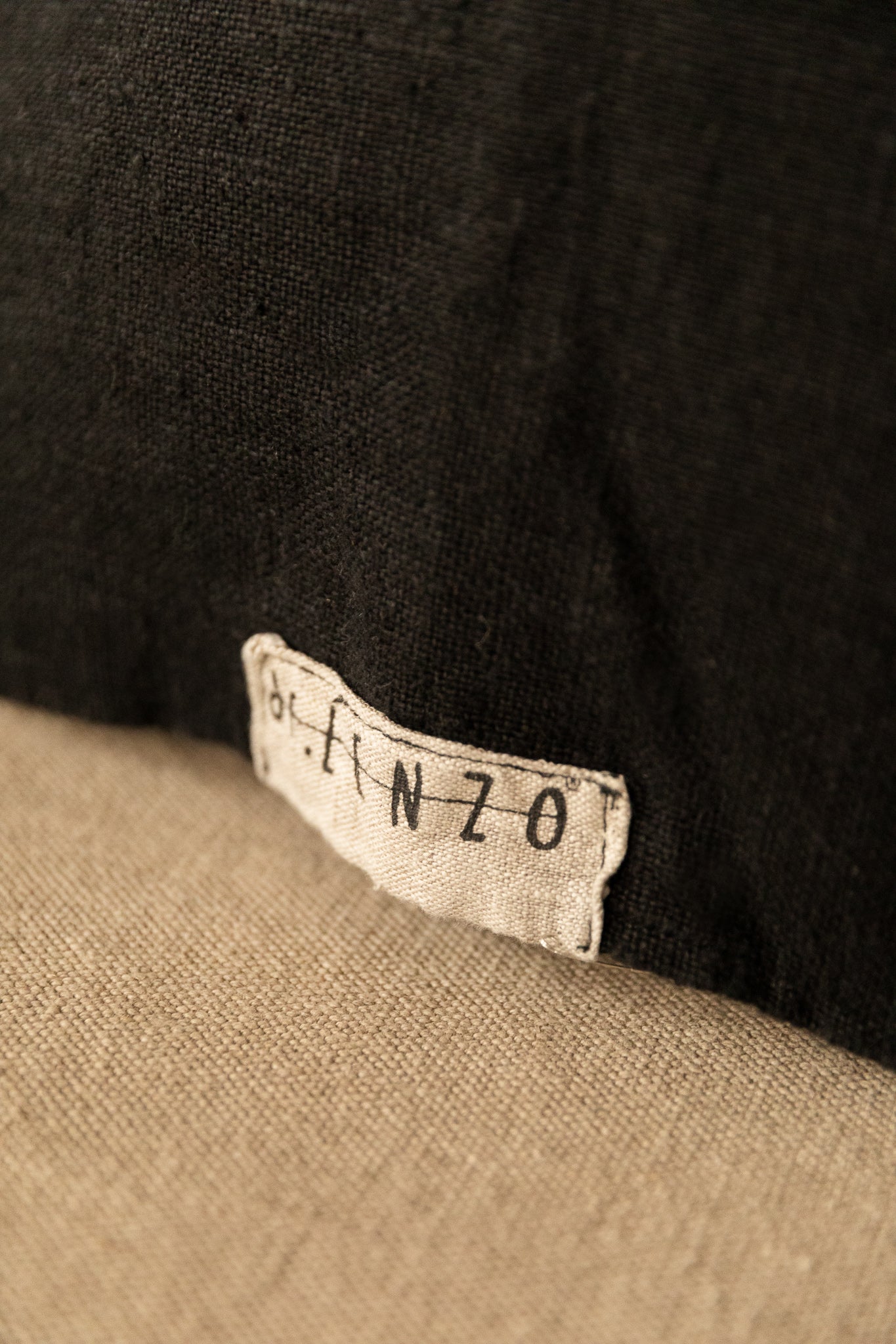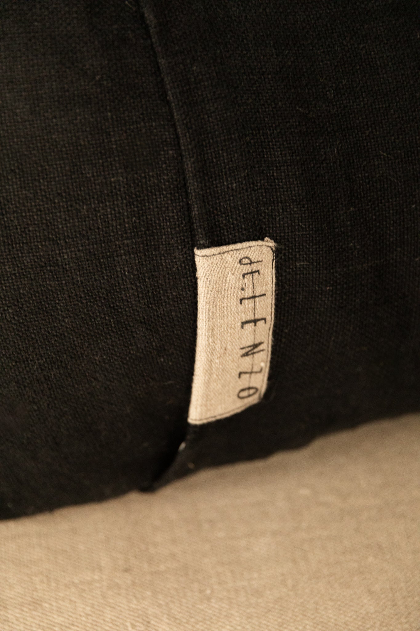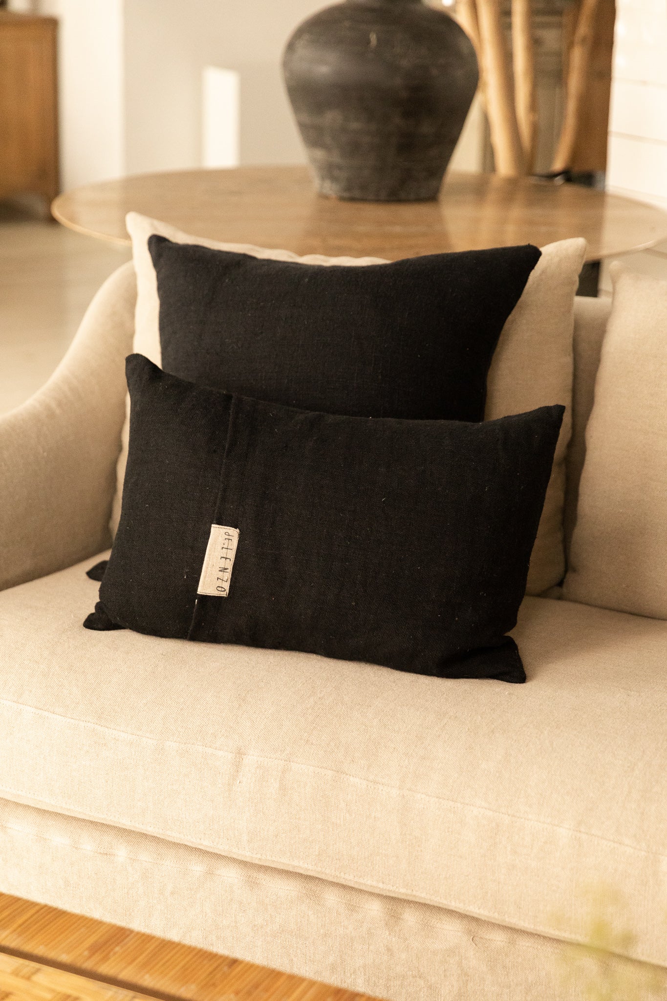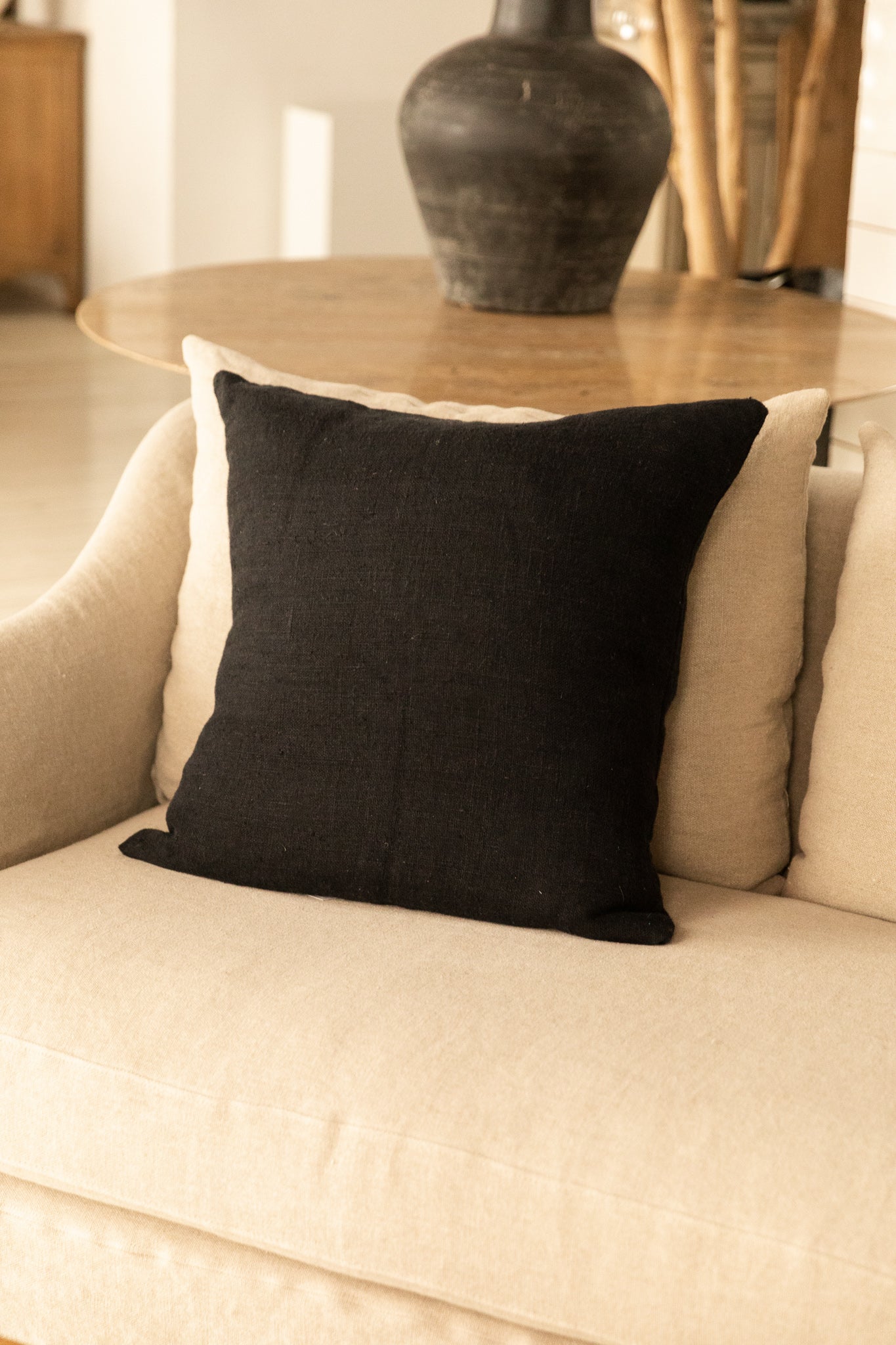 Funda de cojín en lino color negro con cierre envelope de la colección Formentera. Fabricado de manera artesanal en lino 100% en España. Nuestro lino cuenta con la certificación OEKO-TEX Standard 100 (certificado nº 2021OK068), que garantiza un proceso textil respetuoso y seguro.