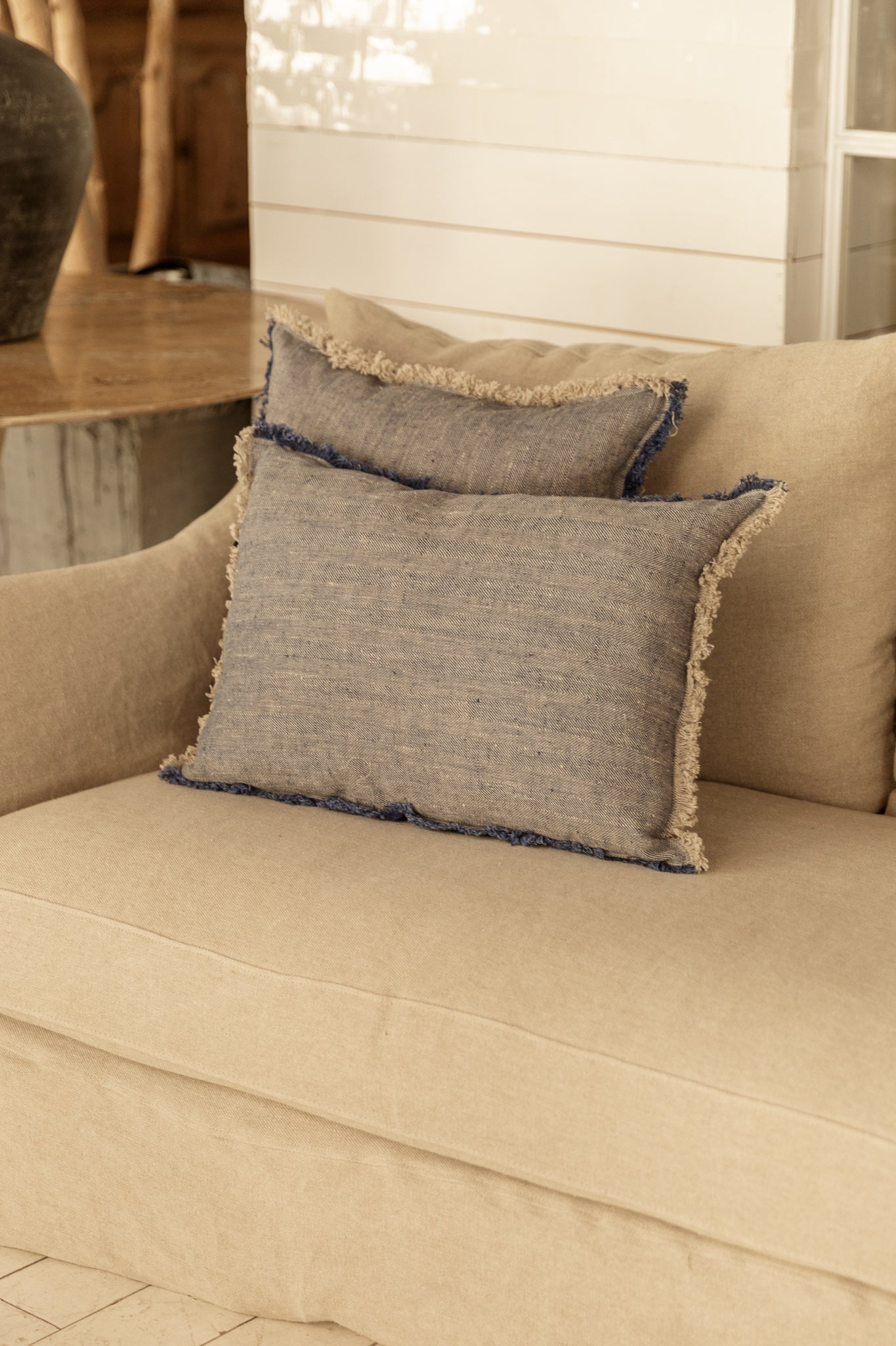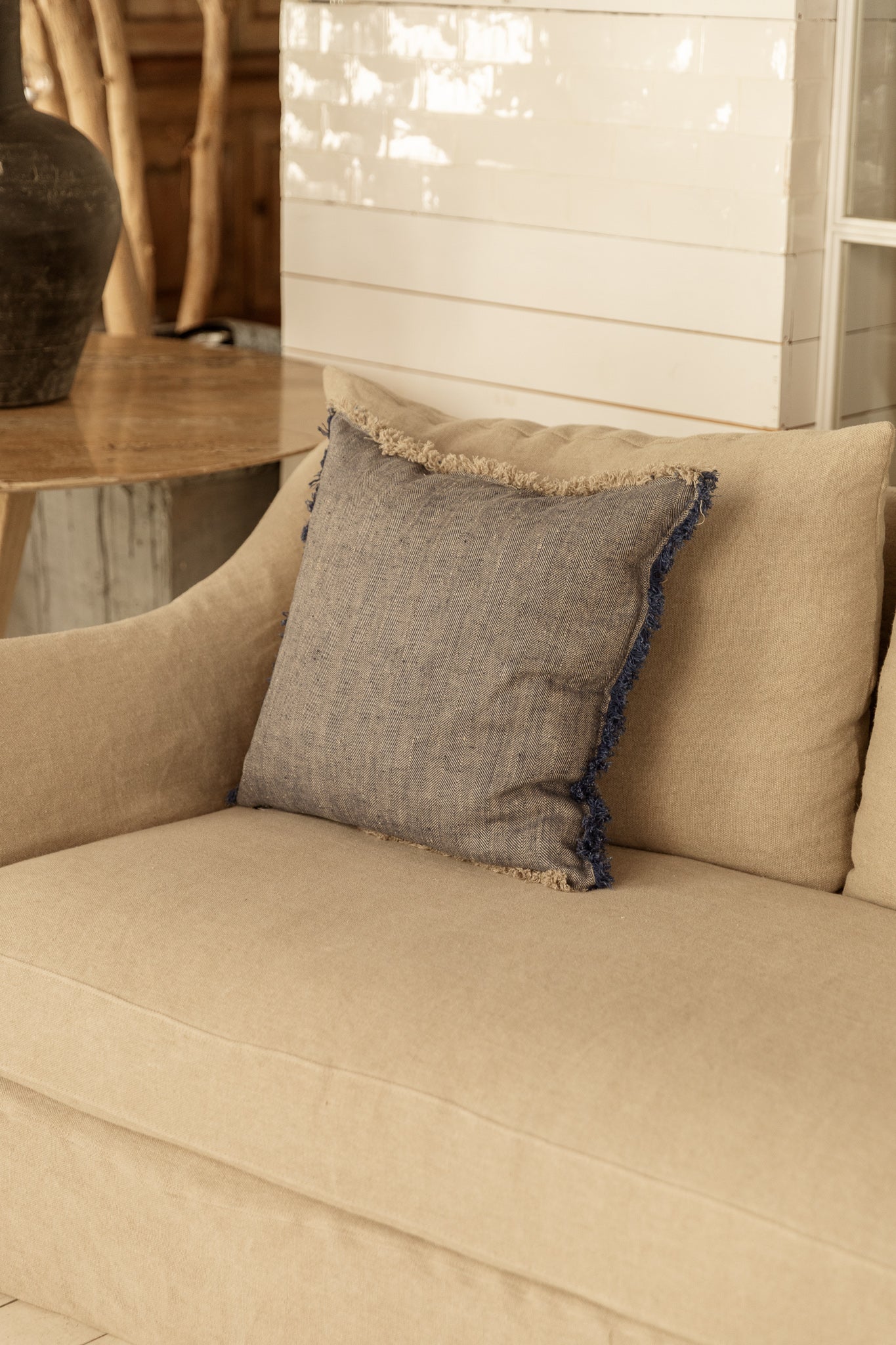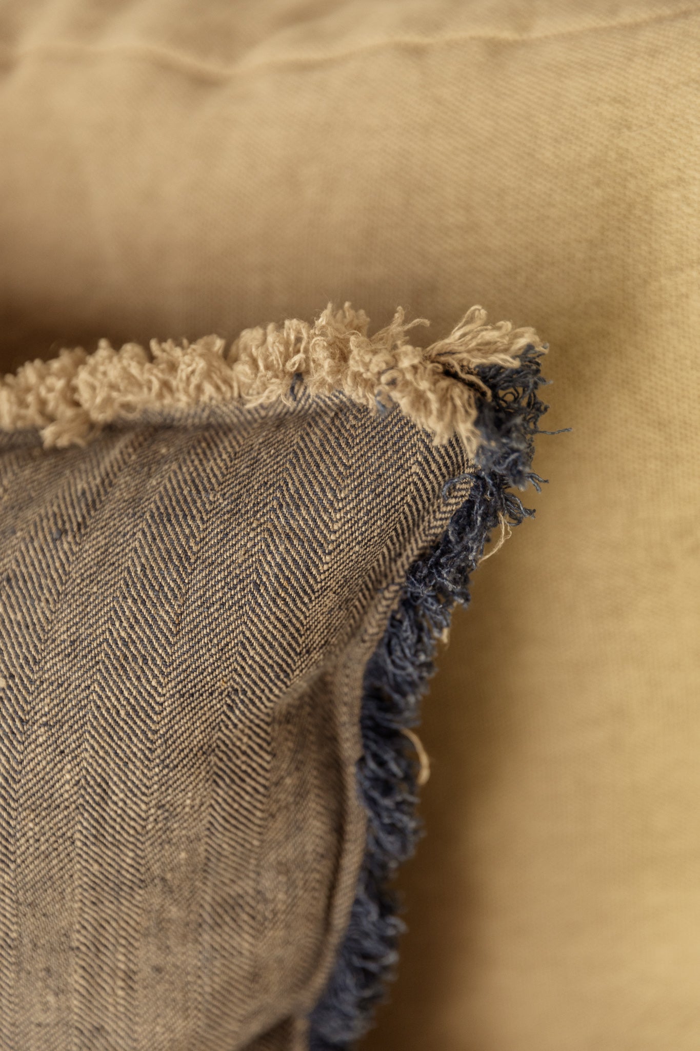 Funda de cojín en lino color azul acabado desflecado de la colección Jaipur. Fabricado de manera artesanal en lino 100% en España. Nuestro lino cuenta con la certificación OEKO-TEX Standard 100 (certificado nº 2021OK068), que garantiza un proceso textil respetuoso y seguro.