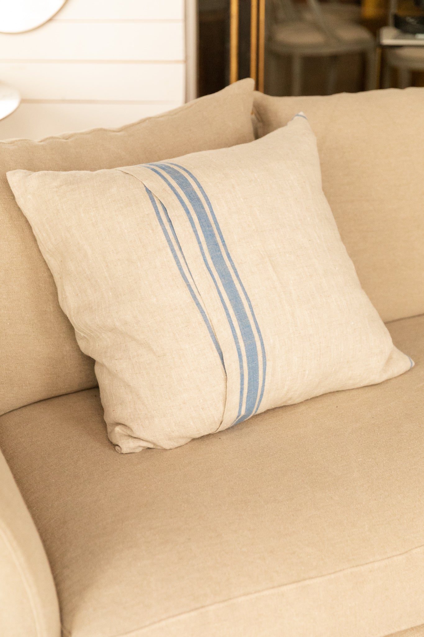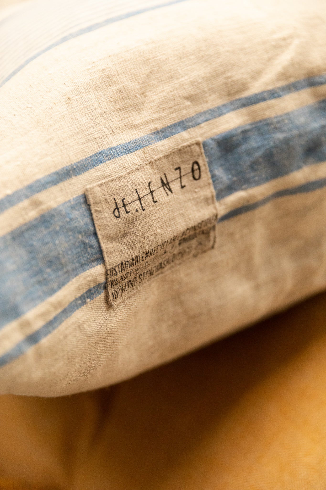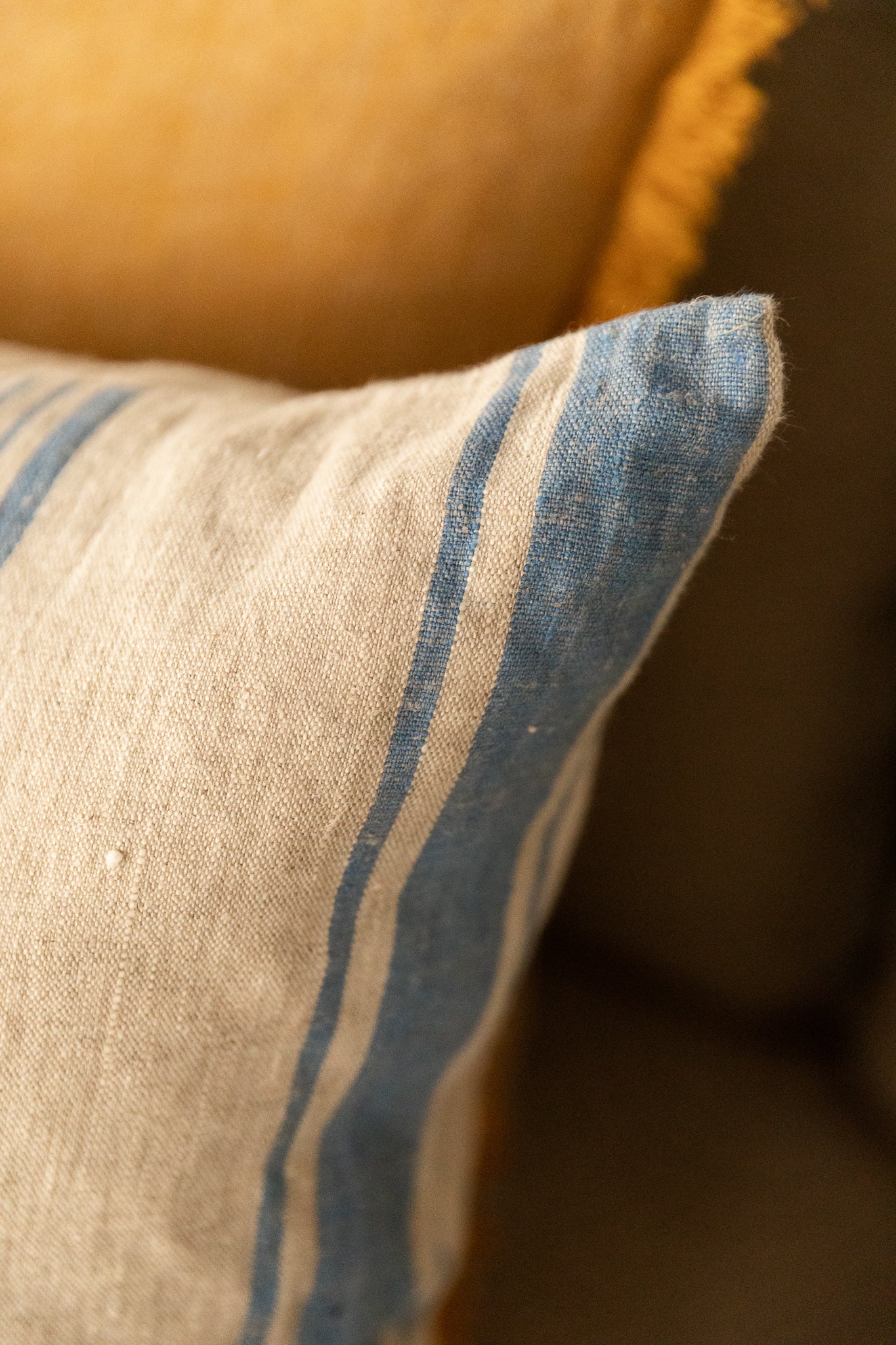 Funda de cojín en lino color natural con líneas azules. Fabricado de manera artesanal en lino 100% en España. Nuestro lino cuenta con la certificación OEKO-TEX Standard 100 (certificado nº 2021OK068), que garantiza un proceso textil respetuoso y seguro.