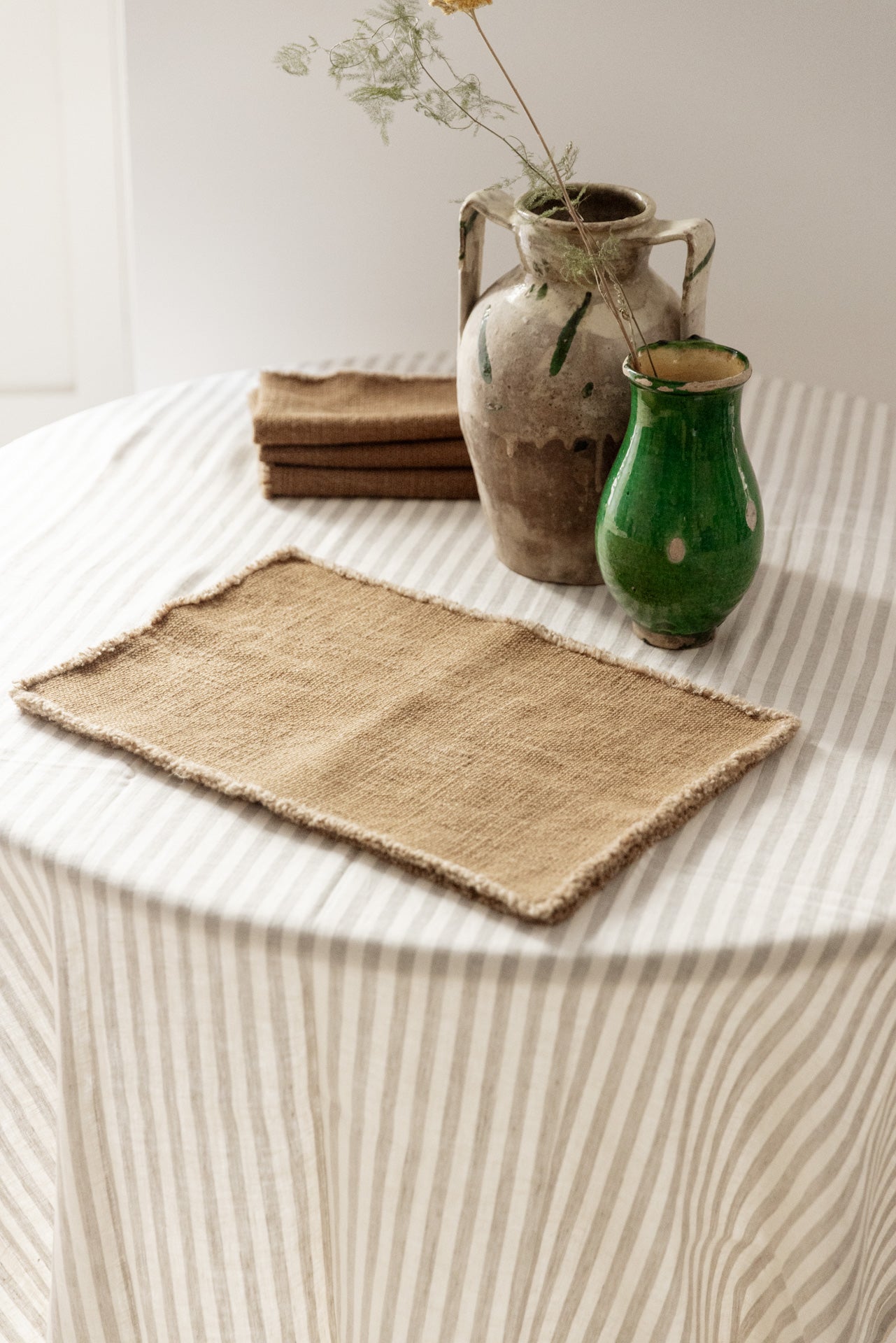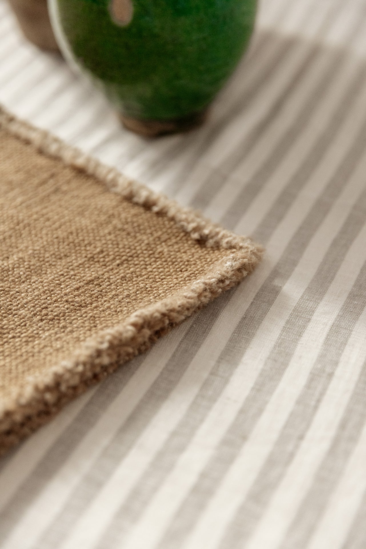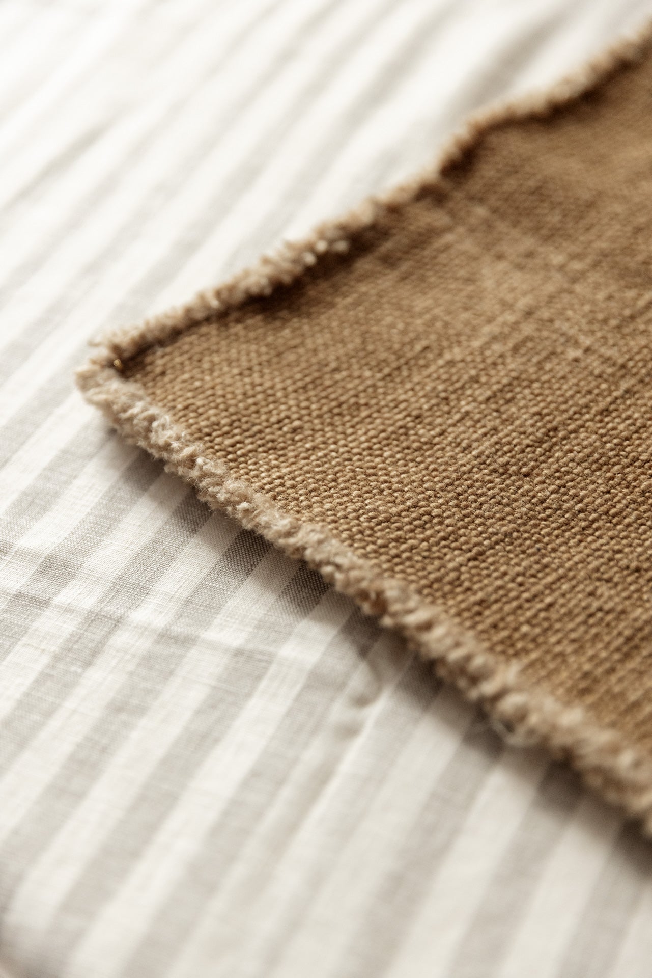 Individual confeccionado en una mezcla de lino y lana en tono tierra, elaborado artesanalmente en Bélgica. Su tejido combina la frescura del lino con la calidez de la lana, aportando cuerpo, textura y durabilidad.