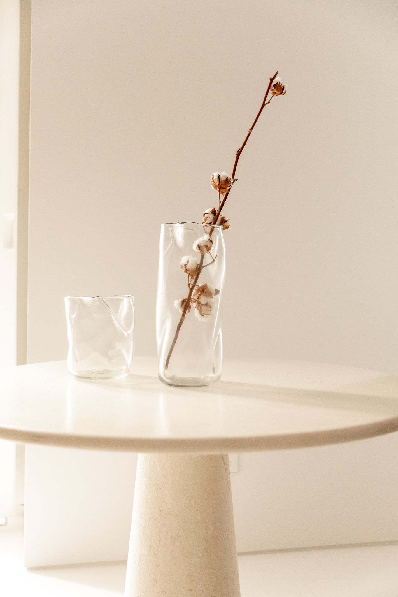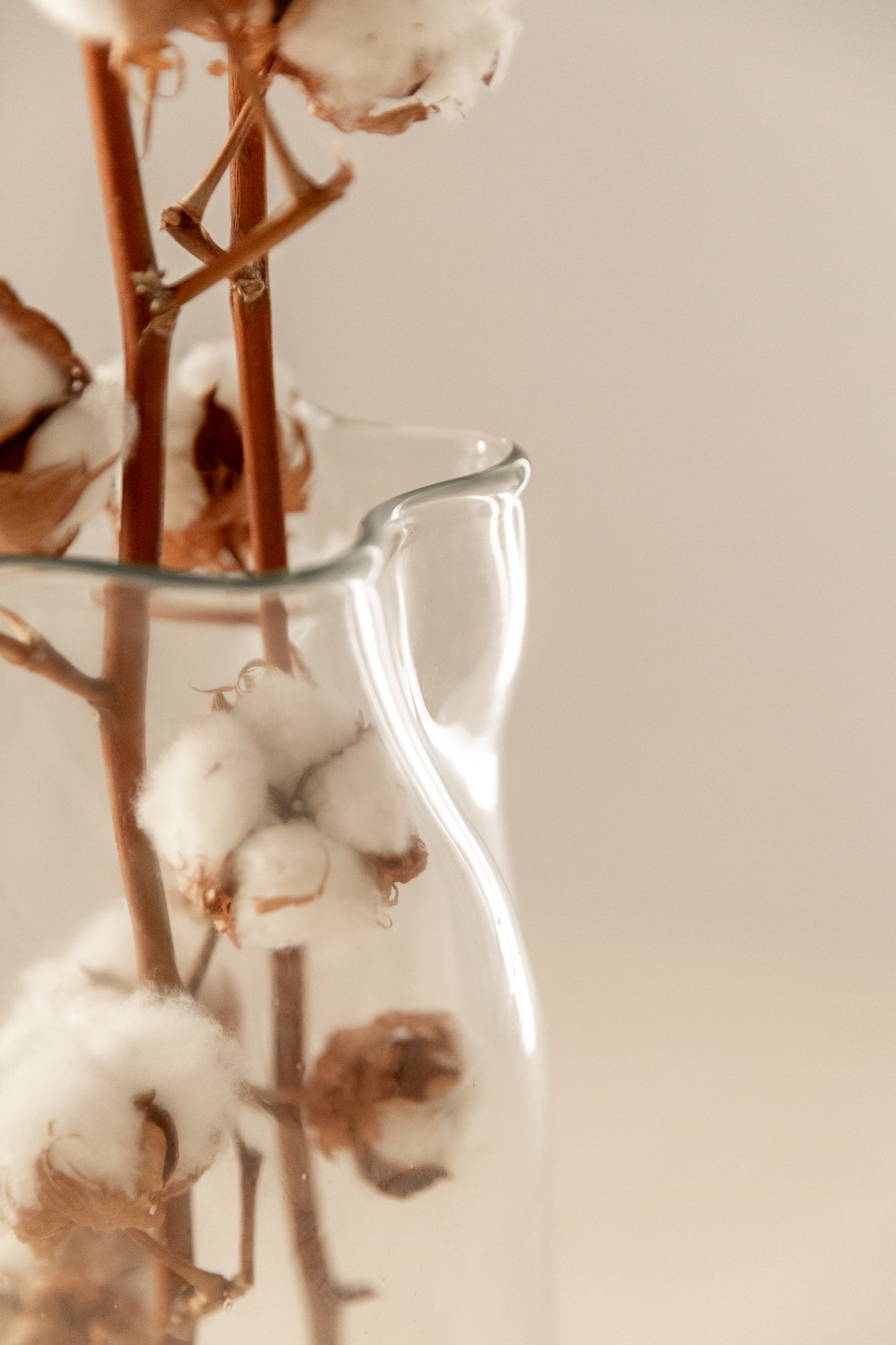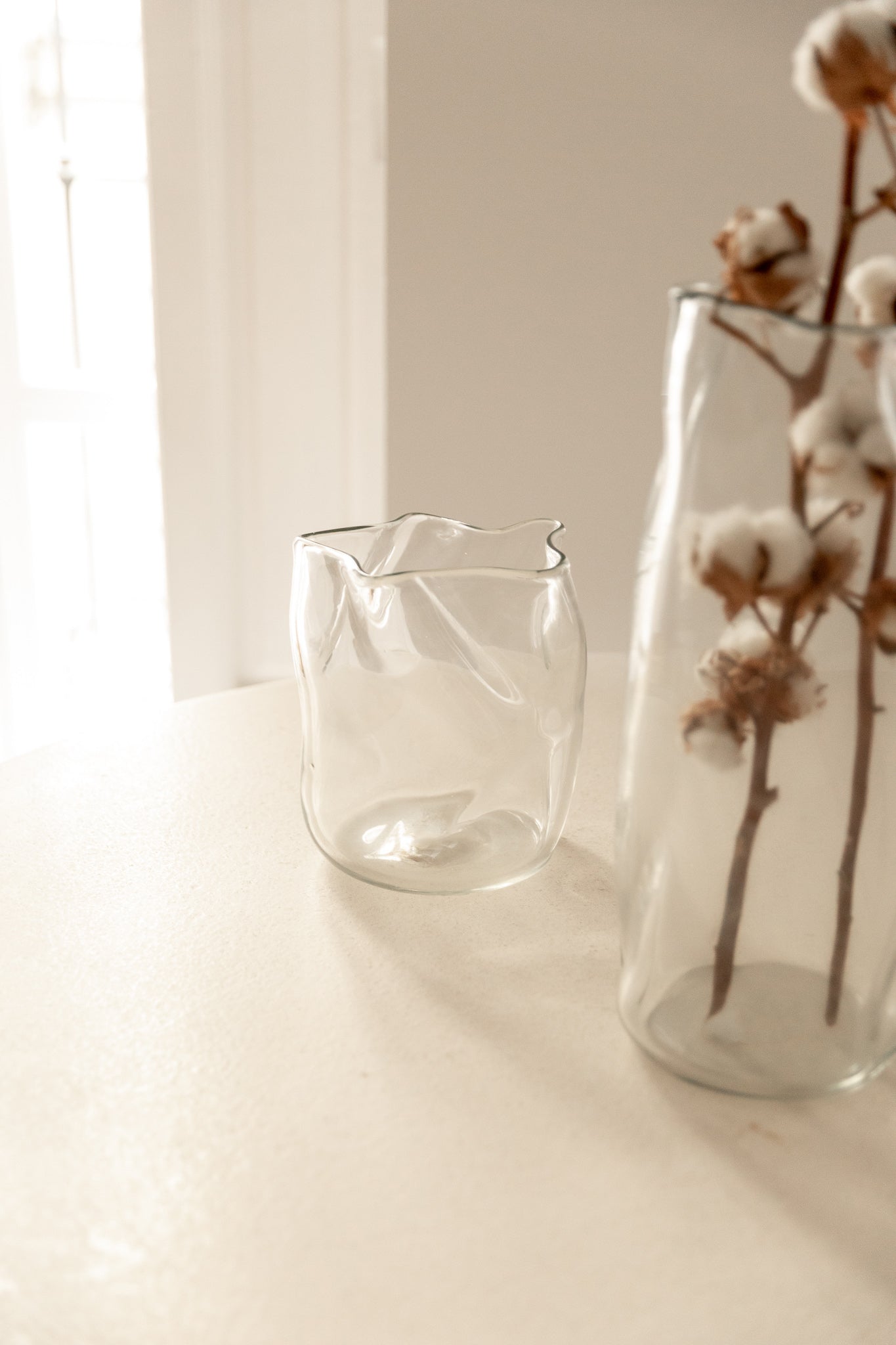 Jarrón de cristal con forma orgánica. Su diseño se inspira en las líneas suaves y fluidas de la naturaleza, creando una silueta que juega con la luz y las transparencias del material.