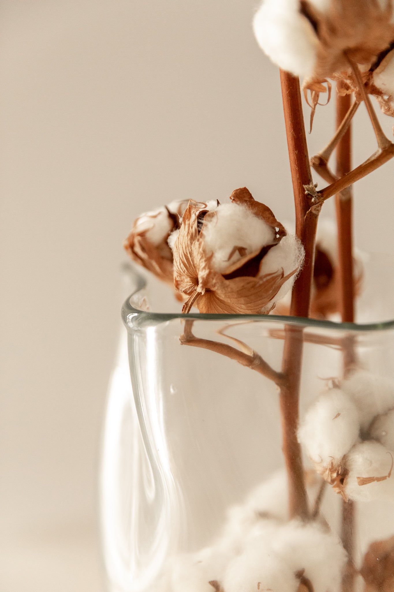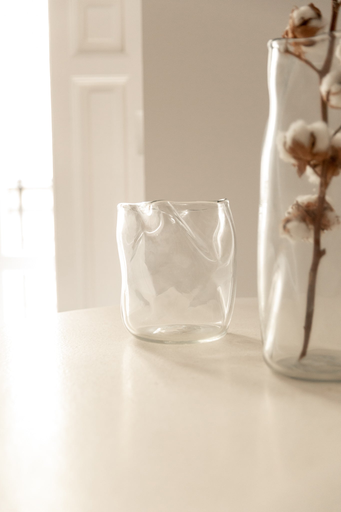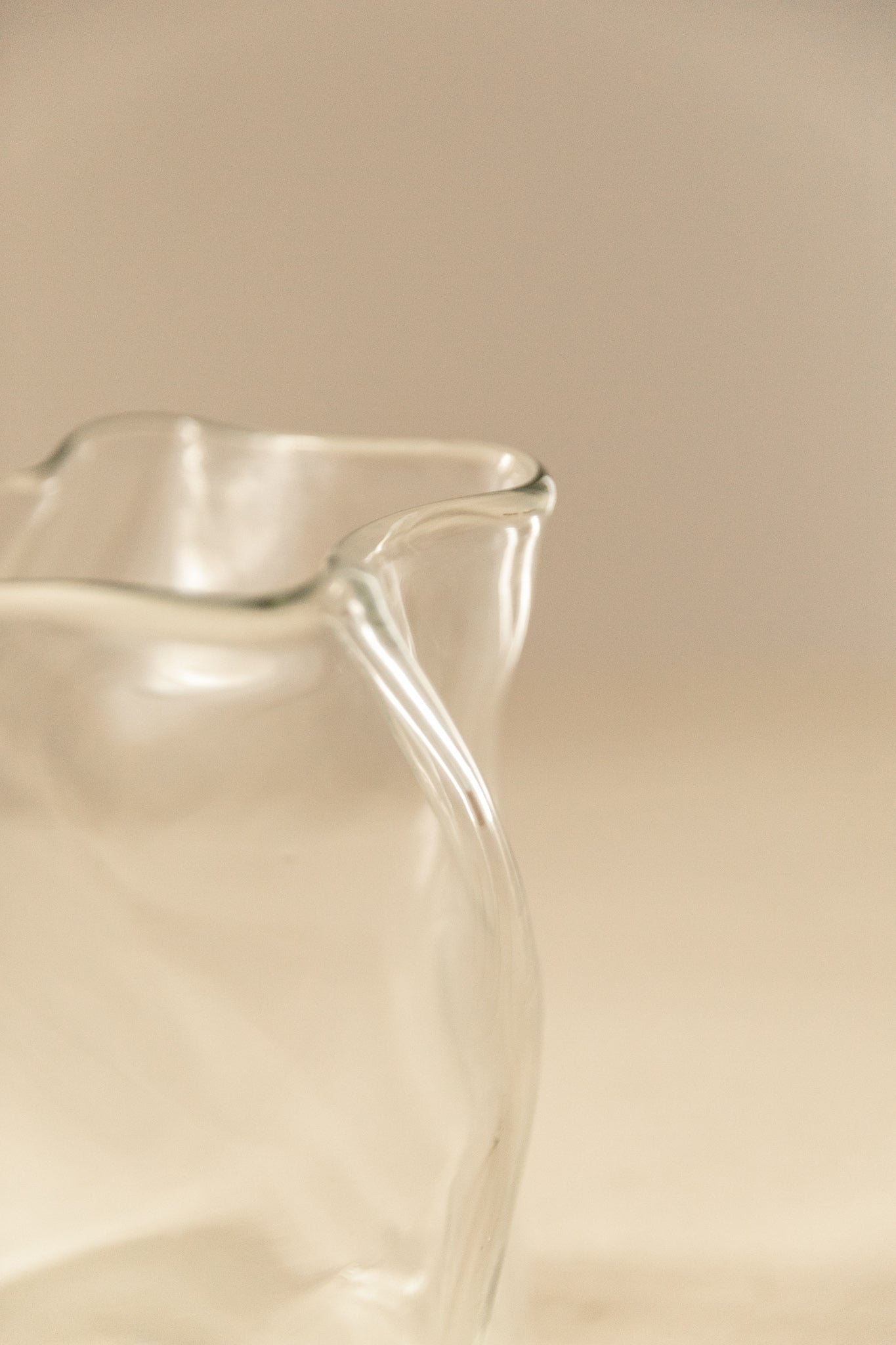 Jarrón de cristal con forma orgánica. Su diseño se inspira en las líneas suaves y fluidas de la naturaleza, creando una silueta que juega con la luz y las transparencias del material.