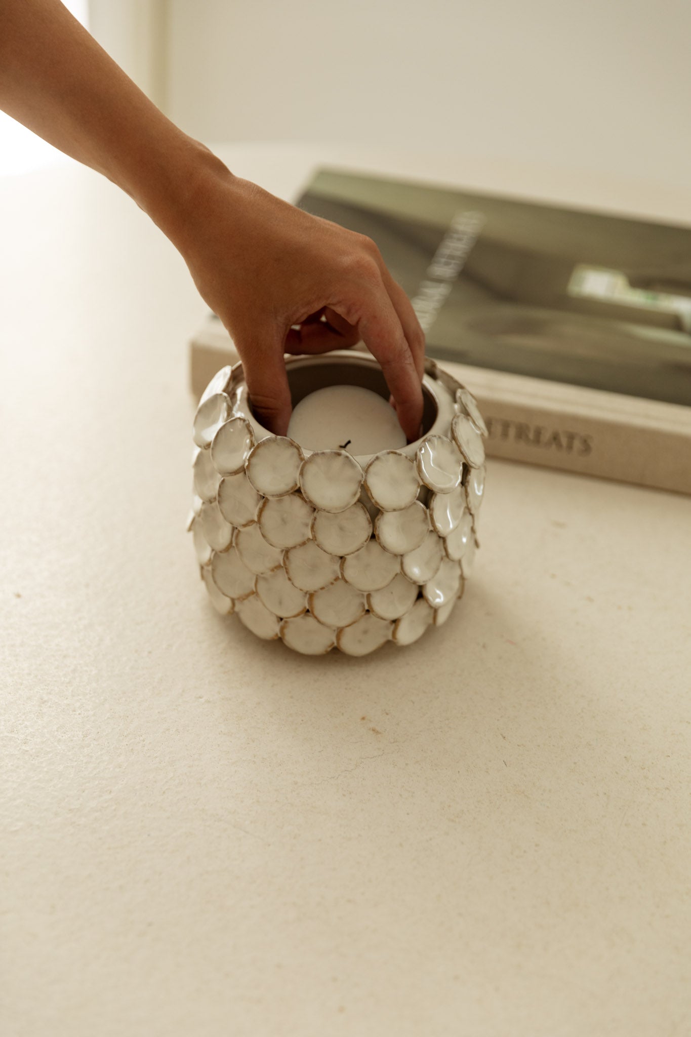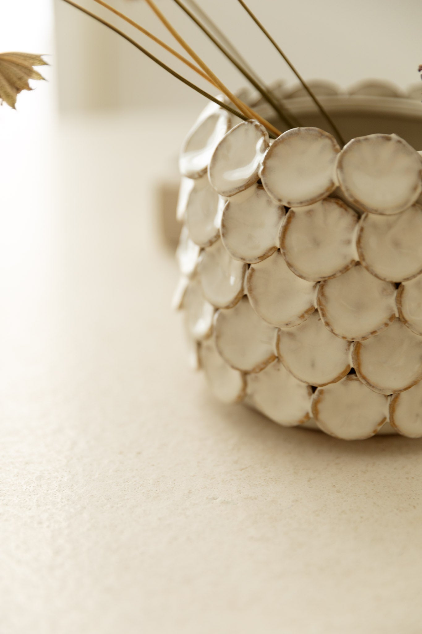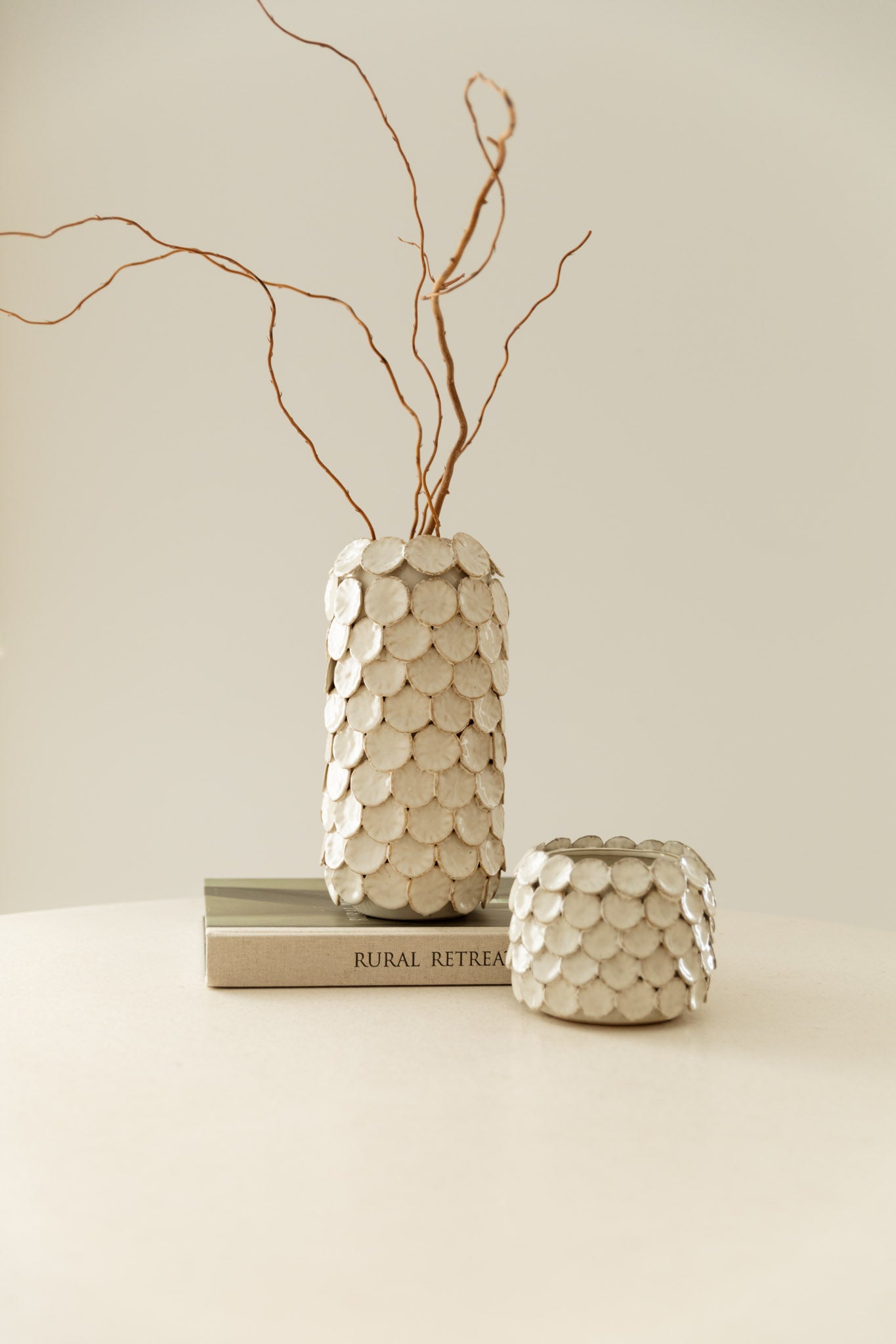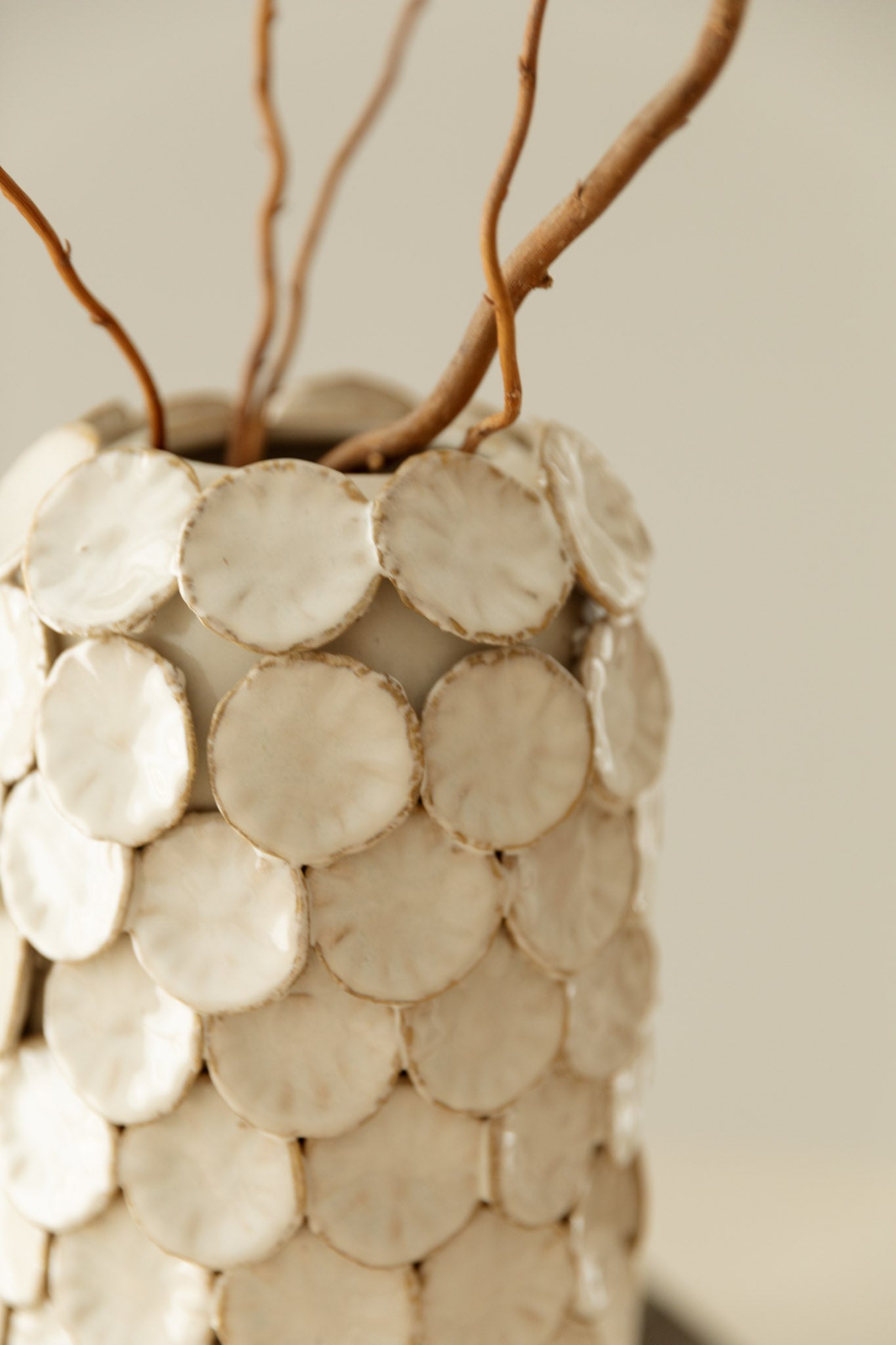 Jarrón cerámico esmaltado en blanco con acabado satinado. Su superficie lisa y uniforme, junto con el brillo sutil del acabado satinado, le confiere elegancia y modernidad, convirtiéndolo en un objeto decorativo versátil.
