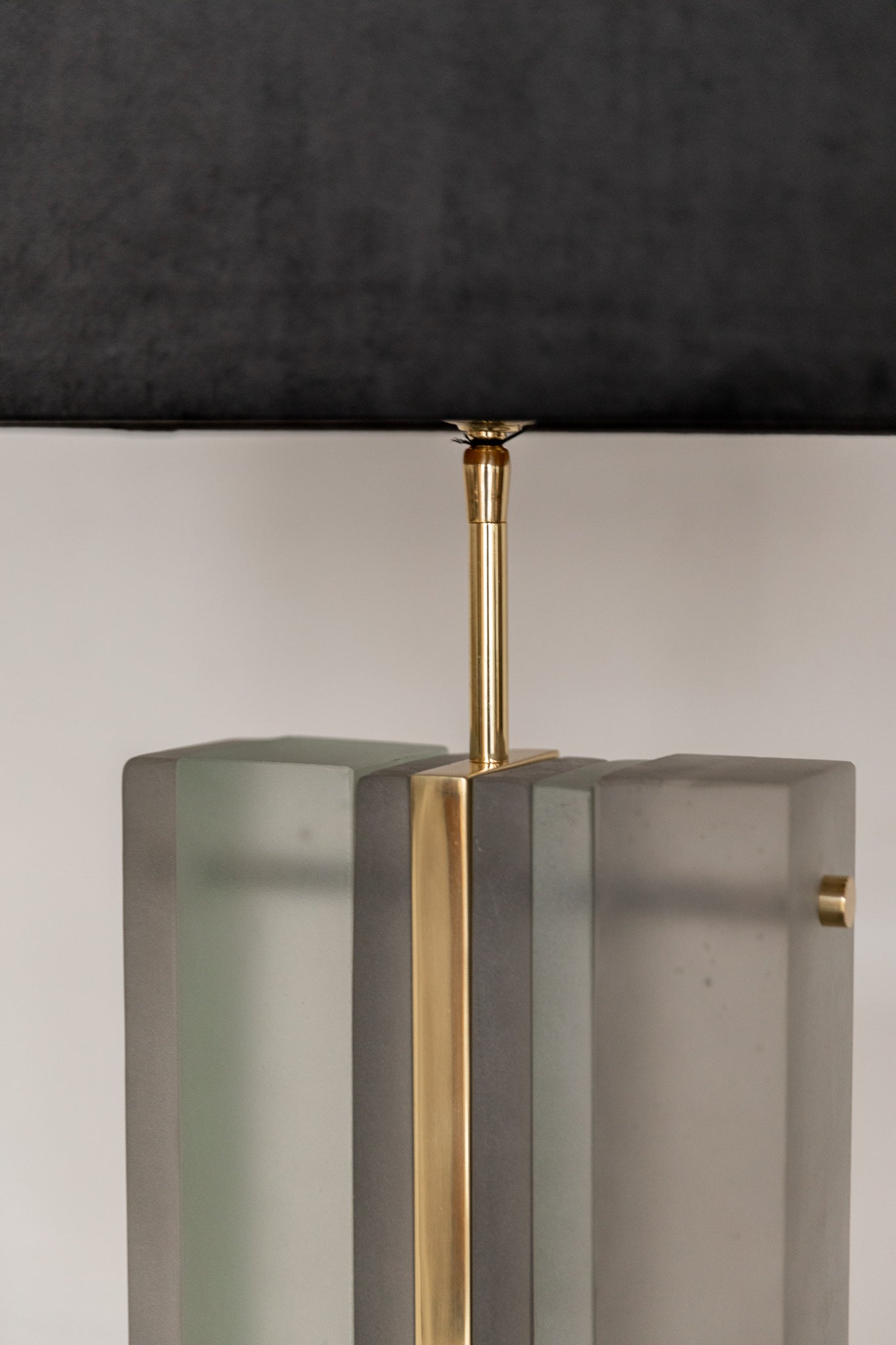 Lámpara de mesa elaborada artesanalmente en vidrio escarchado, con pantalla de terciopelo en color gris antracita.