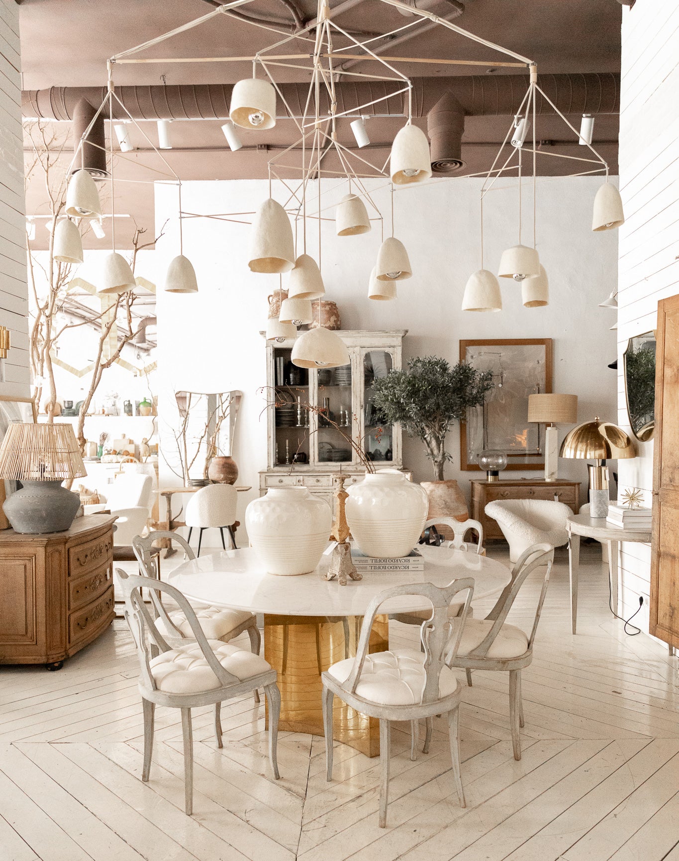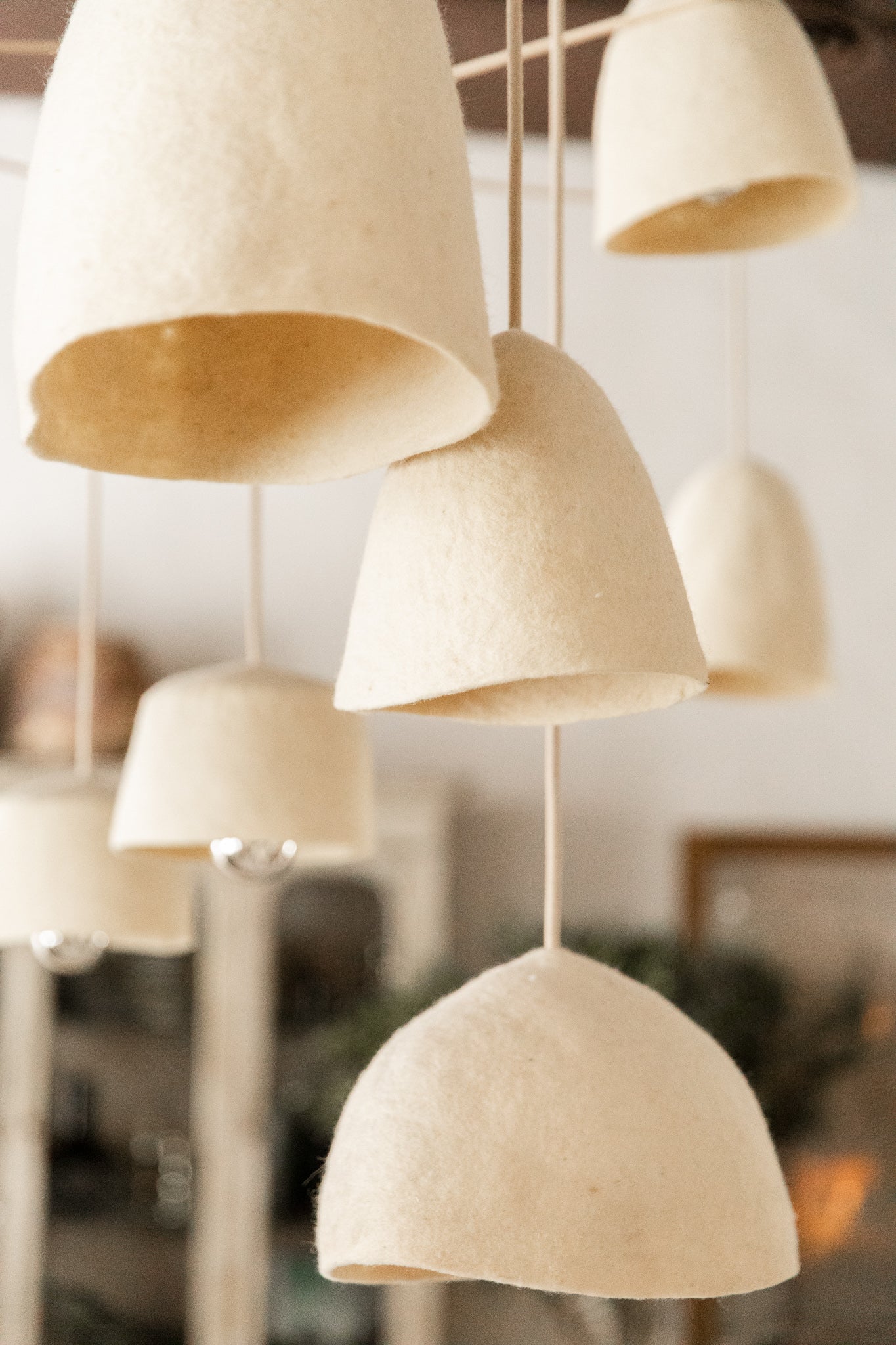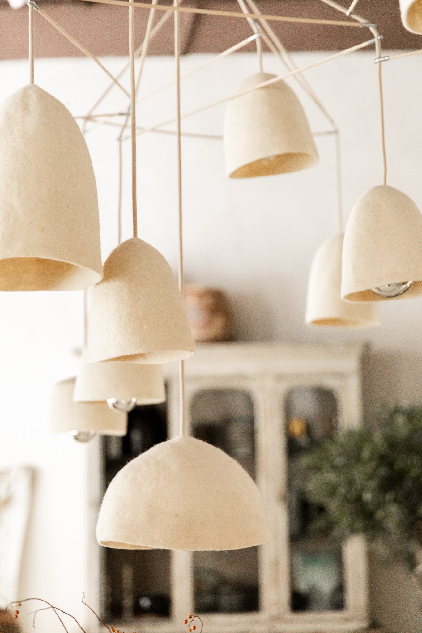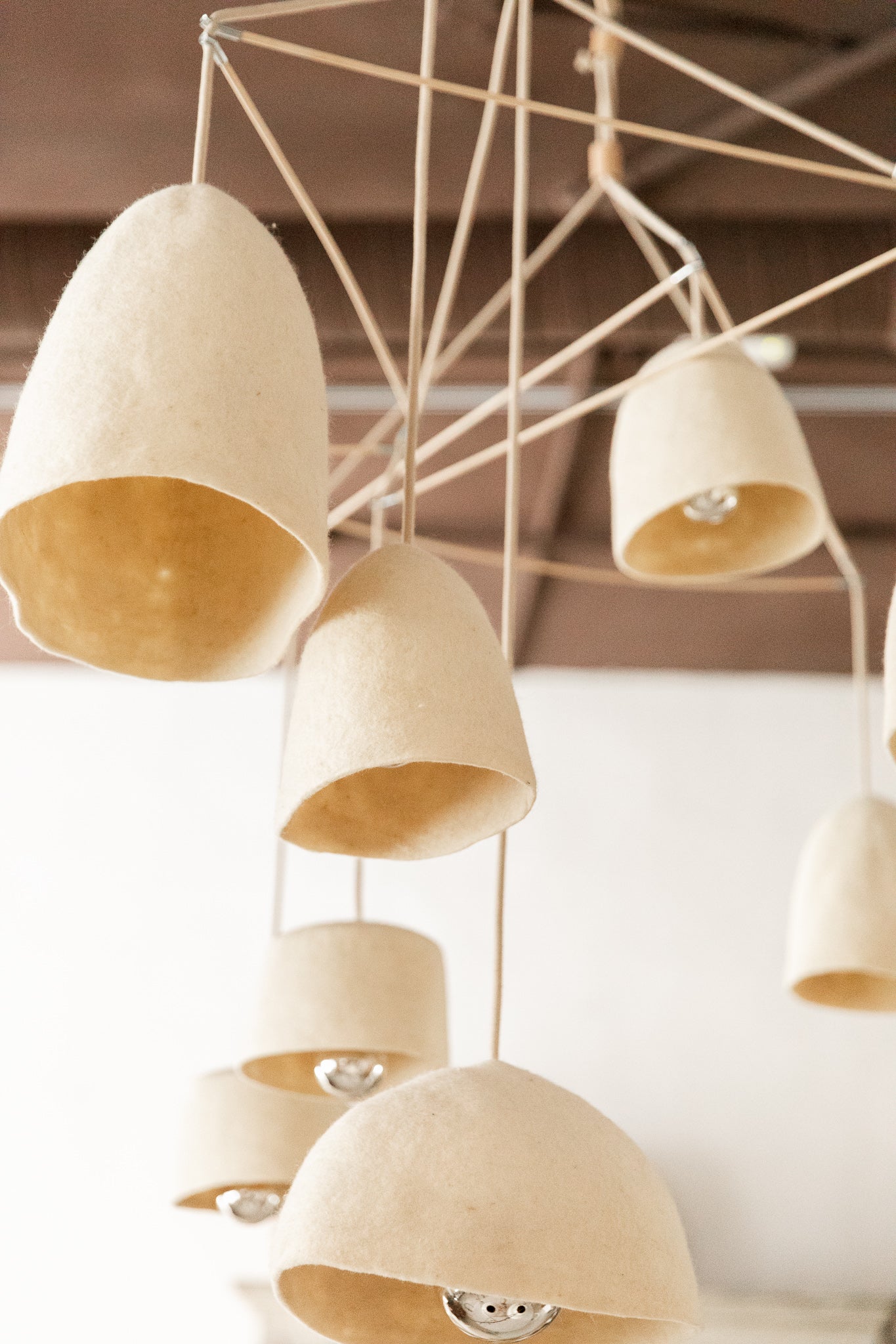 Lámpara de techo diseñada con dieciocho tulipas de fieltro sostenidas por una estructura de cuerda natural. Su composición artesanal combina materiales orgánicos y texturas suaves, creando una pieza de gran presencia visual y calidez ambiental.