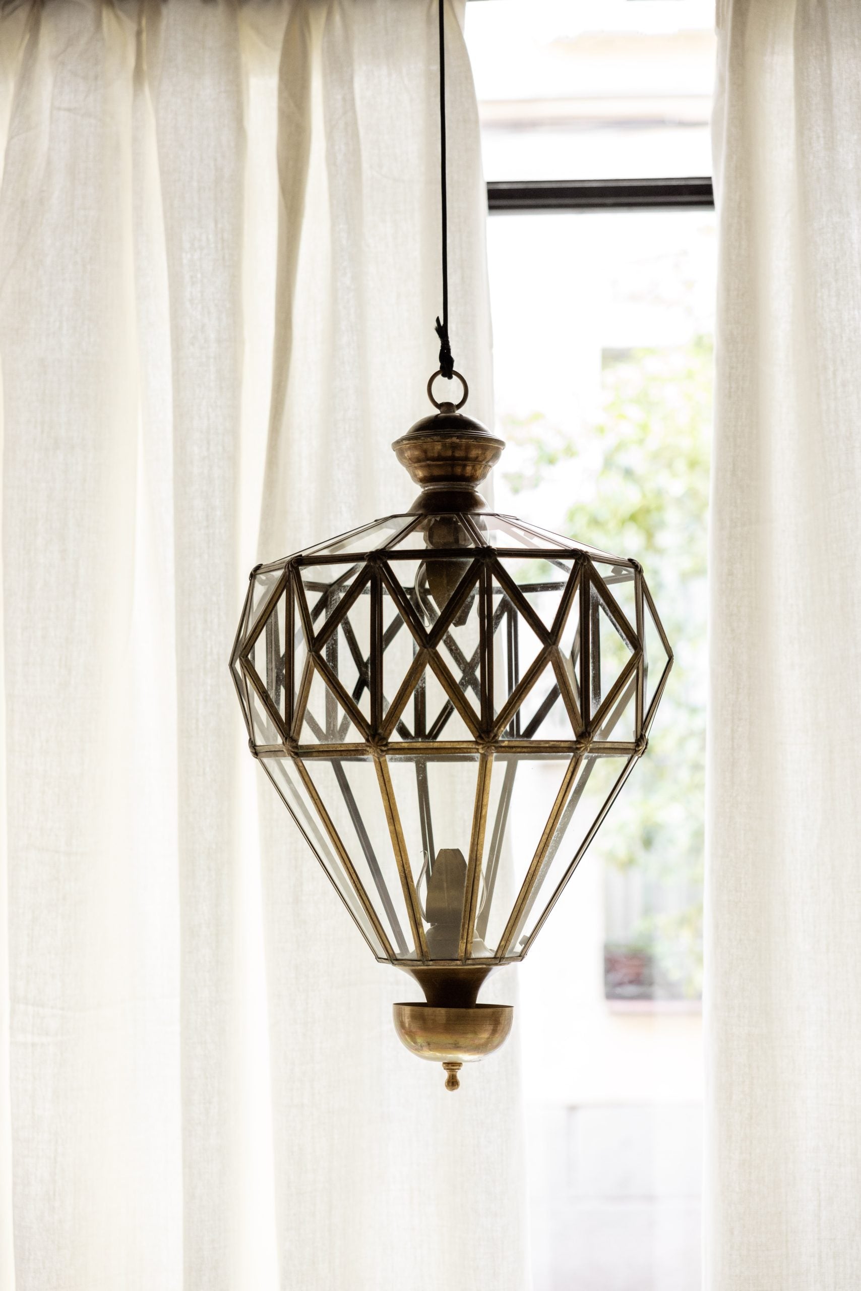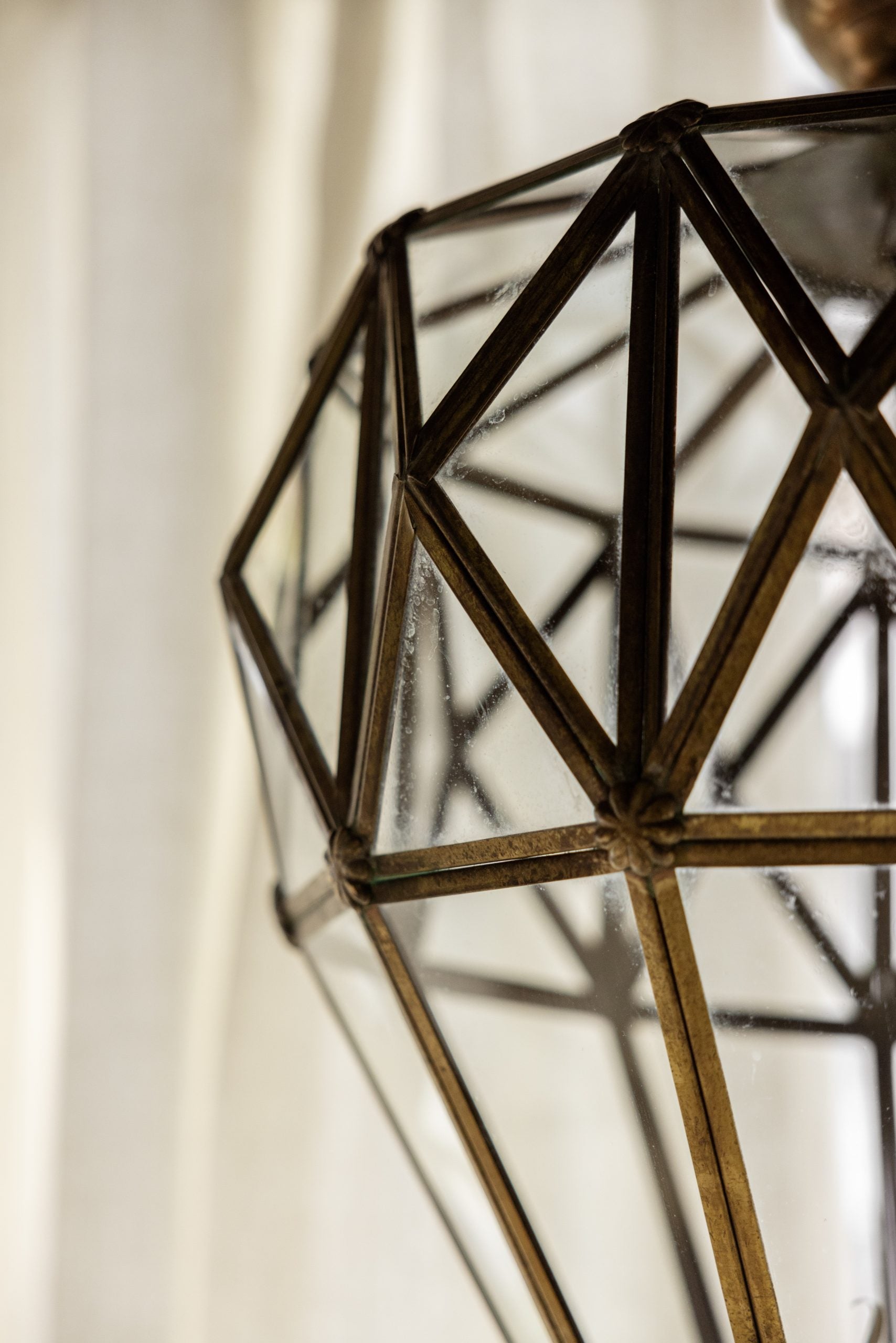 Lámpara de techo tipo farol con diseño de punta de diamante, elaborada en metal con estructura geométrica y cristales biselados.