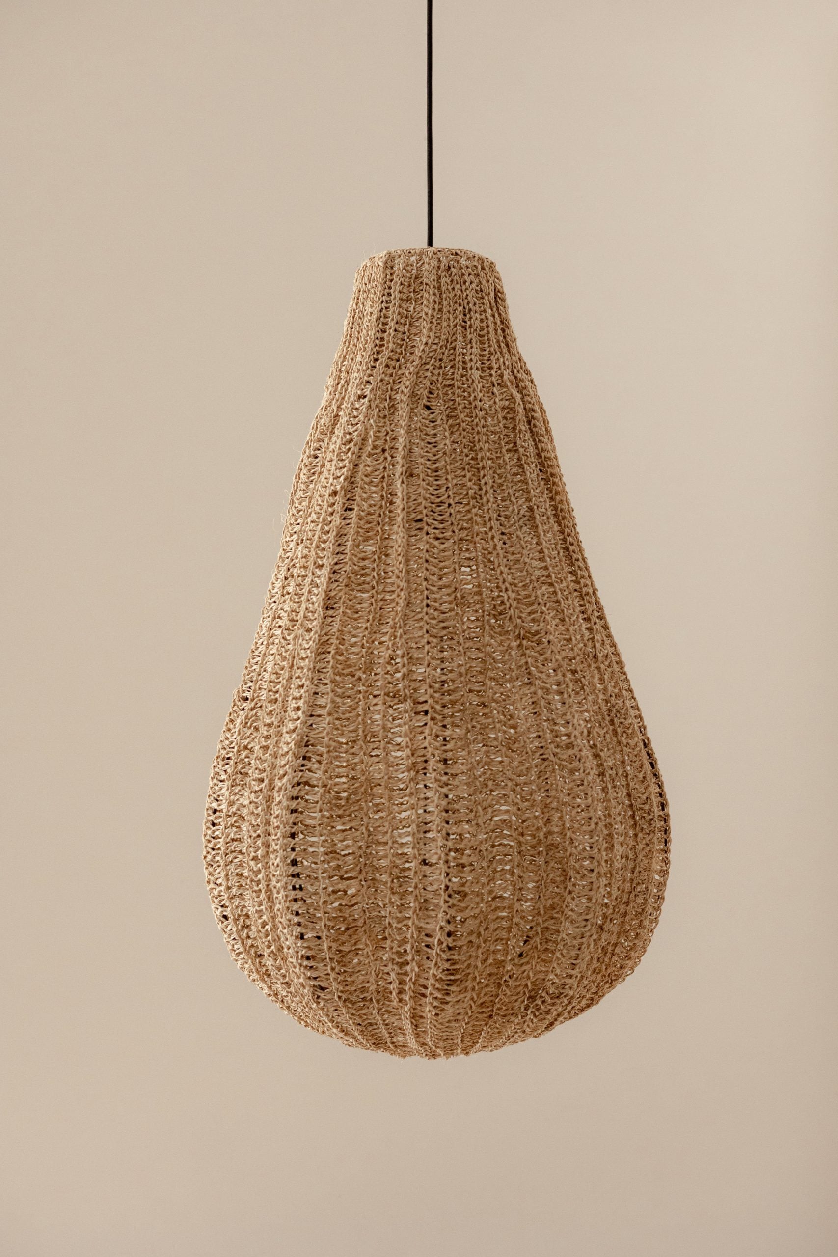 Lámpara de techo elaborada en fibra vegetal natural, tejida a mano por artesanos en forma de gota.