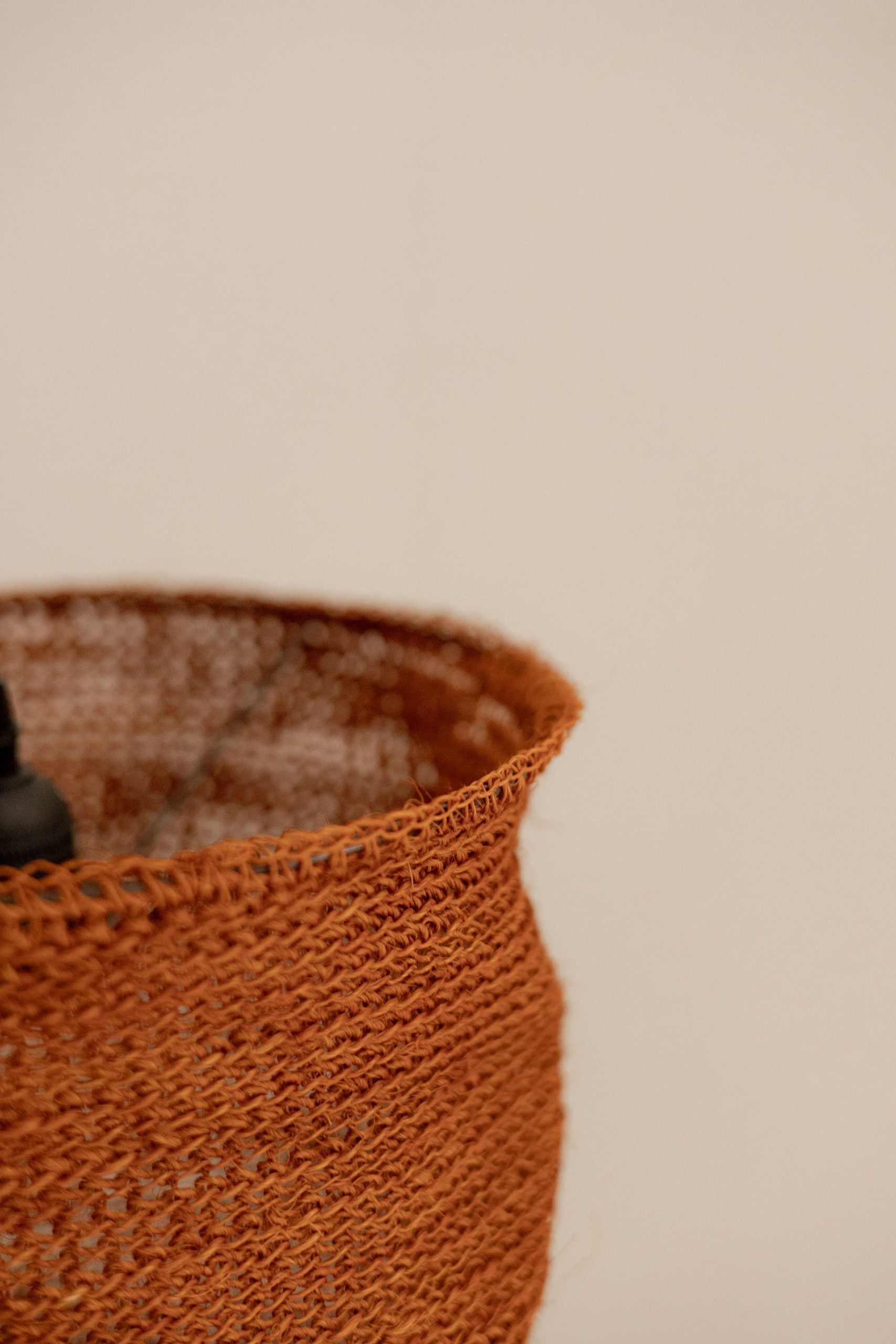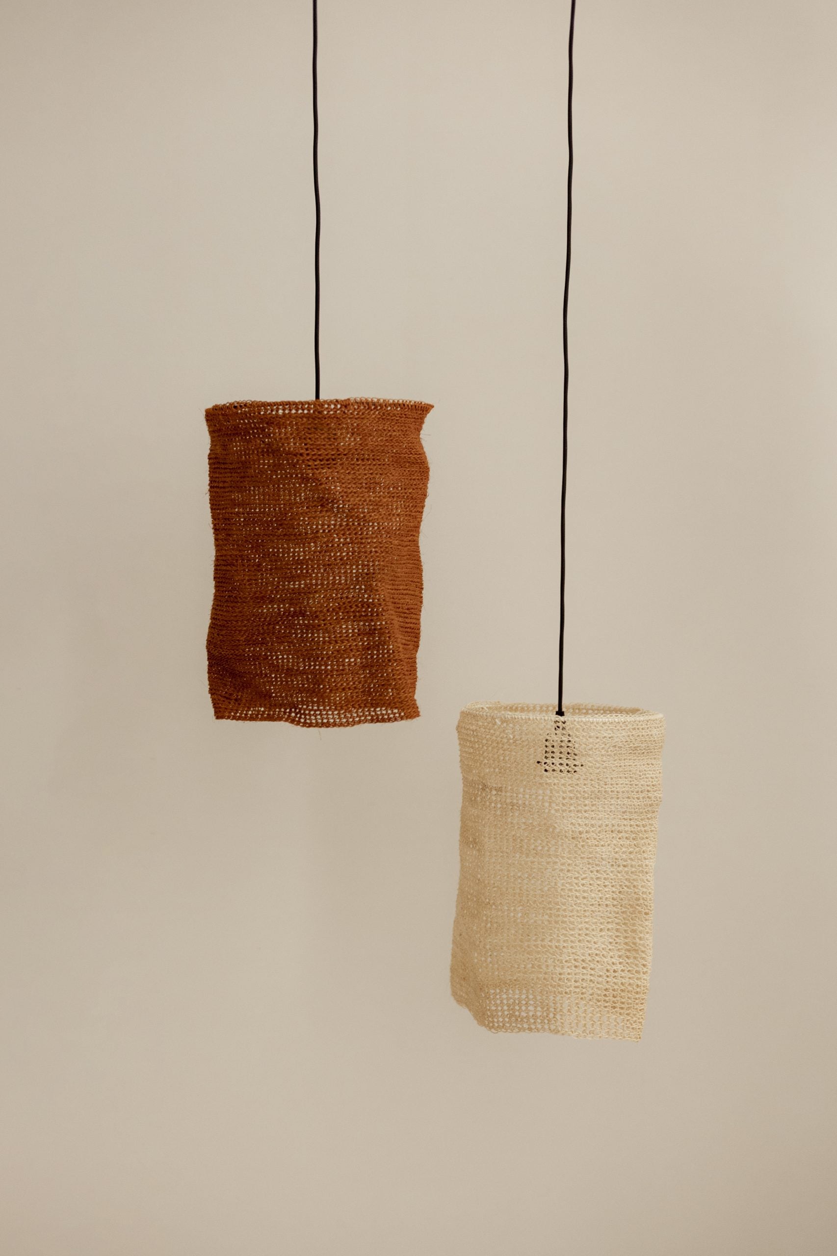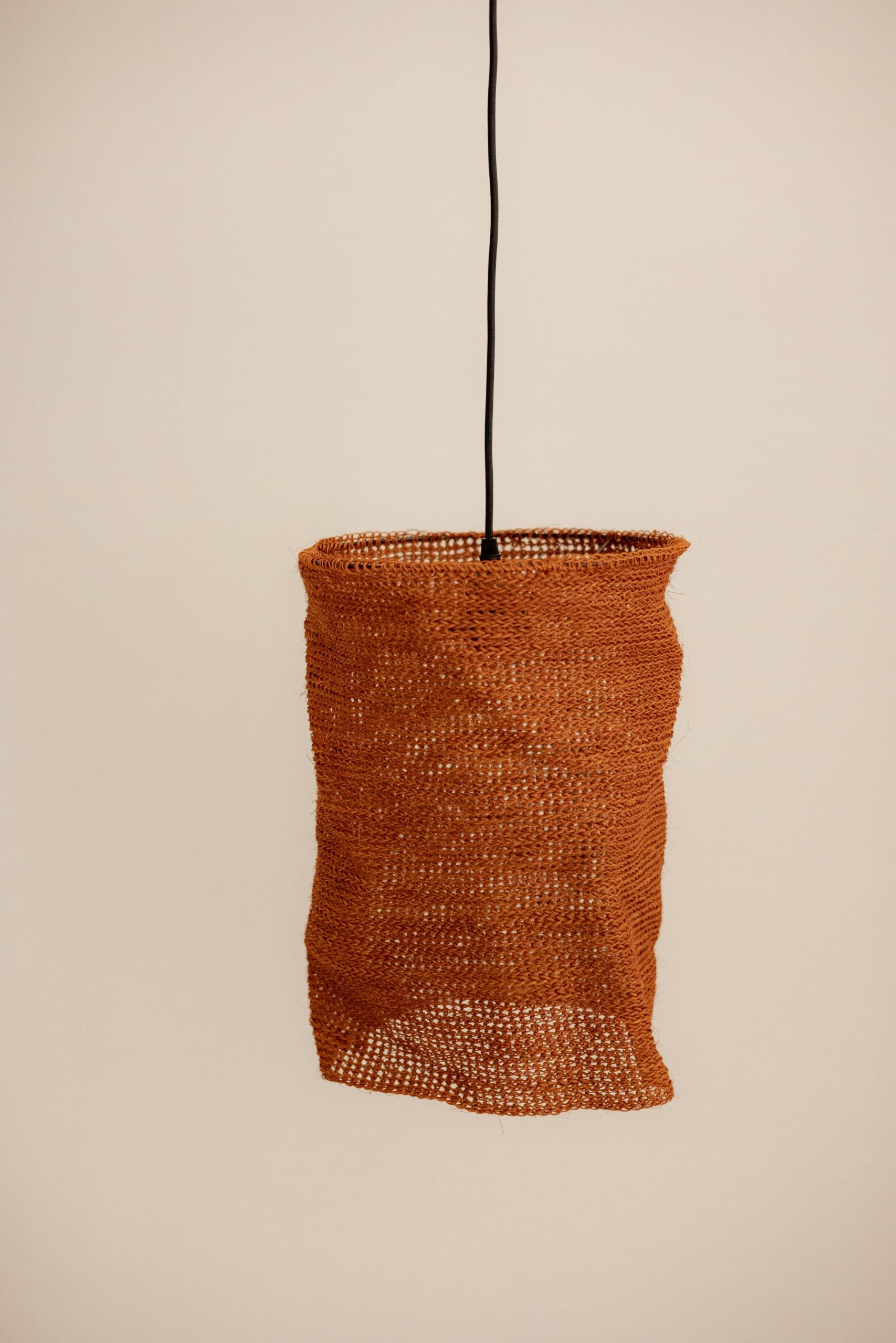 Lámpara de techo elaborada en fibra vegetal natural en color cobre, tejida a mano por artesanos con una técnica que genera una leve ondulación en su superficie.