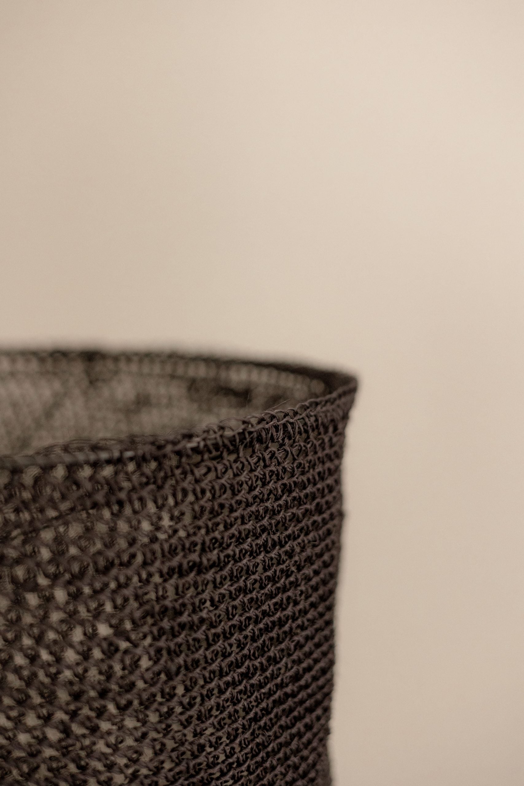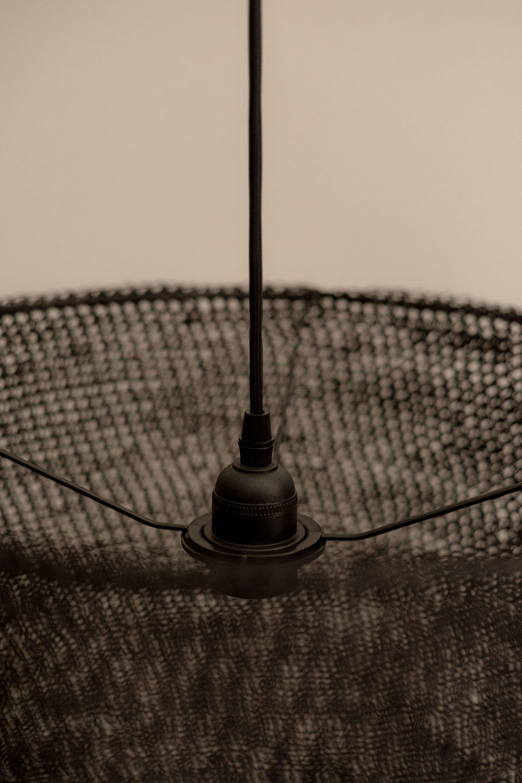 Lámpara de techo elaborada en fibra vegetal natural en color negro, tejida a mano por artesanos con una técnica que genera una leve ondulación en su superficie.