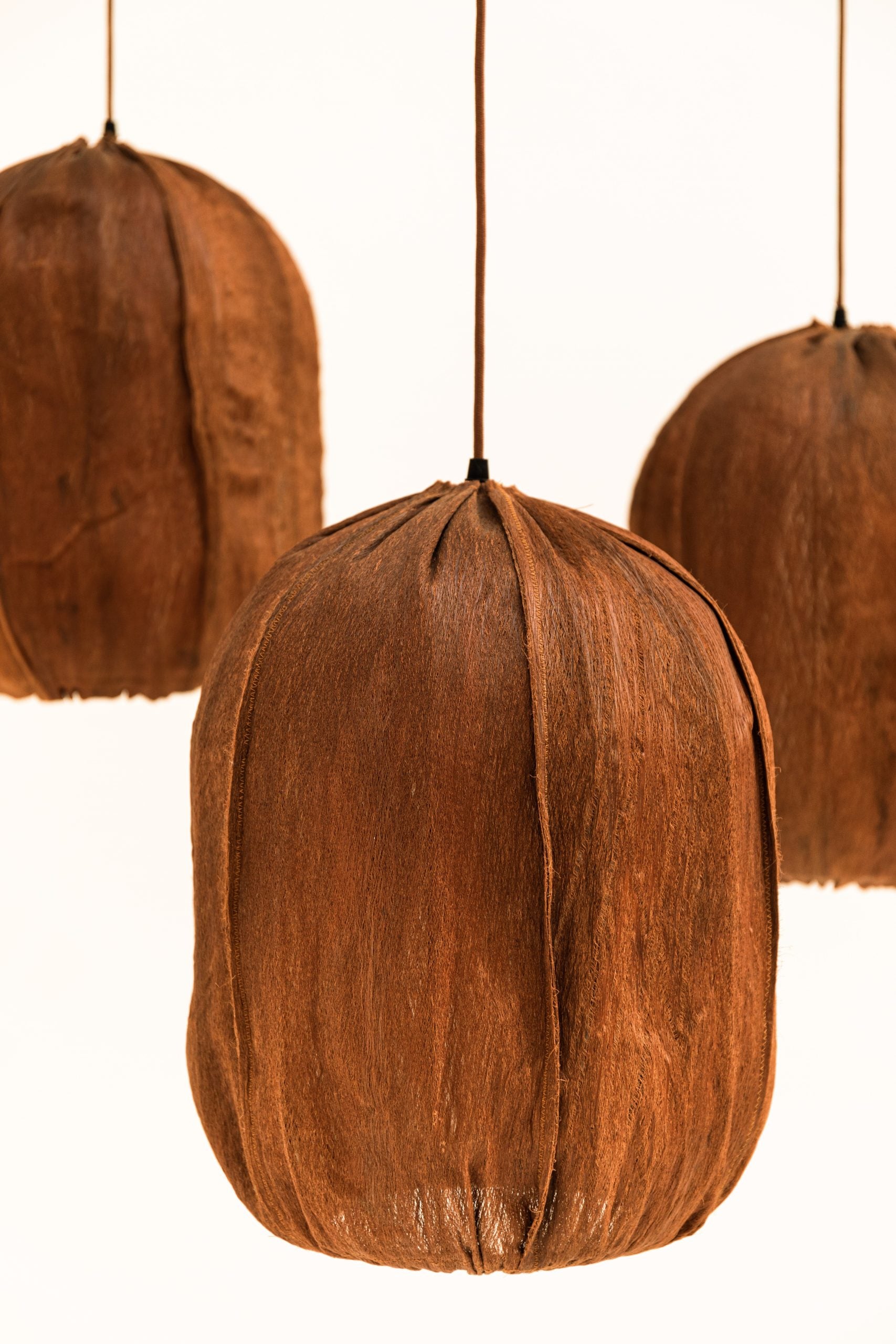 Lámpara de techo en forma de nido, tejida a mano con hoja de palma americana. Su diseño orgánico y envolvente resalta la belleza natural del material, creando una pieza que aporta textura, calidez y un carácter artesanal único al espacio.