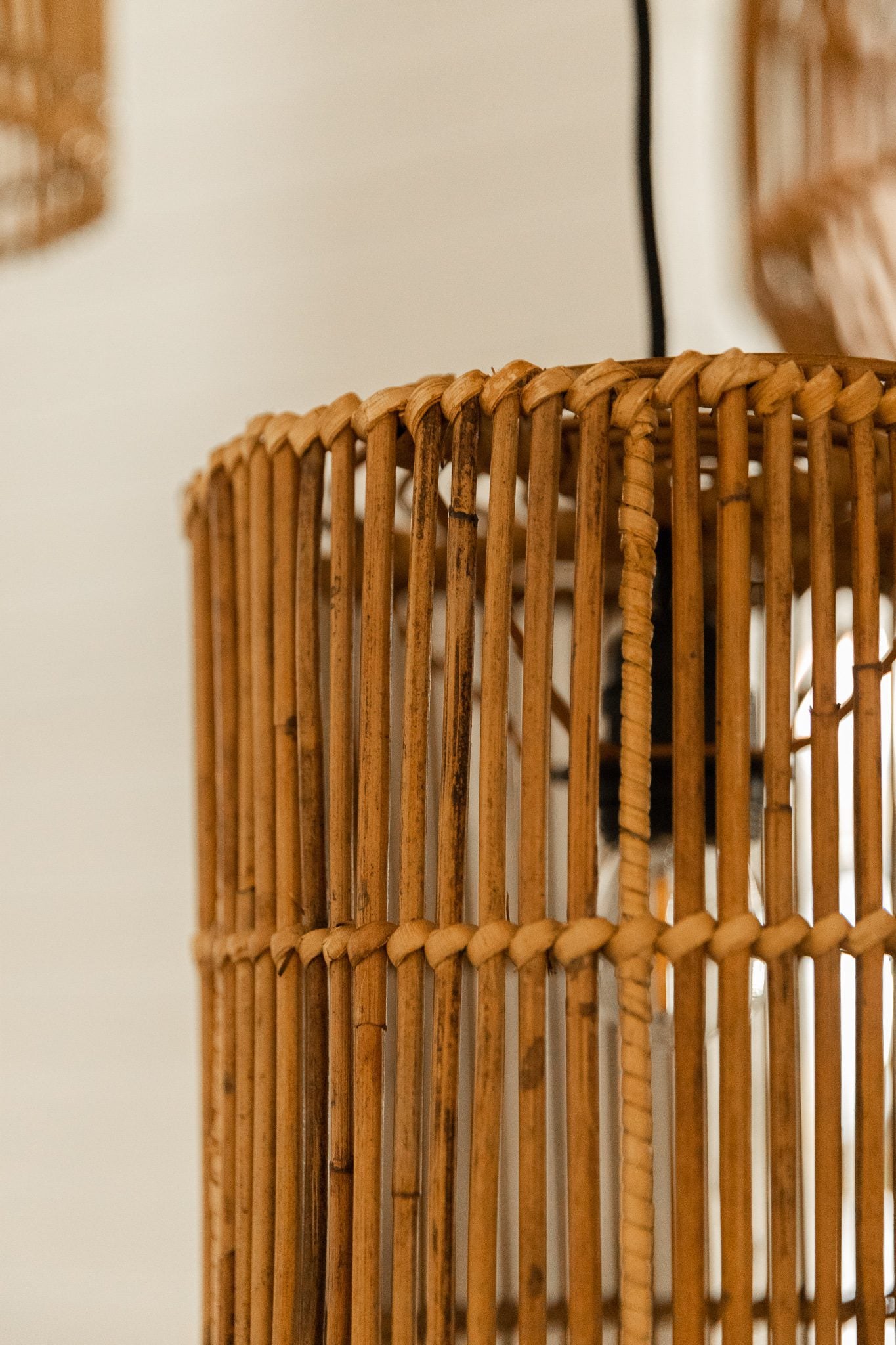 Lámpara de techo de forma cilíndrica, hecha artesanalmente en ratán natural.